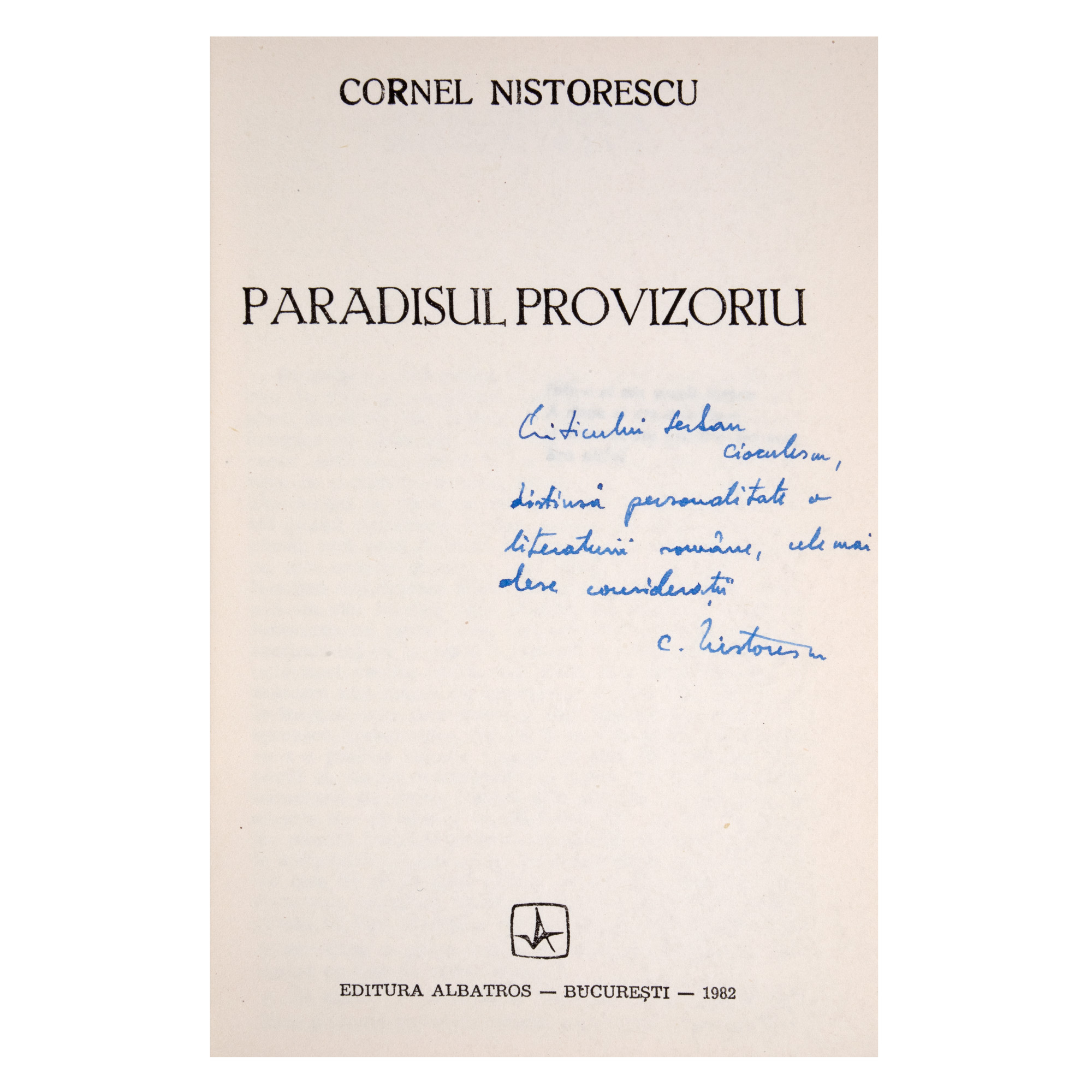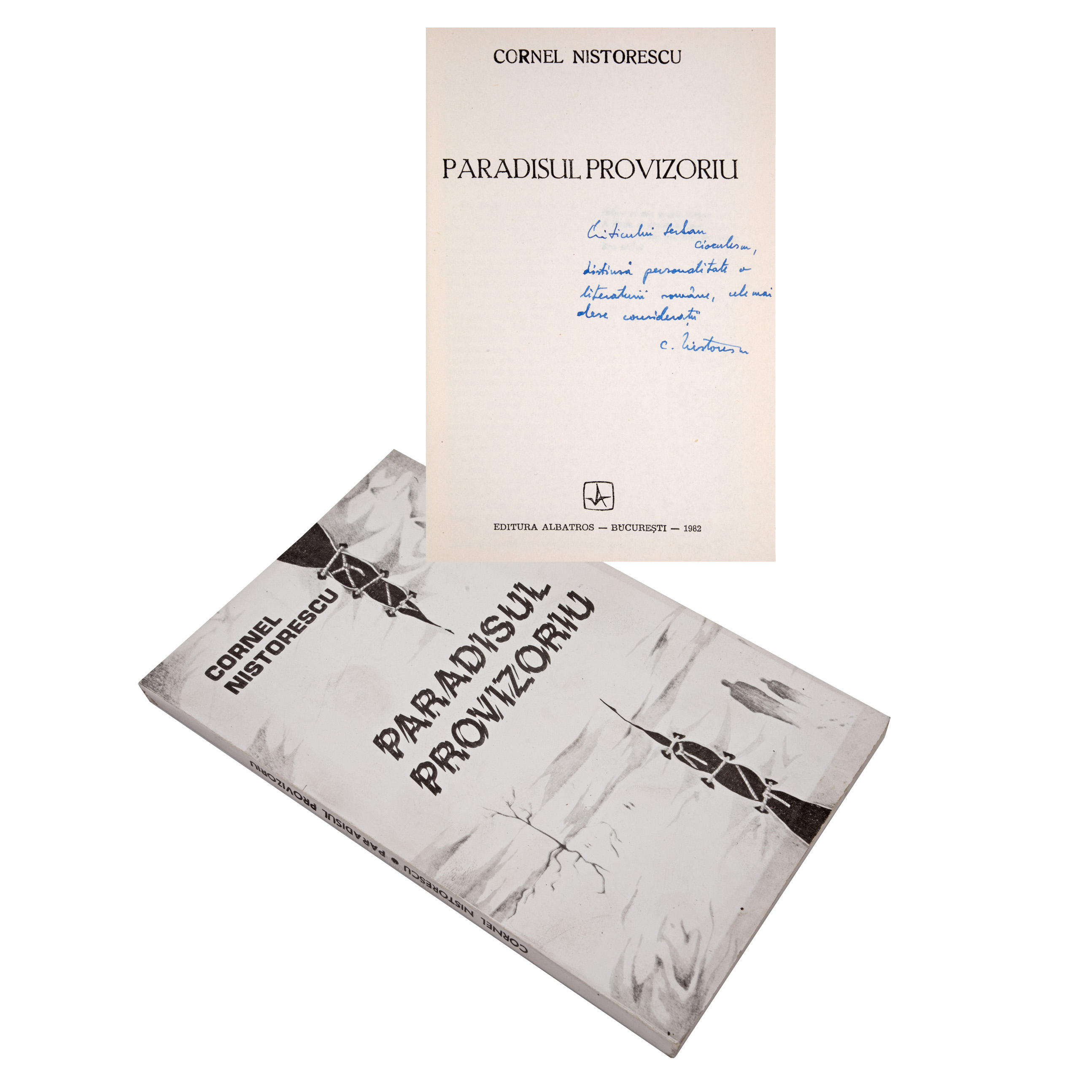45. ”Paradisul provizoriu”, de Cornel Nistorescu, București, 1982, cu dedicația autorului către Șerban Cioculescu, provine din colecția criticului literar Șerban Cioculescu