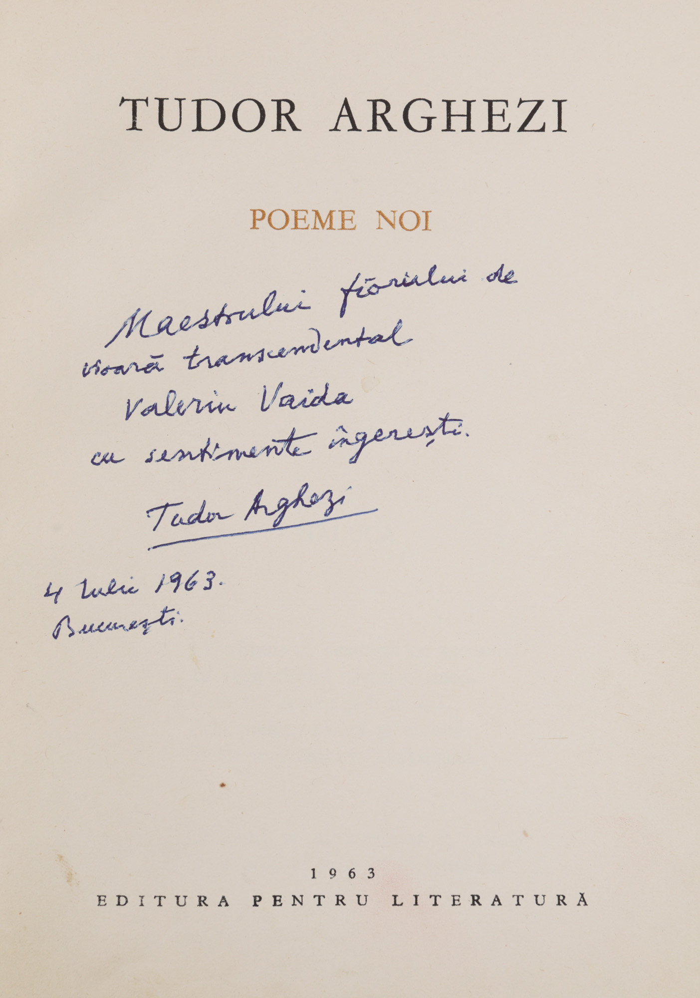 25. "Poeme Noi", de Tudor Arghezi, București, 1963, cu ex-libris al scriitorului Valeriu Vaida și dedicația olografă a autorului