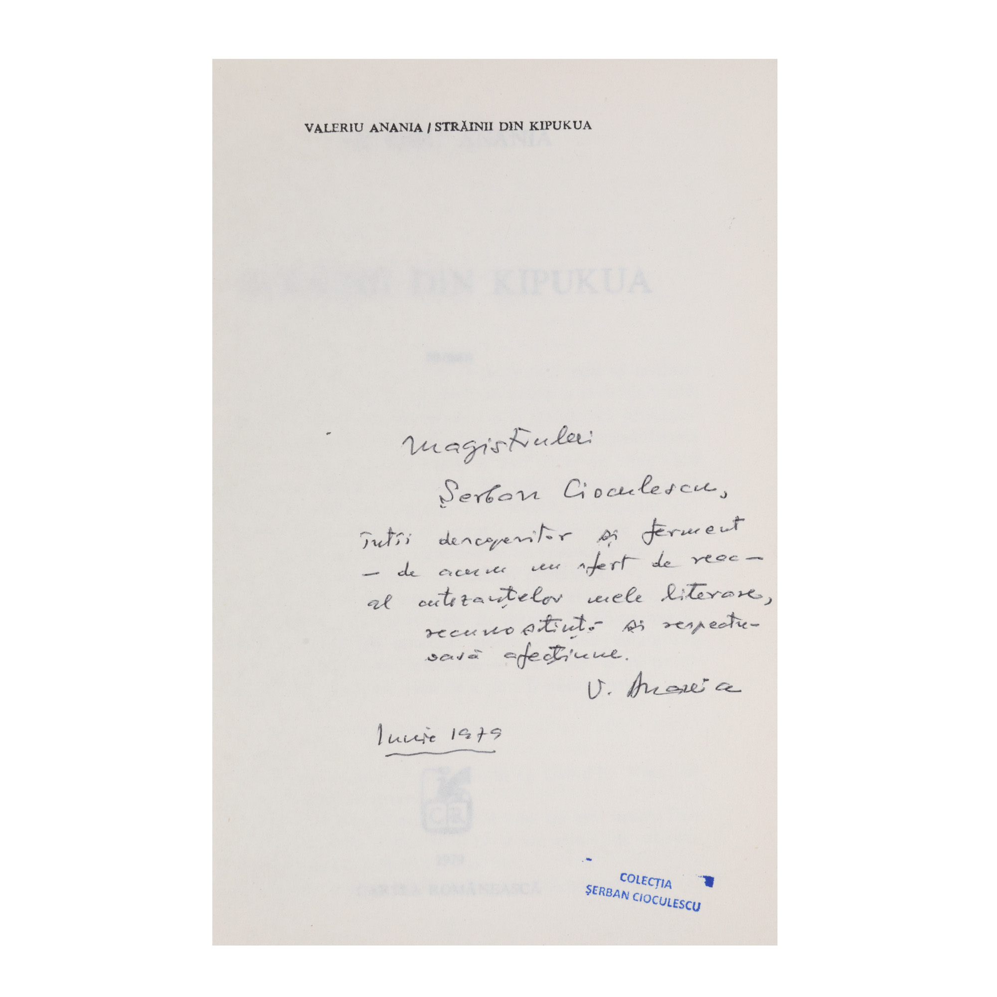 38. ”Străinii din Kipukua”, de Valeriu Anania, București, 1979, cu dedicația autorului către Șerban Cioculescu, provine din colecția criticului literar Șerban Cioculescu