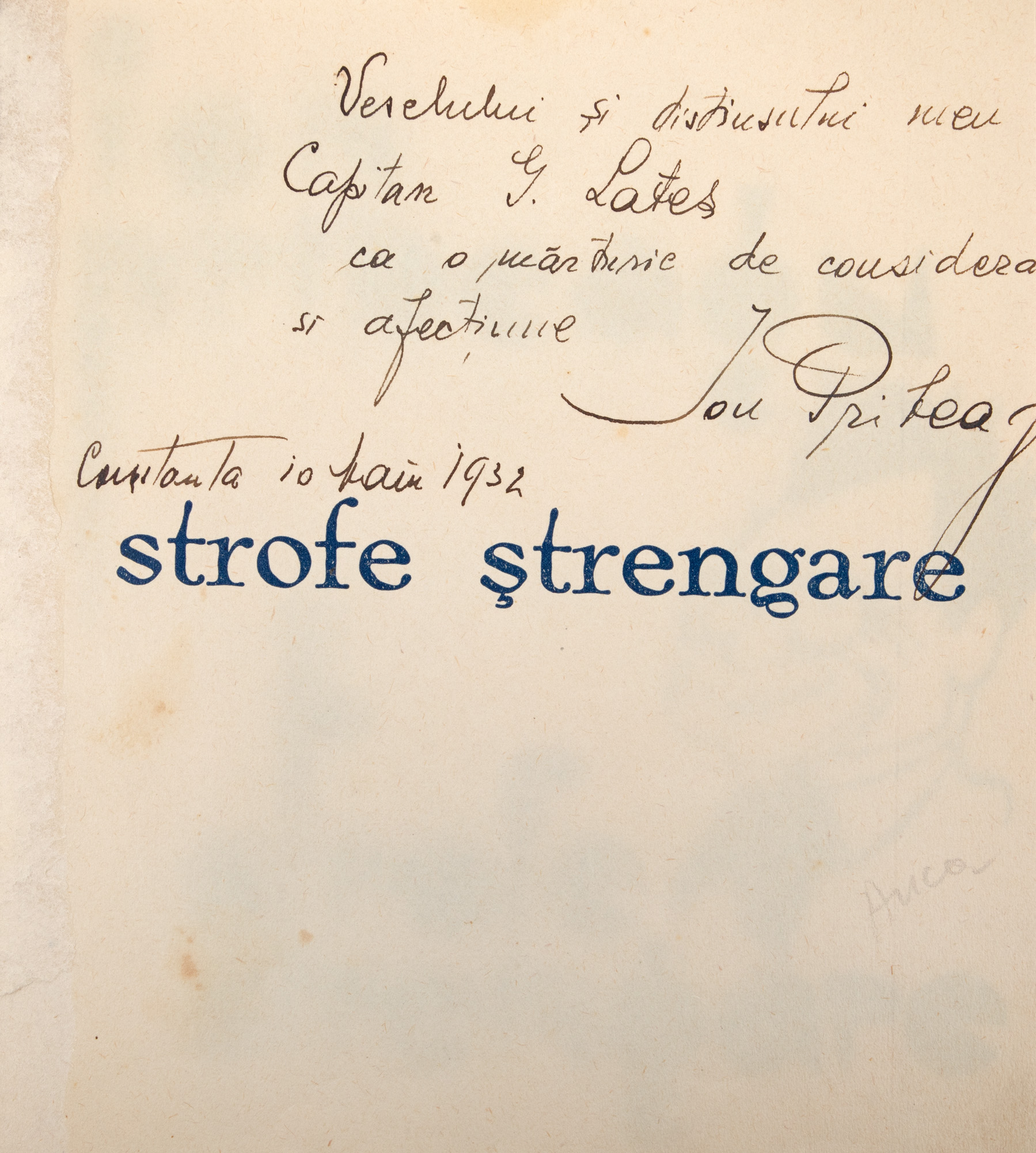 31. ”Strofe ștrengare”, de Ion Pribeagu, București, 1930, cu dedicația și semnătura olografă a autorului