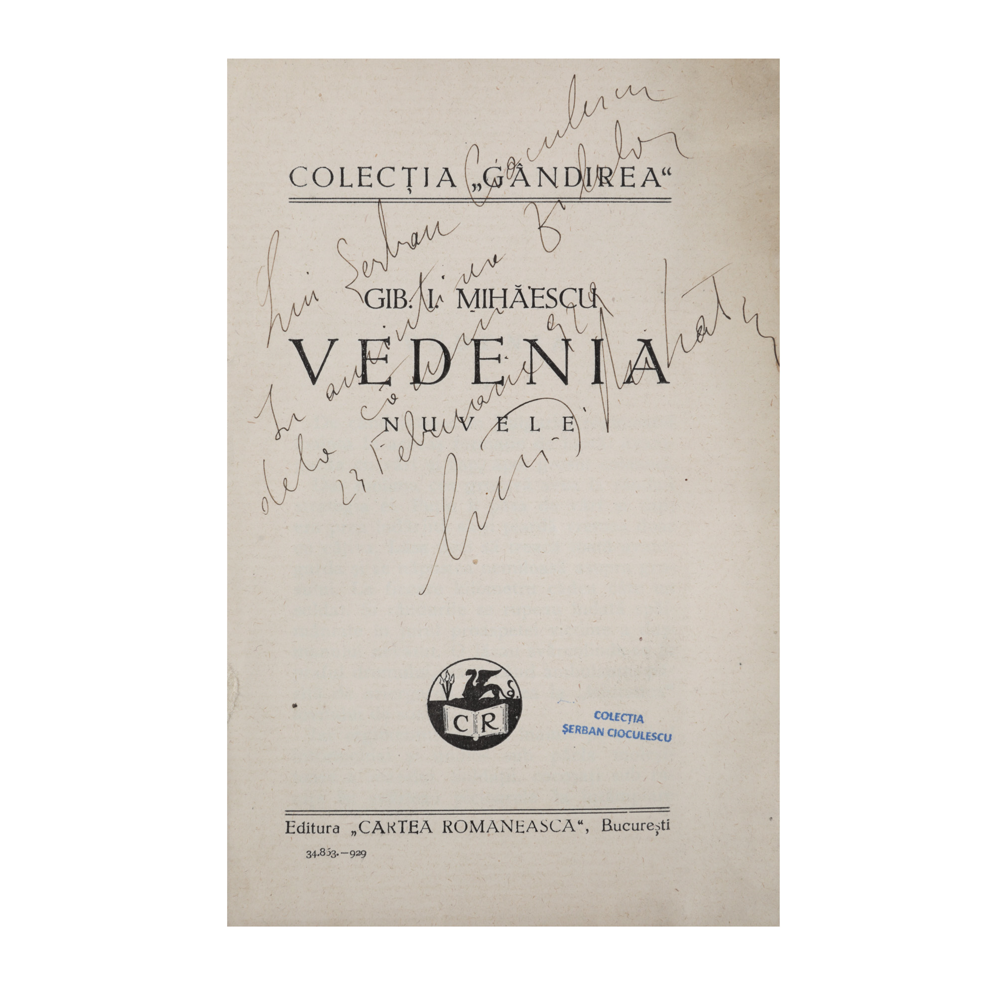 26. ”Vedenia”, de Gib. I. Mihăescu, București, 1929, cu dedicația autorului către Șerban Cioculescu, provine din colecția criticului literar Șerban Cioculescu