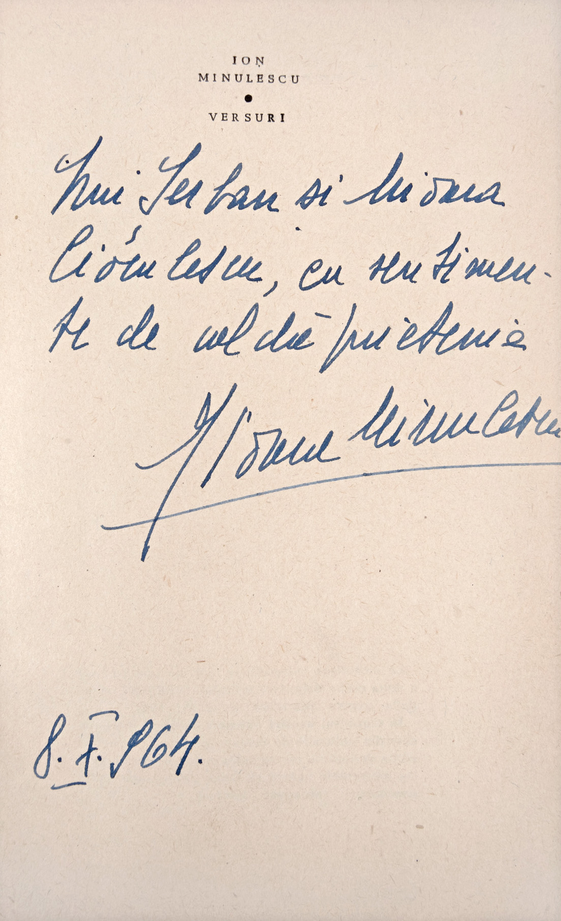 20. ”Versuri”, de Ion Minulescu, București, 1964, cu dedicația fiicei lui Minulescu către Șerban Cioculescu, provine din colecția criticului literar Șerban Cioculescu