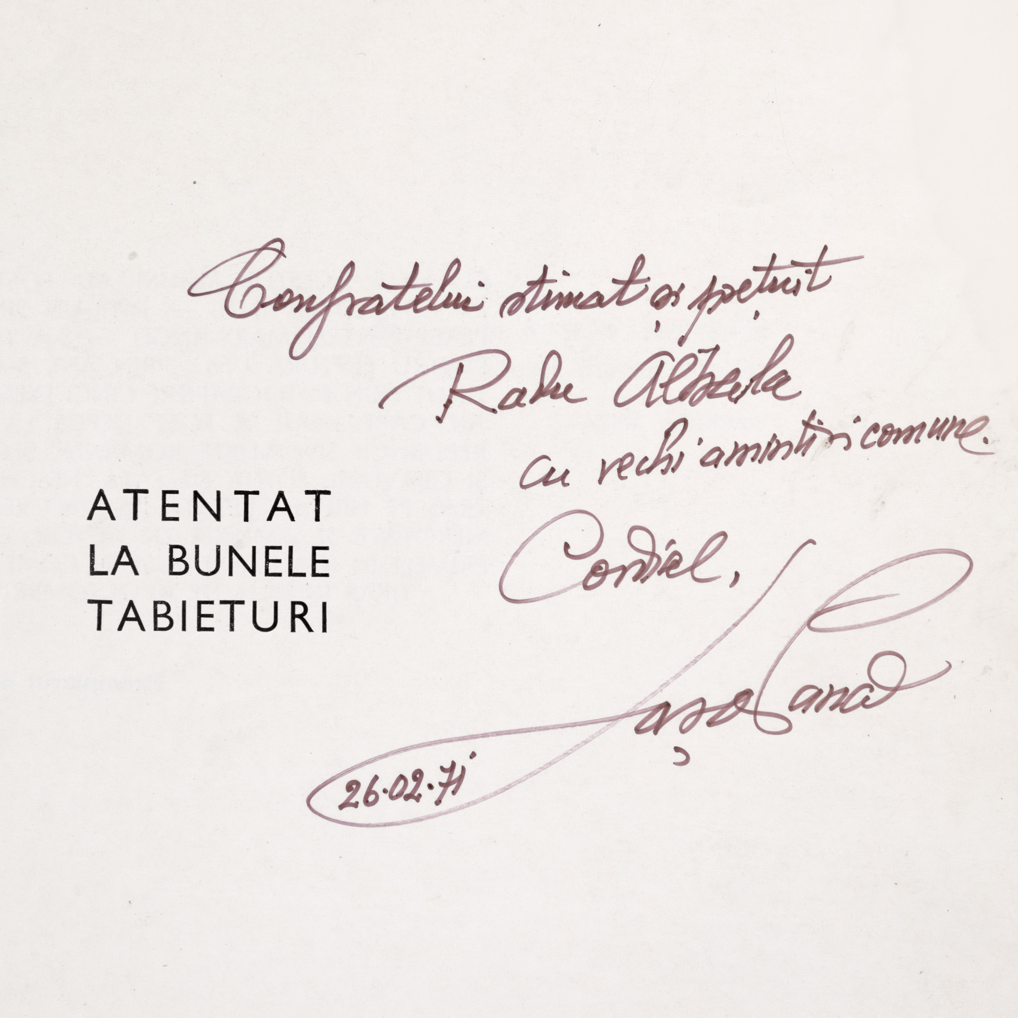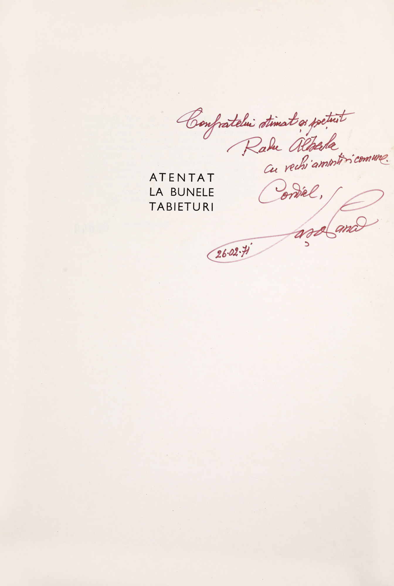 5. "Atentat la bunele tabieturi", de Sașa Pană, București, 1970, cu dedicația autorului către scriitorul Radu Albala, exemplar 49/299