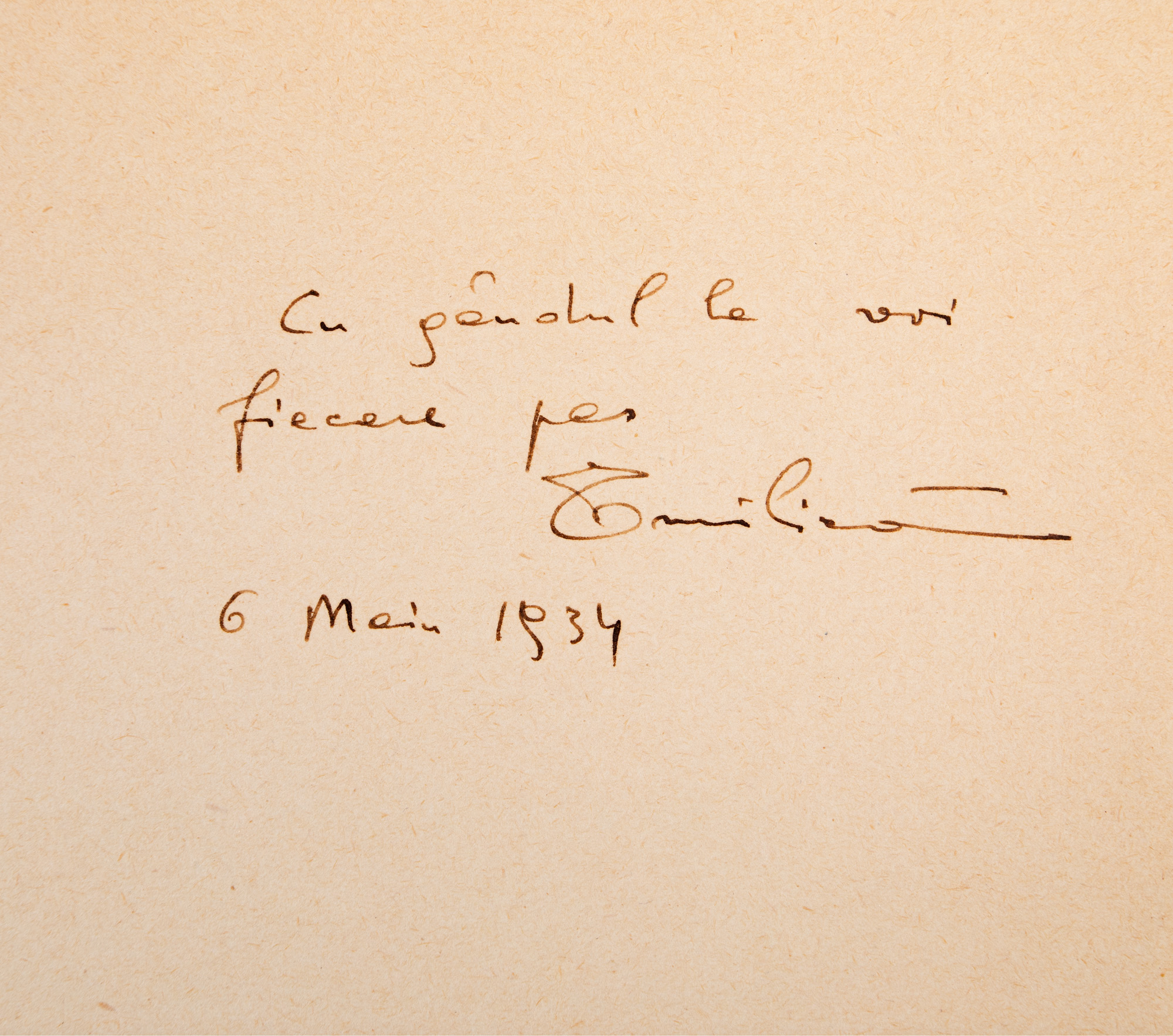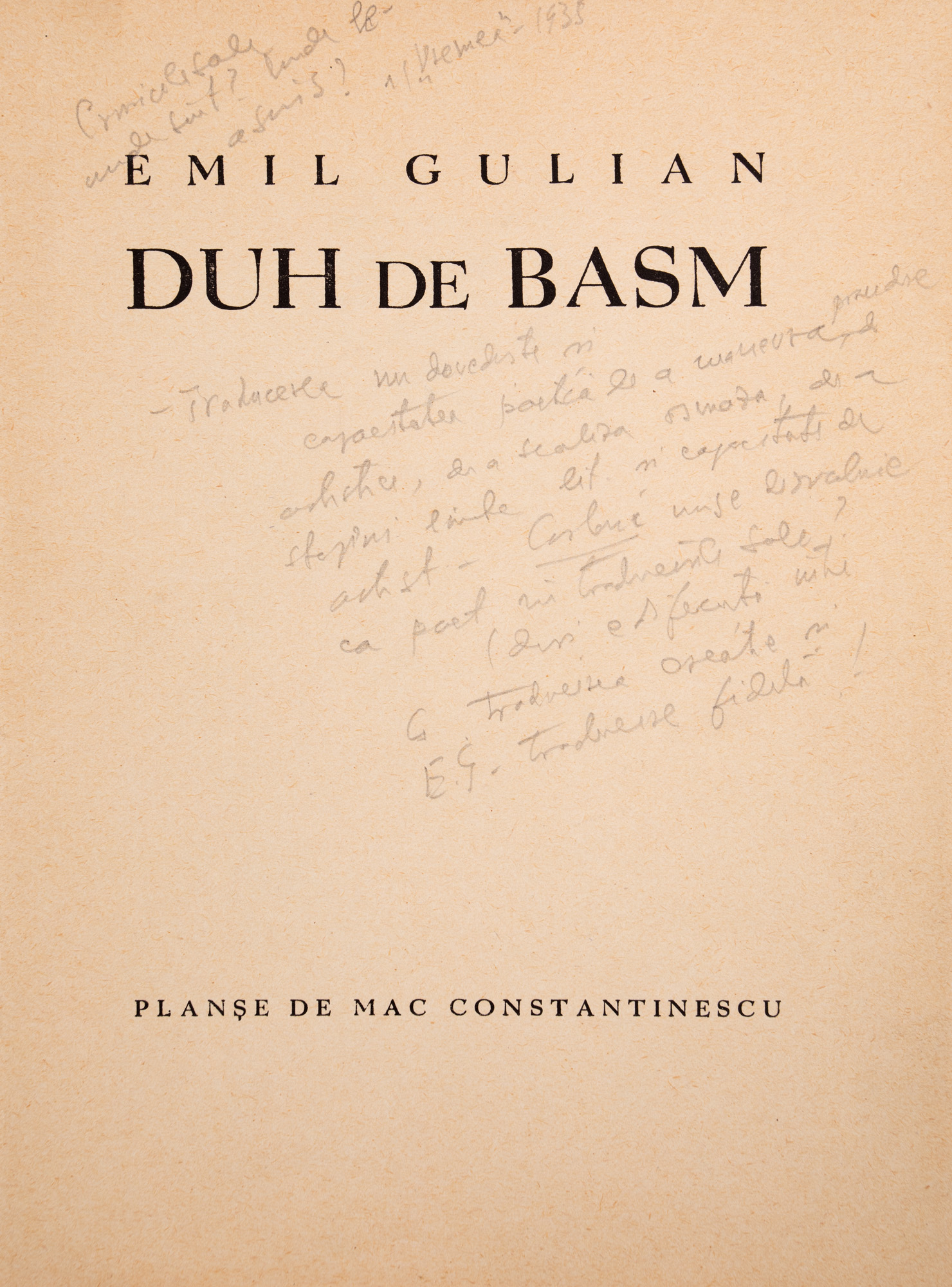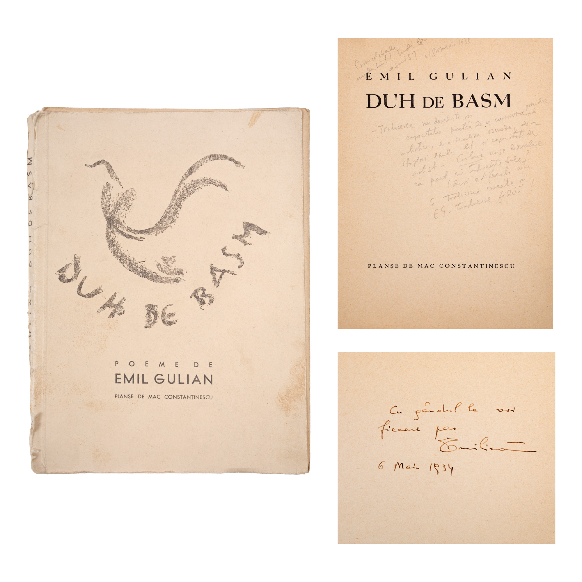44. ”Duh de basm”, de Emil Gulian, cu planșe de Mac Constantinescu, ediție bibliofilă, București, 1934, cu dedicația și semnătura olografă a autorului (exemplar numerotat 1 din 100)