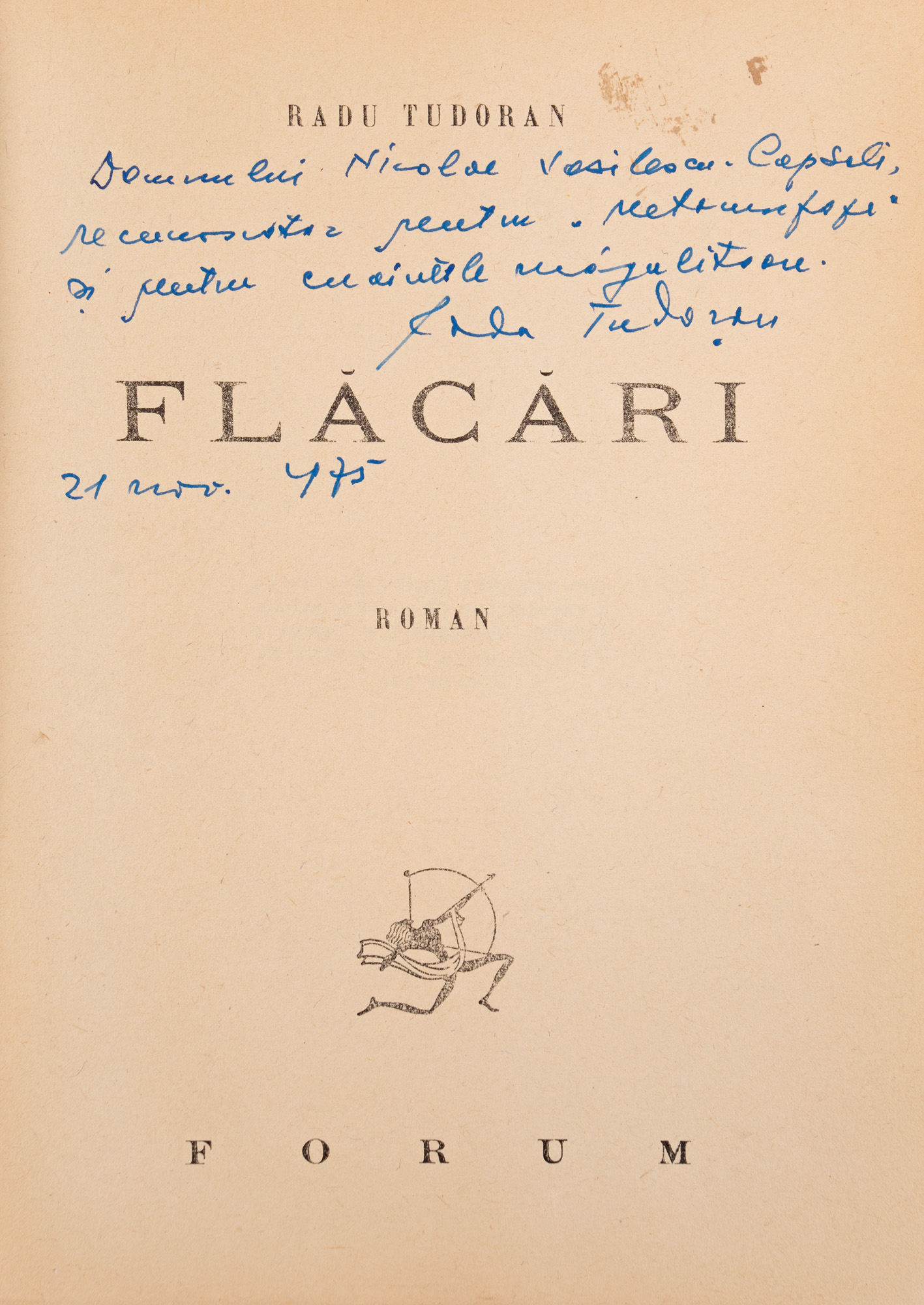 28. "Flăcări", de Radu Tudoran, București, 1945, cu semnătura olografă și dedicația autorului