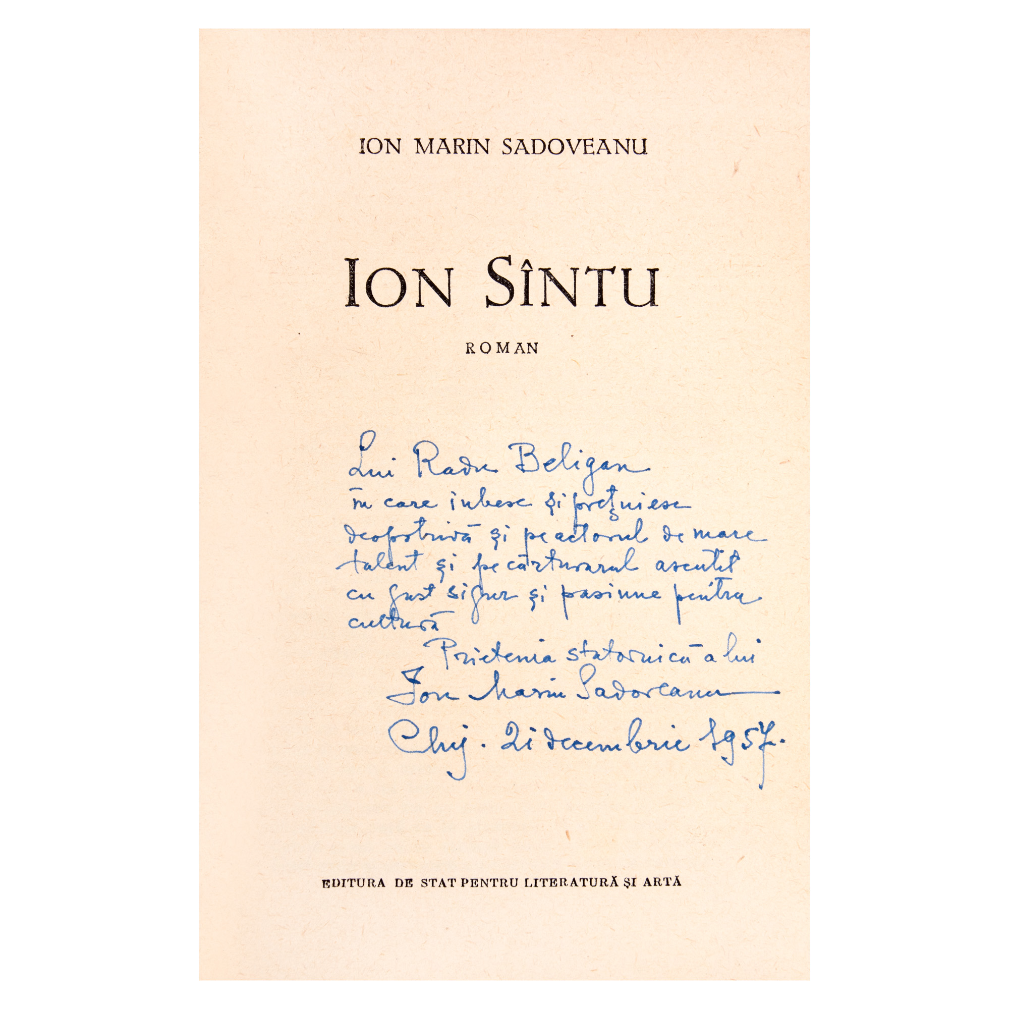 15. "Ion Sîntu", de Ion Marin Sadoveanu, București, 1957, cu dedicația olografă a autorului către Radu Beligan
