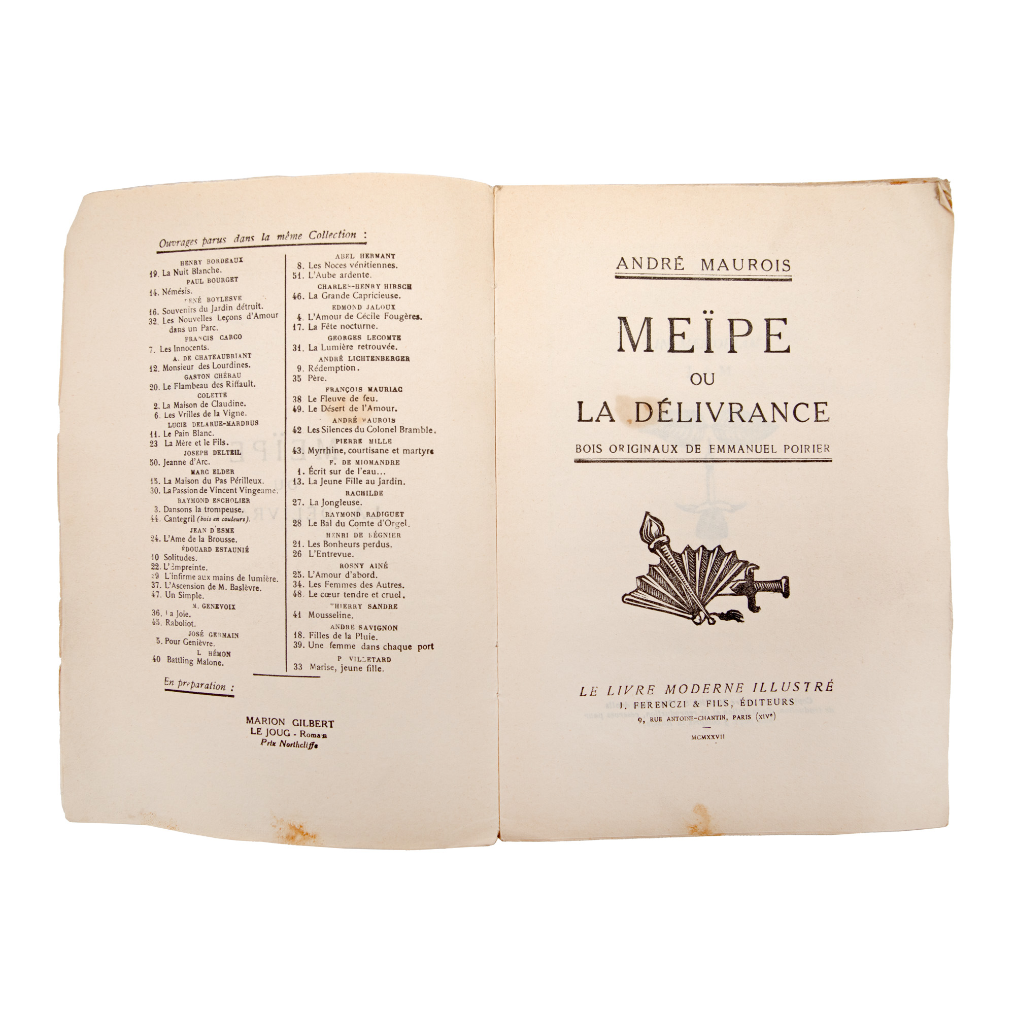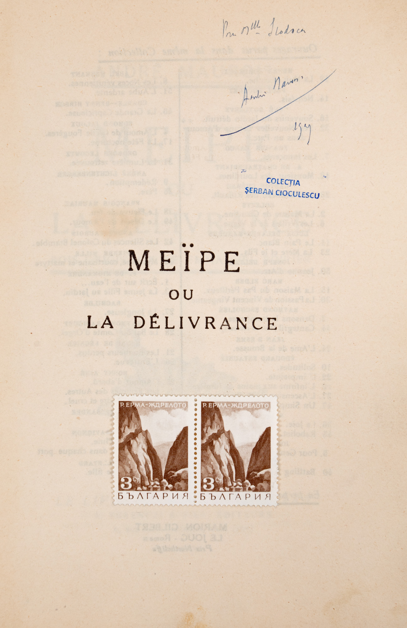 7. ”Meipe ou la delivrance”, de André Maurois, Paris, 1928, cu dedicația olografă a autorului, provine din colecția criticului literar Șerban Cioculescu