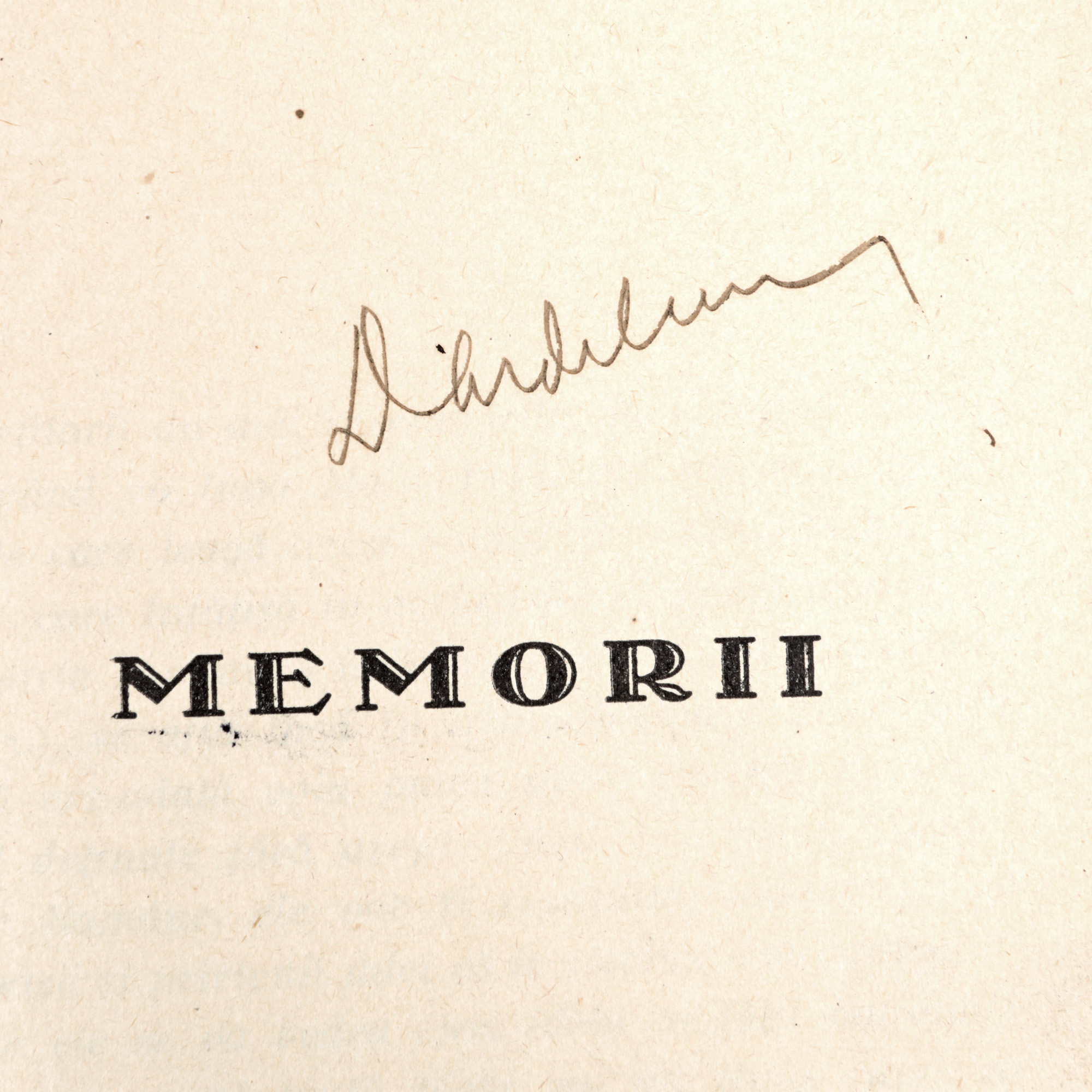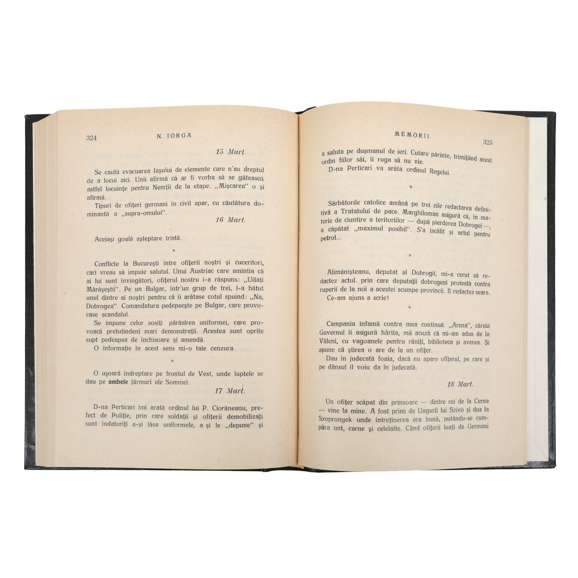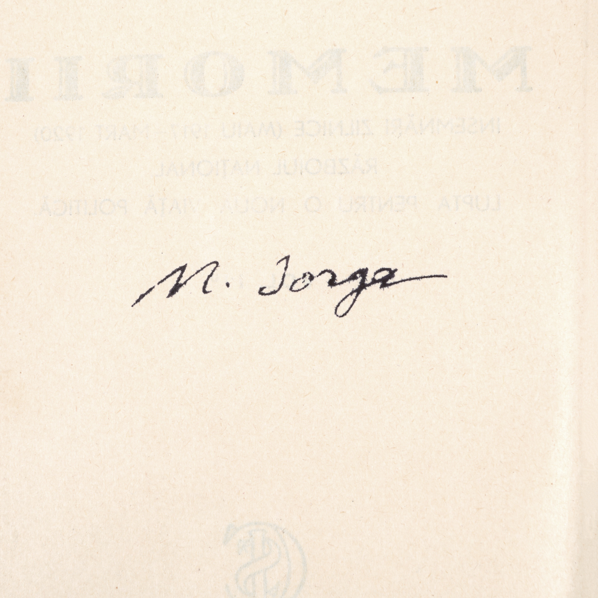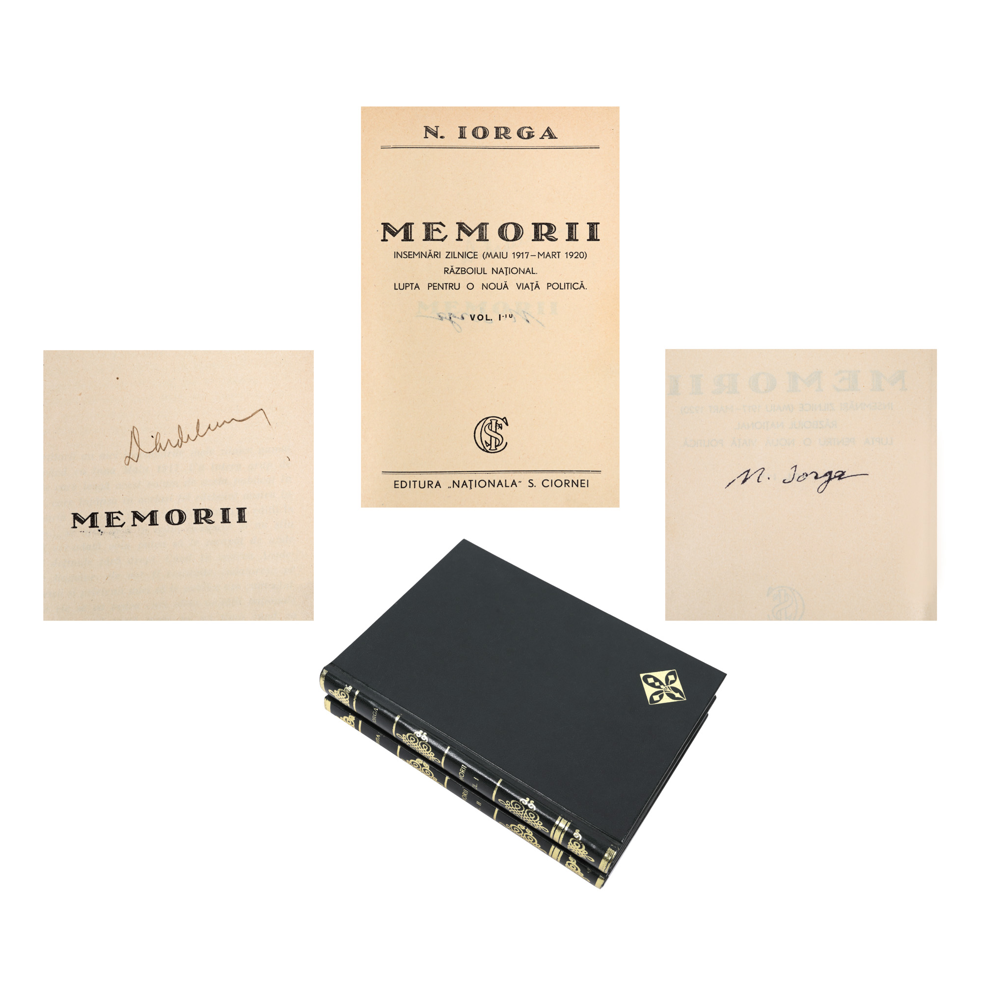 46. "Memorii", de Nicolae Iorga, două volume, București, primul volum cu semnătura olografă a istoricului