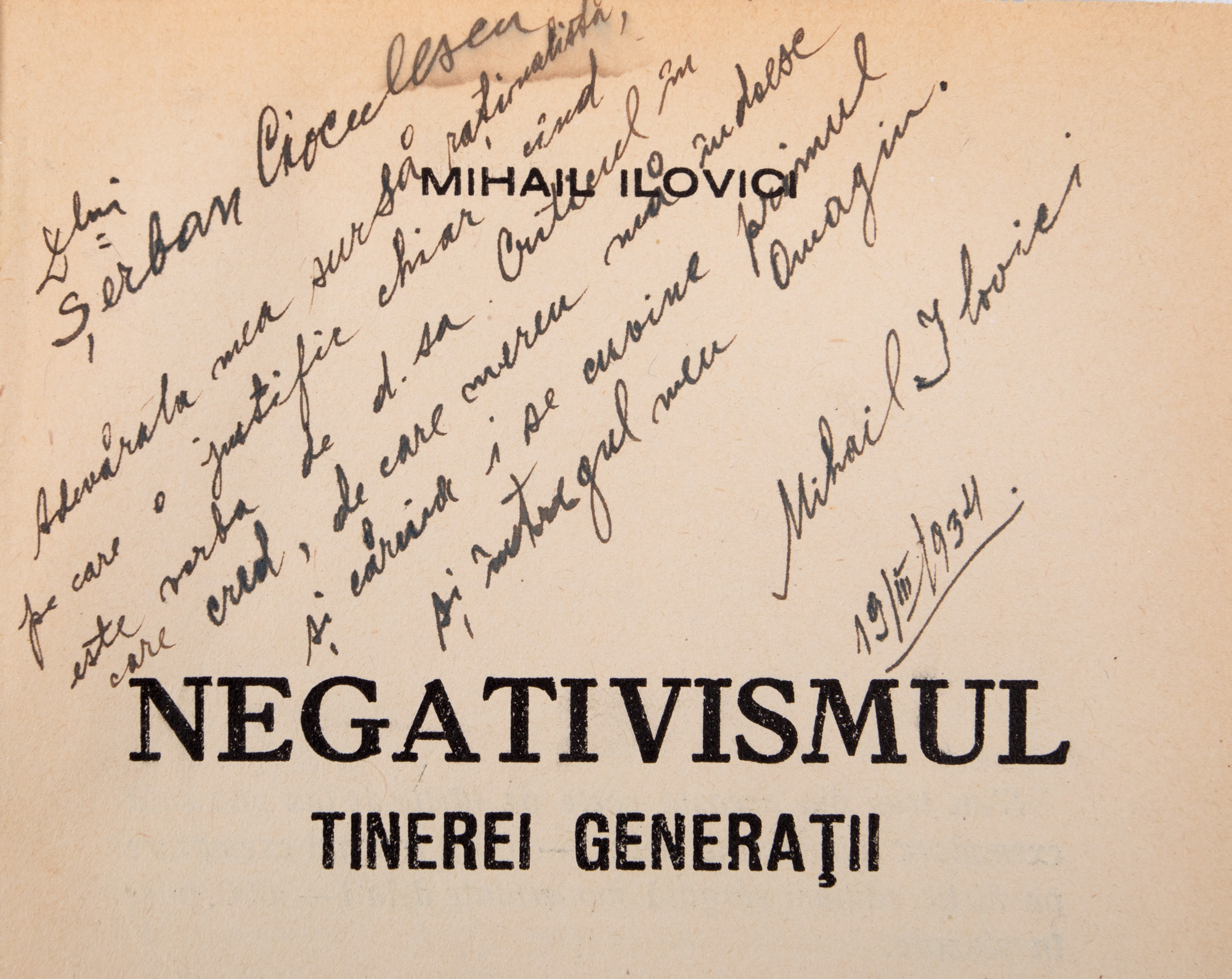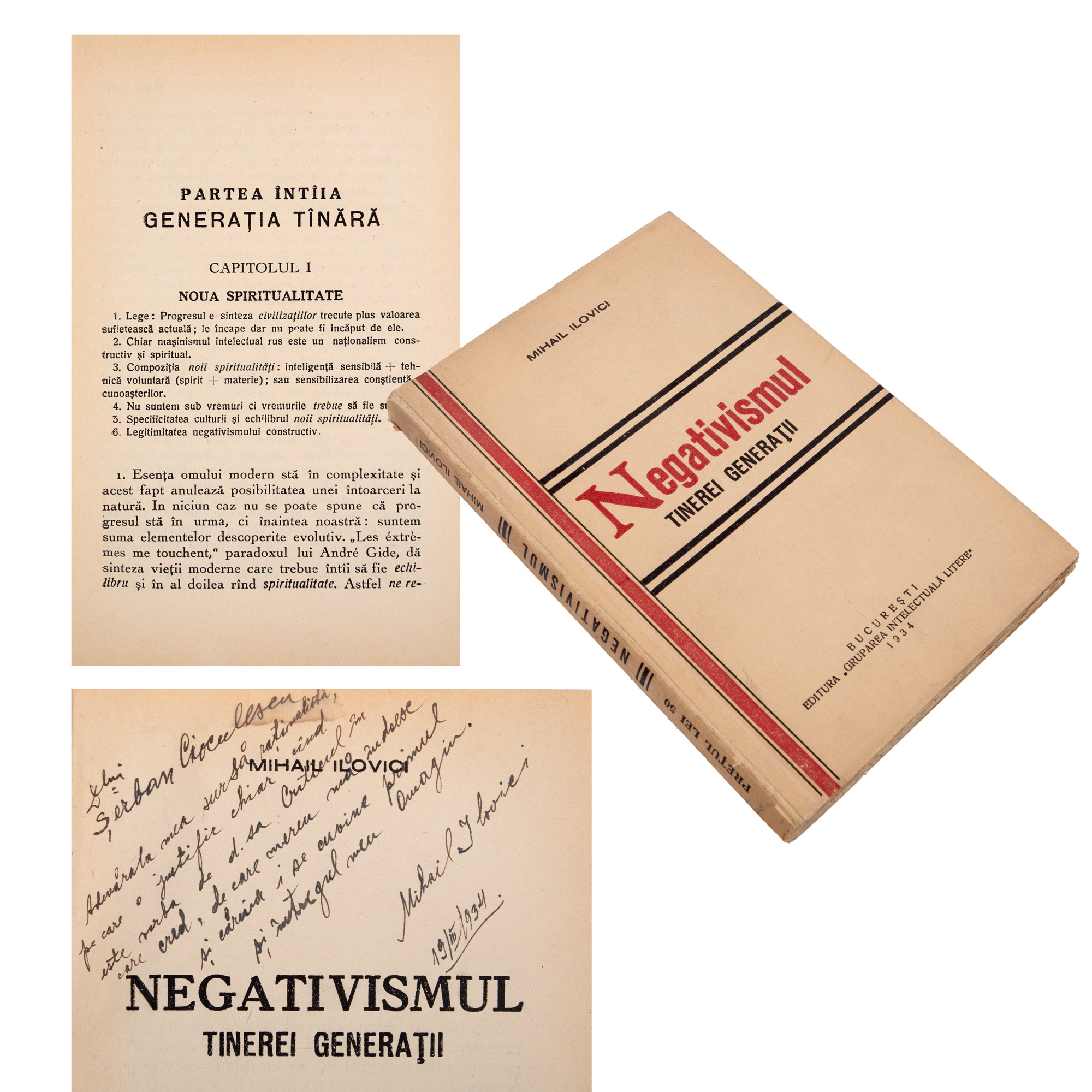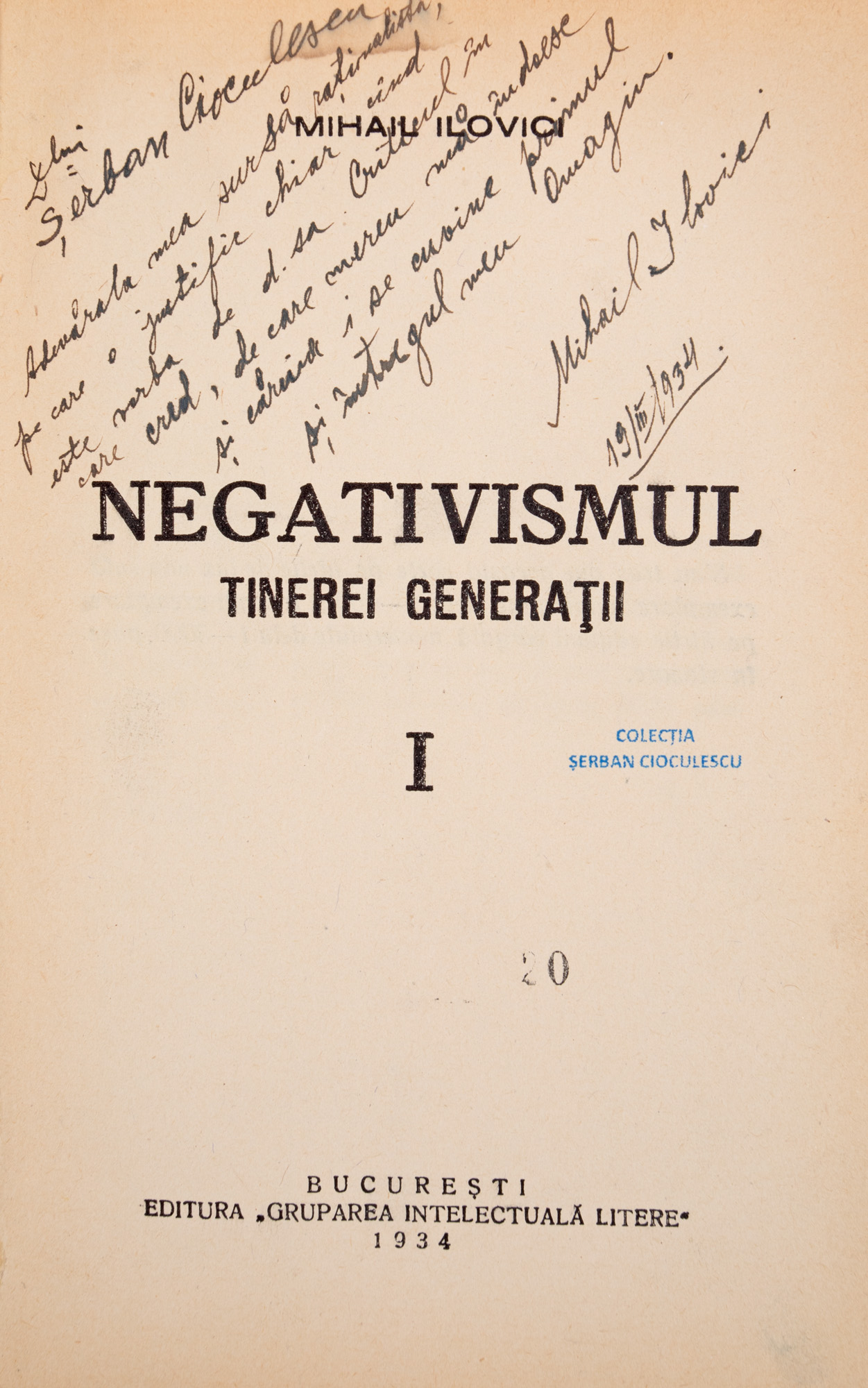 39. ”Negativismul tinerei generații”, de Mihail Ilovici, București, 1934, cu dedicația autorului către Șerban Cioculescu, provine din colecția criticului literar Șerban Cioculescu