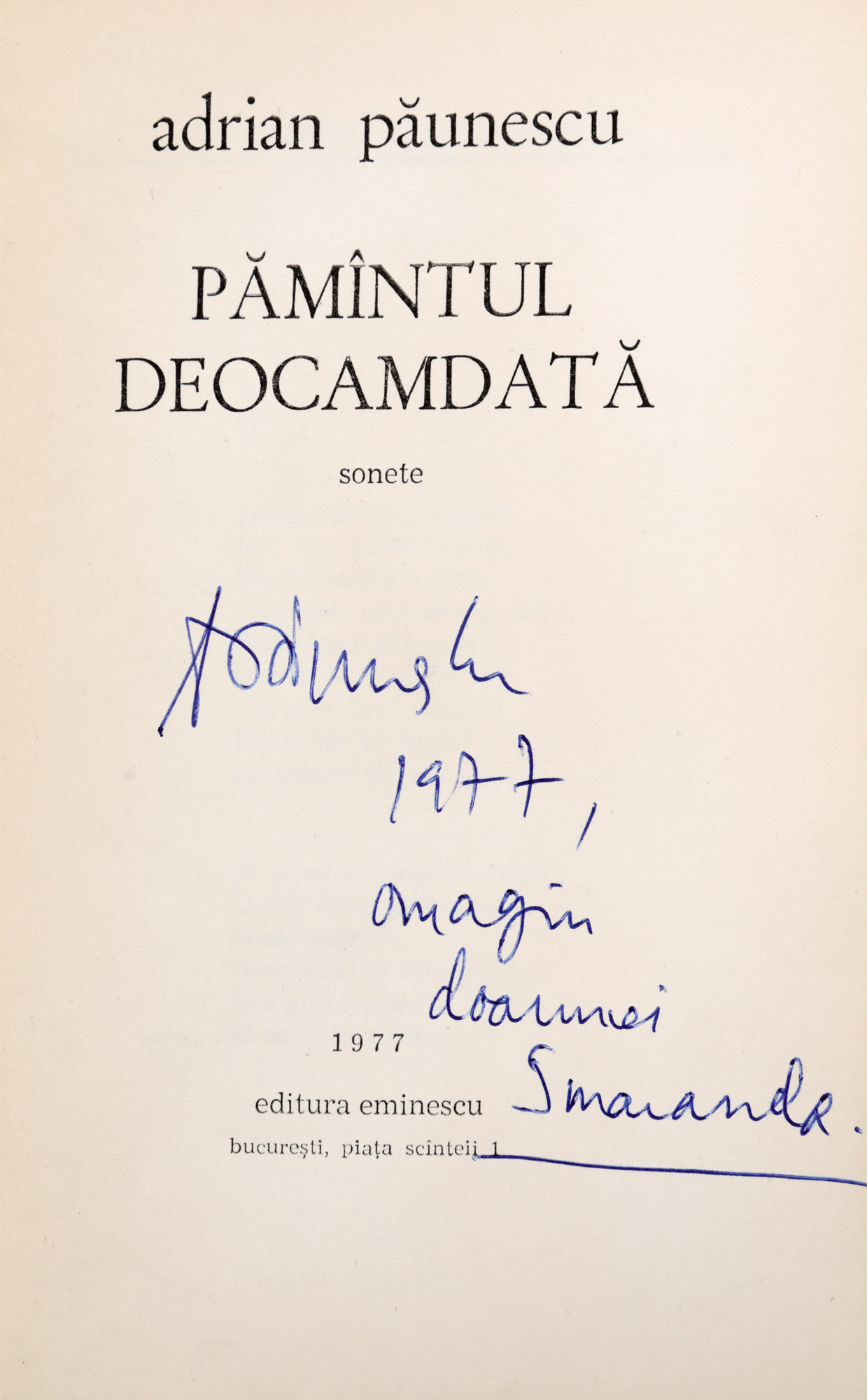 2. "Pământul deocamdată", de Adrian Păunescu, București, 1977, cu dedicația autorului
