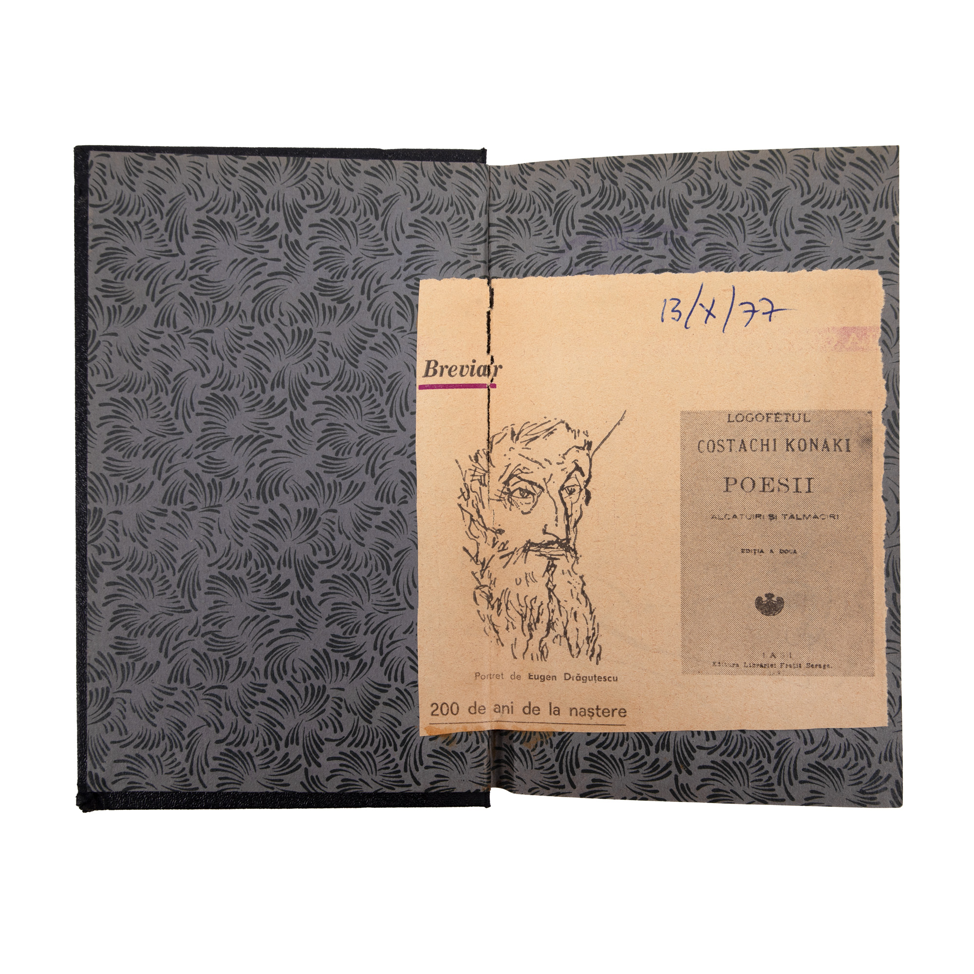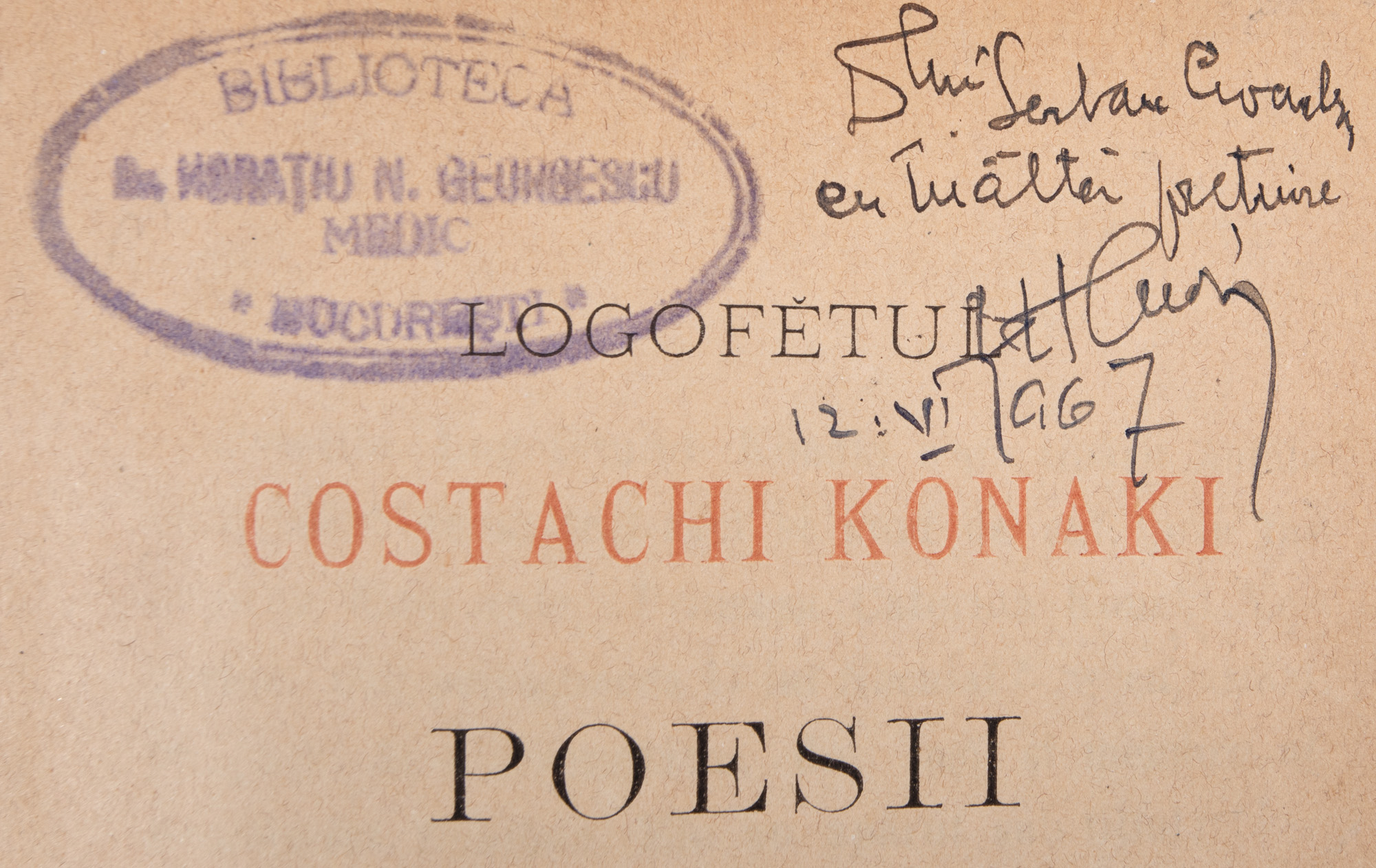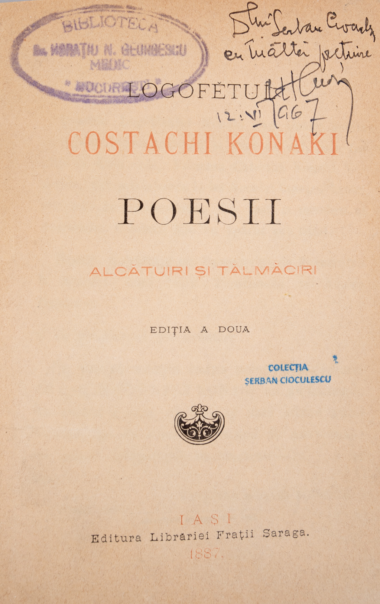 36. ”Poesii”, de logofăt Costachi Konaki, Iași, 1887, cu o dedicație olografă către Șerban Cioculescu, provine din colecția criticului literar Șerban Cioculescu