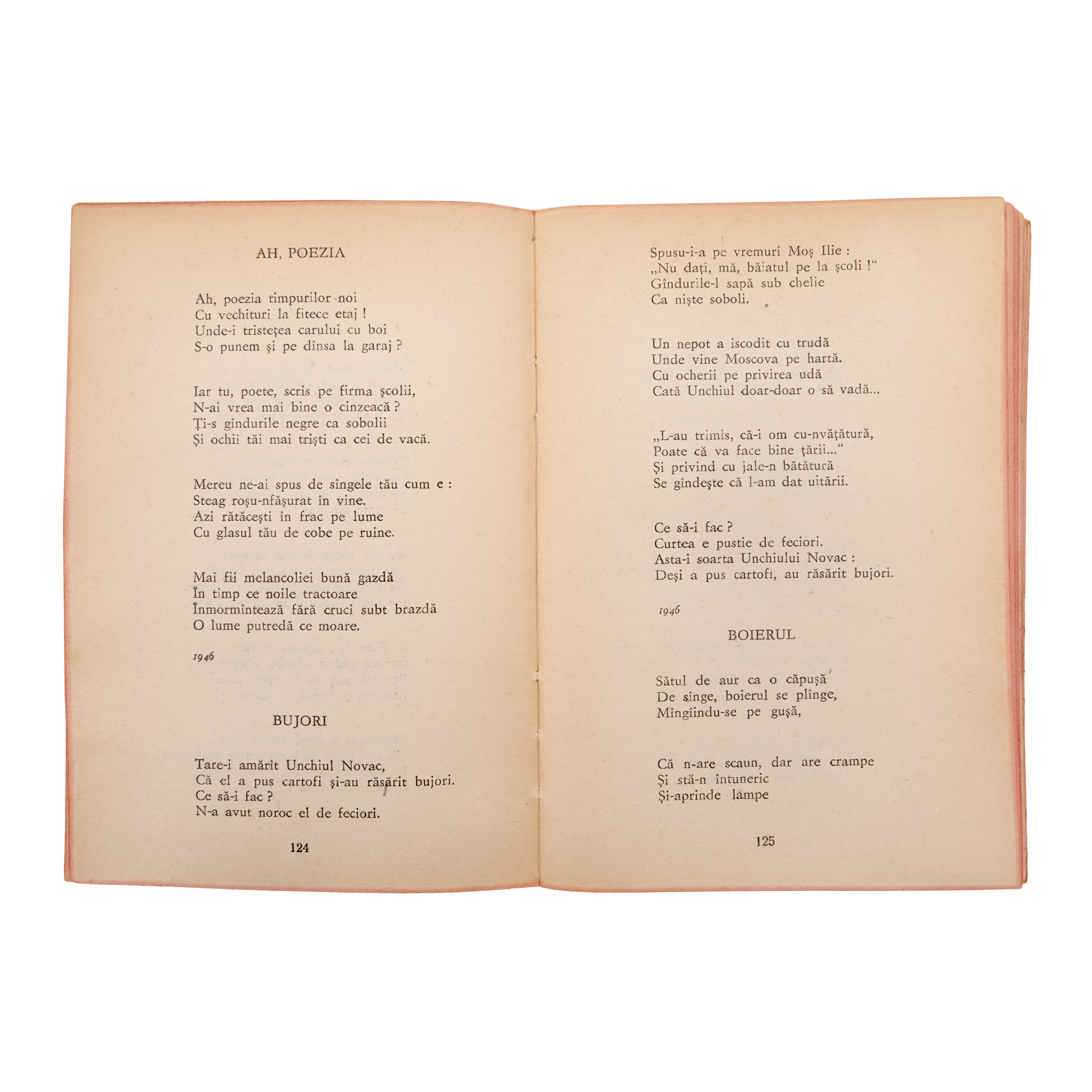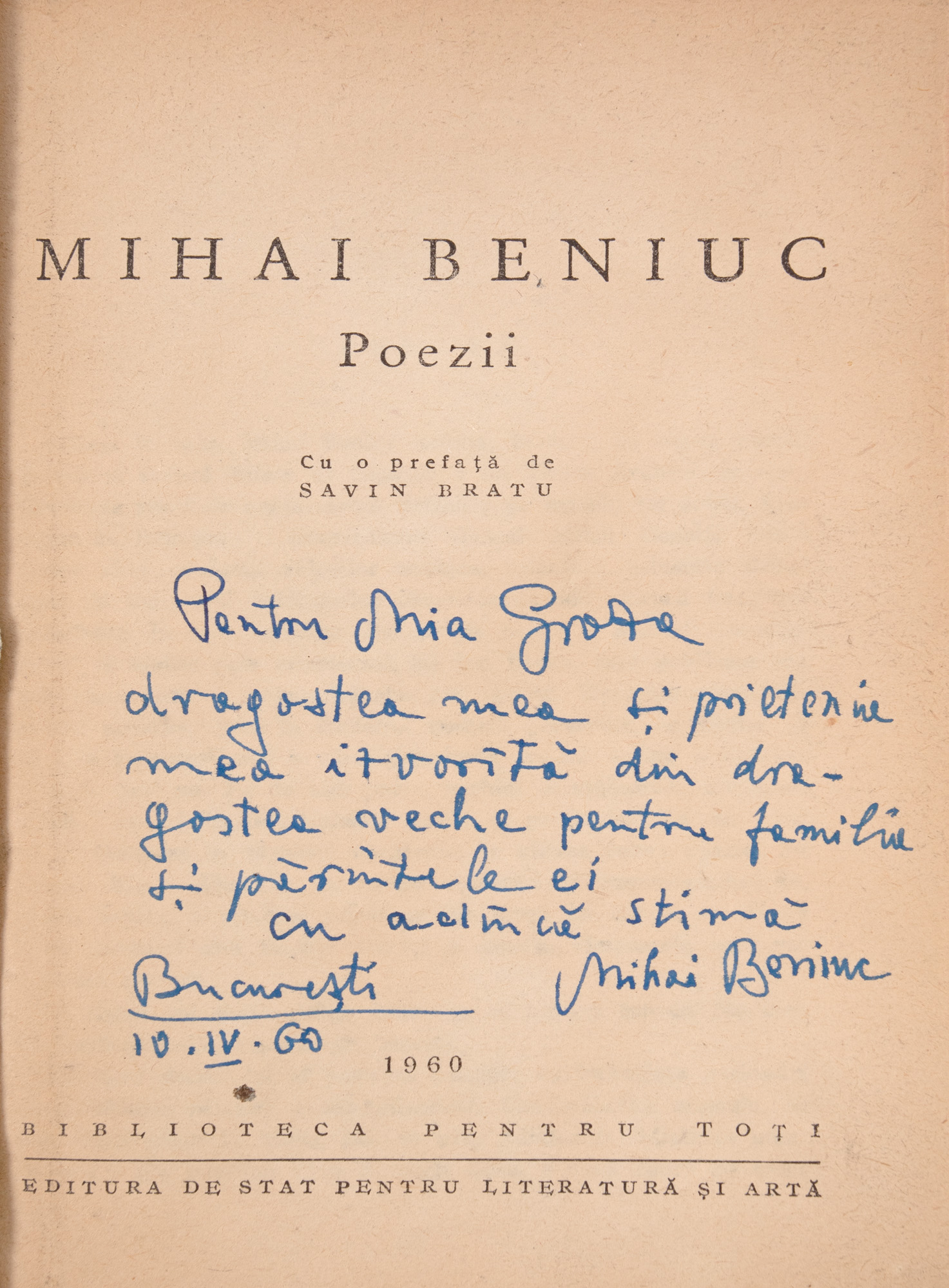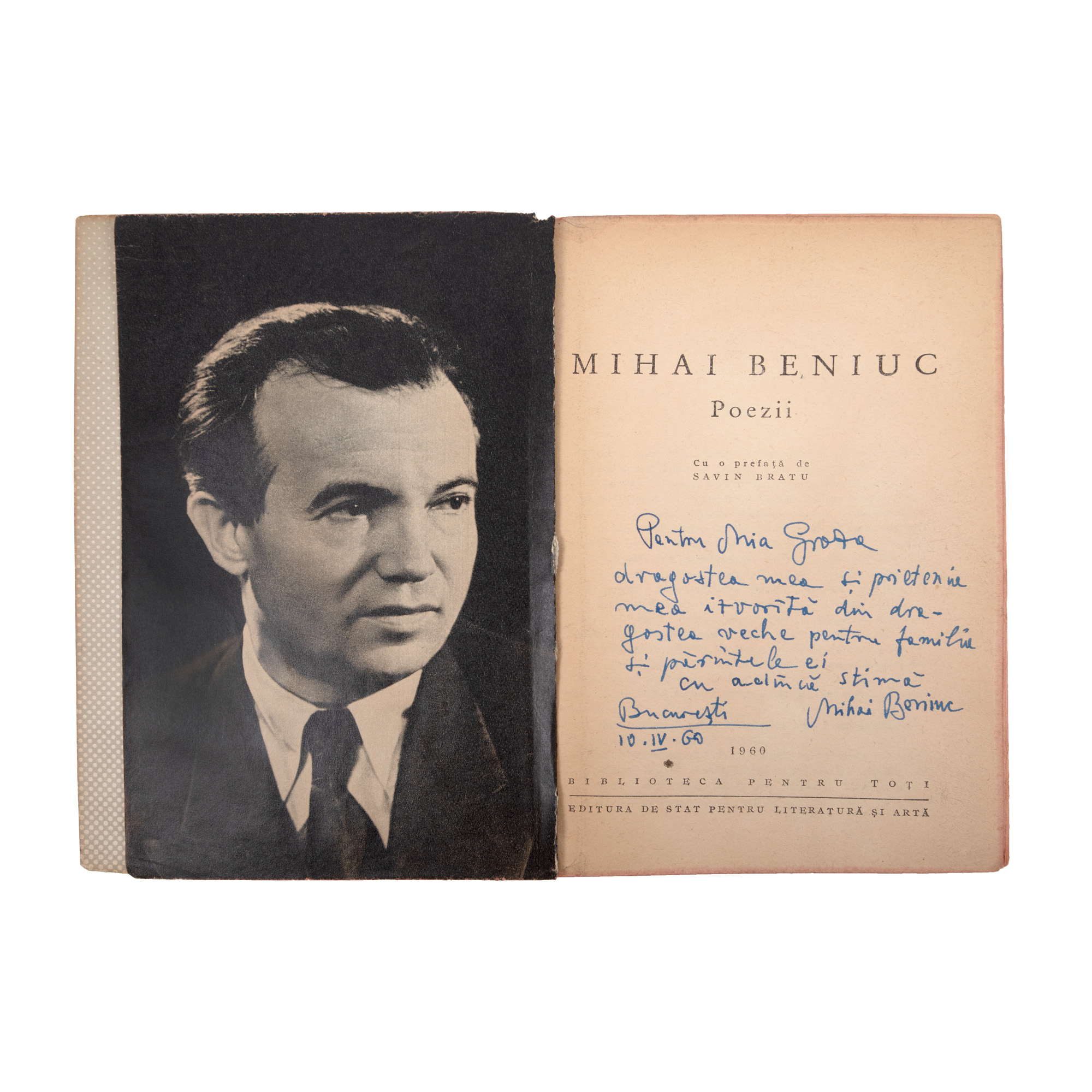 21. "Poezii", de Mihai Beniuc, București, 1960, cu dedicația olografă a autorului către Mia Groza, fiica liderului comunist Petru Groza