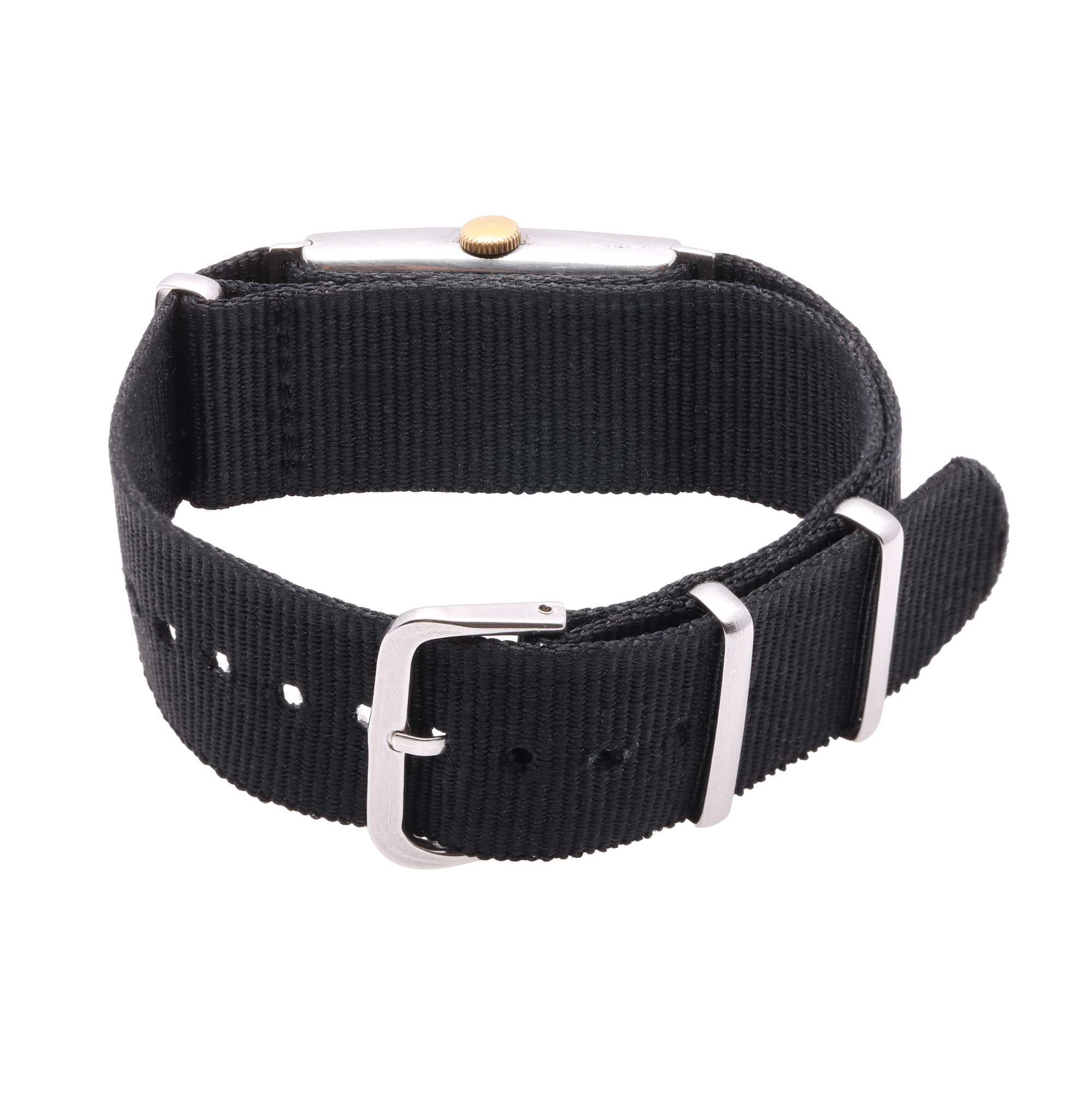 Ceas Art Deco Omega Rectangular, de mână, bărbătesc. Mecanism cu armare manuală, calibrul T17. Cadran de culoare argintiu, indici numerale arabe pentru orele pare și baghete pentru cele impare, registru pentru secundar în dreptul orei 6. Curea adăugată aftermarket, din material textil, de culoare neagră, cu sistem de închidere clasic cu cataramă.