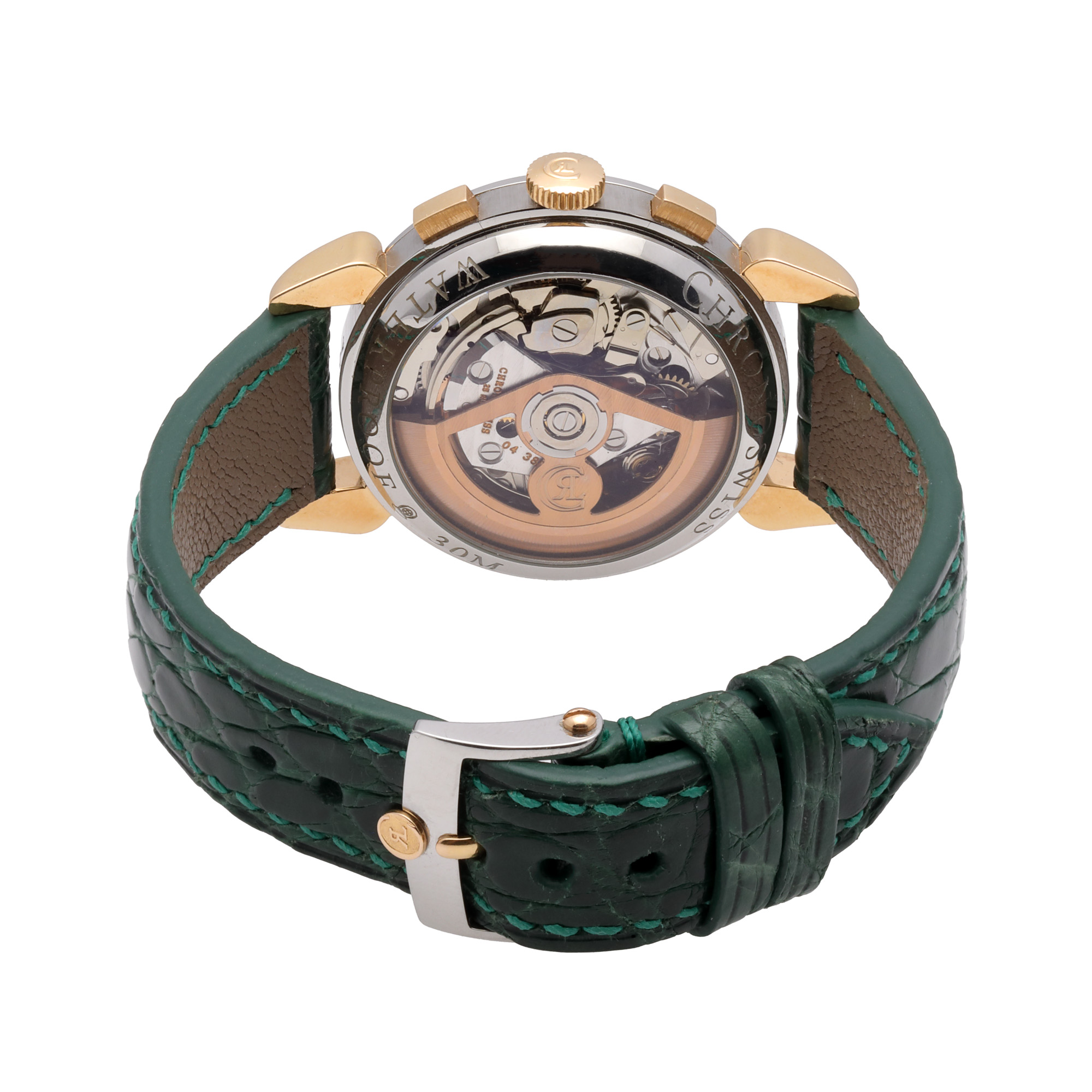 Ceas Chronoswiss Klassik, din aur și oțel, de mână, bărbătesc, referință 7404. Mecanism automatic, calibrul 7750, cu funcție de chronograph, anterior vitrat. Cadran de culoare auriu, indici numerale romane pentru orele impare, indici puncte pentru orele pare, cu două registre pentru funcția de chronograph în dreptul orelor 12 și 6, un registru pentru dată în dreptul orei 3 și un registru pentru secundar în dreptul orei 9. Curea adăugată aftermarket, cu închizățoare originală.