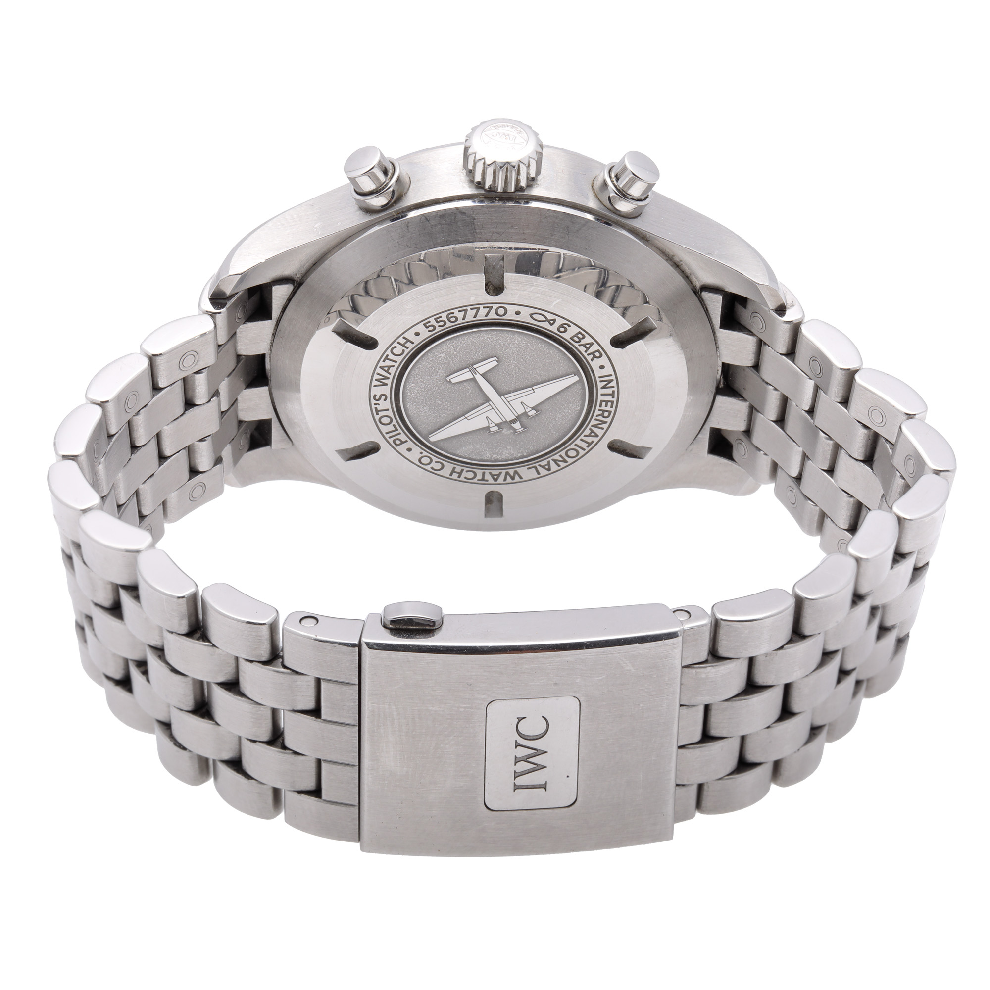 Ceas IWC Pilot Chronograph, de mână, bărbătesc, referință 371704. Mecanism automatic, calibrul 7750, cu funcție de chronograph. Cadran de culoare negru, indici cu numerale arabe, cu un registru pentru dată în dreptul orei 3, două registre pentru funcția de chronograph în dreptul orelor 12 și 6 și un registru pentru secundar în dreptul orei 9. Brățară originală, din oțel inoxidabil, cu sistem de închidere de tip deployant.