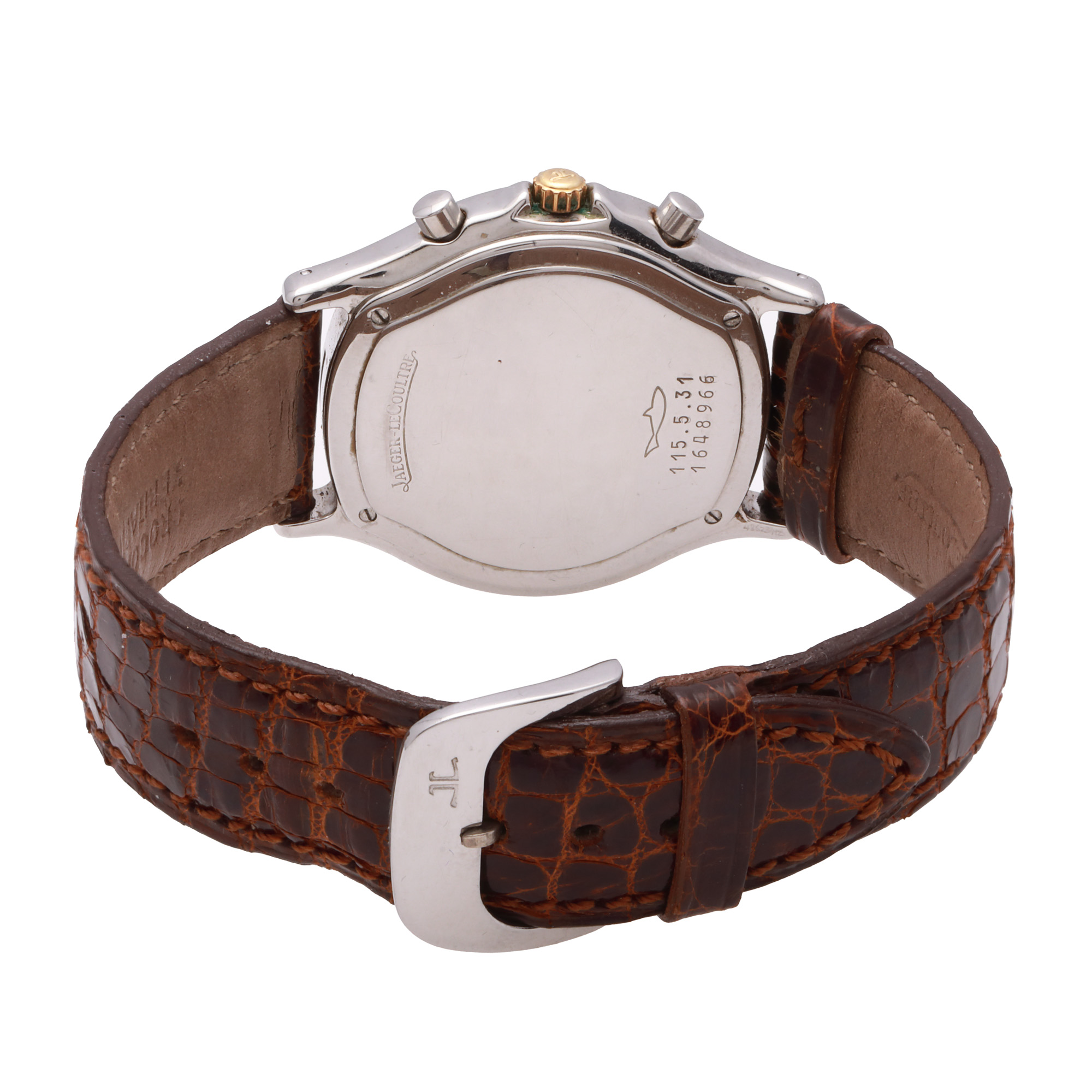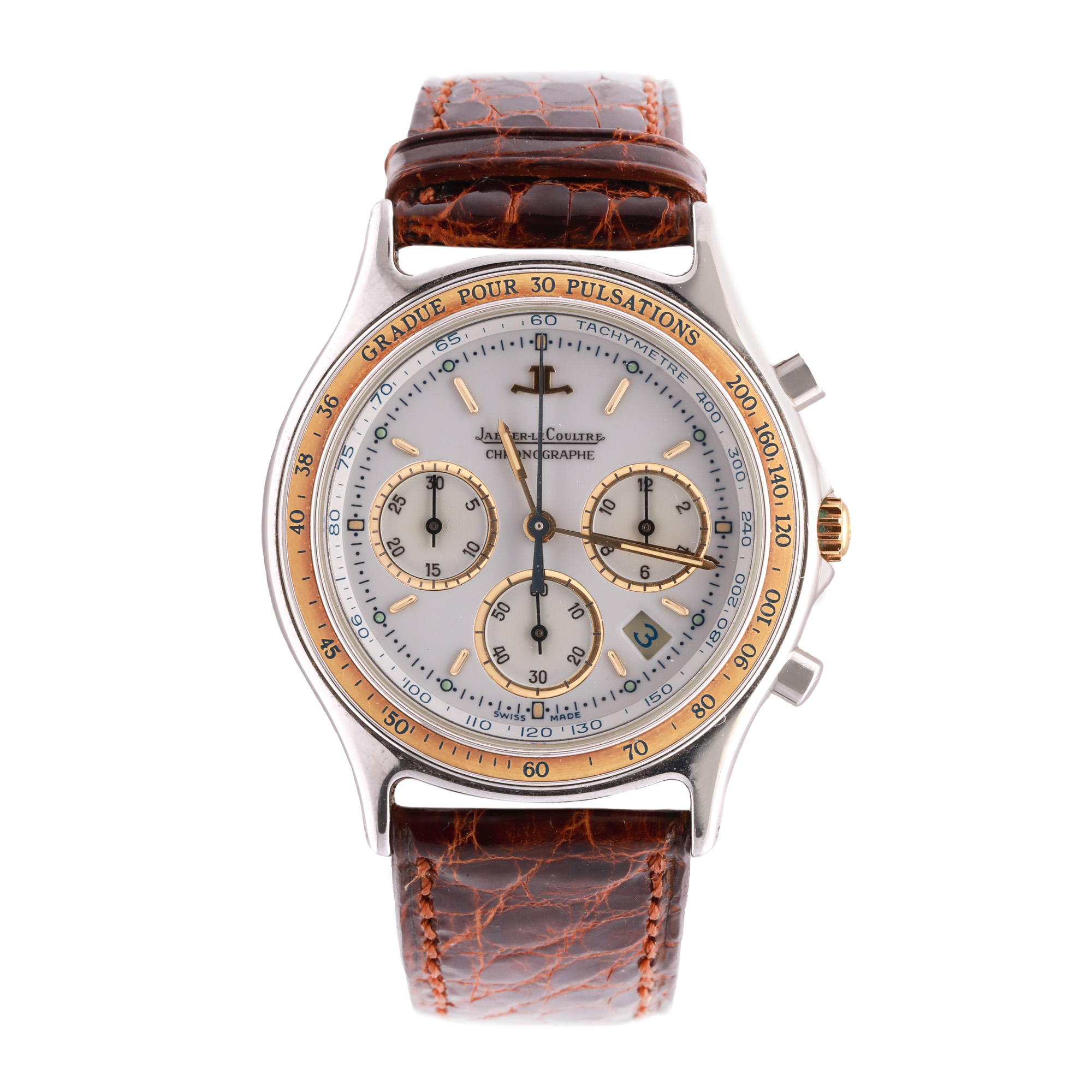 Ceas Jaeger LeCoultre Heraion Reveil Chronograph, din aur și oțel, de mână, unisex, referință 116533. Mecanism quartz, calibrul JLC Mecaquartz, cu funcție de chronograph. Cadran de culoare alb, indici baghetă, cu un registru pentru secundar în dreptul orei 6 și două registre pentru funcția de chronograph în dreptul orelor 3 și 9. Curea adăugată aftermarket, din piele, de culoare maro, cu sistem de închidere de tip deployant.