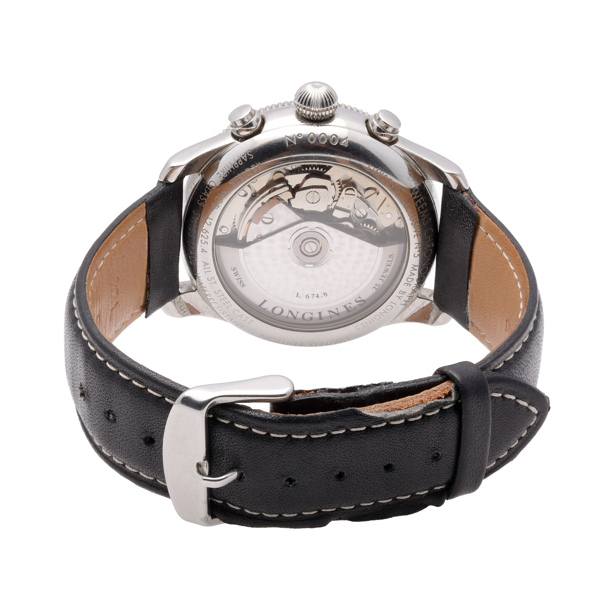 Ceas Longines Weems Chronograph, de mână, bărbătesc, ediție limitată Swiss Air, referință L2.625.4. Mecanism automatic, calibrul L674.8 calibrul de bază 7750, anteriot vitrat. Cadran de culoare alb, numerale arabe, registru pentru secundar în dreptul orei 9, două registre pentru funcția de chronograph în dreptul orelor 6 și 12, registru pentru ziua săptămânii și dată în dreptul orei 3. Curea adăugată aftermarket, din piele, de culoare neagră, cu sistem de închidere clasic cu cataramă.