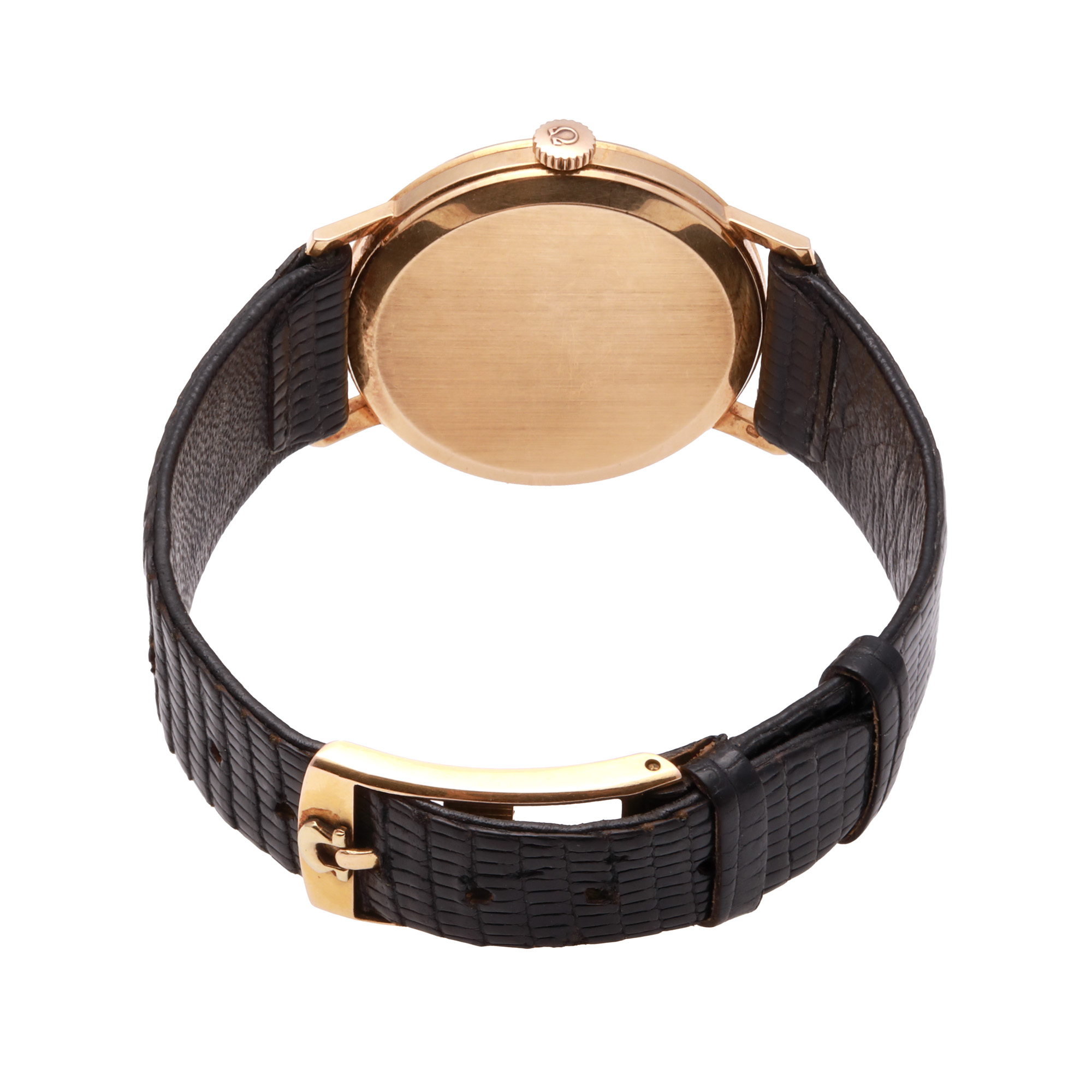 Ceas Omega Century, din aur, de mână, bărbătesc, referință 121014. Mecanism cu armare manuală, calibrul 269. Indici baghetă, cu un registru pentru secundar în dreptul orei 3. Curea adăugată aftermarket, din pielele, de culoare neagră, cu sistem de închidere de tip clasic.