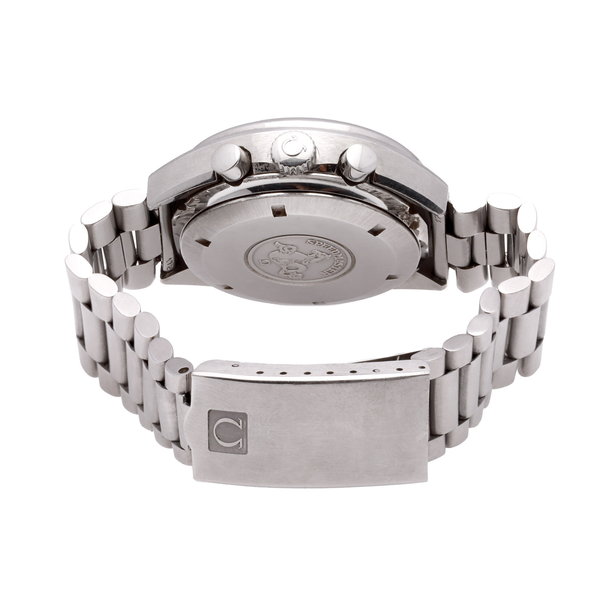 Ceas Omega Speedmaster Mark IV, de mână, bărbătesc, referință 176.009. Mecanism automatic, calibrul Lemania 1040. Cadran de culoare negru, indici baghete pentru ore și numerale arabe pentru minute, registru pentru dată în dreptul orei 3, registru pentru chronograph în dreptul orei 6, registru pentru secundar în dreptul orei 9. Brâțară originală, din oțel, cu sistem de închidere de tip deployant.
