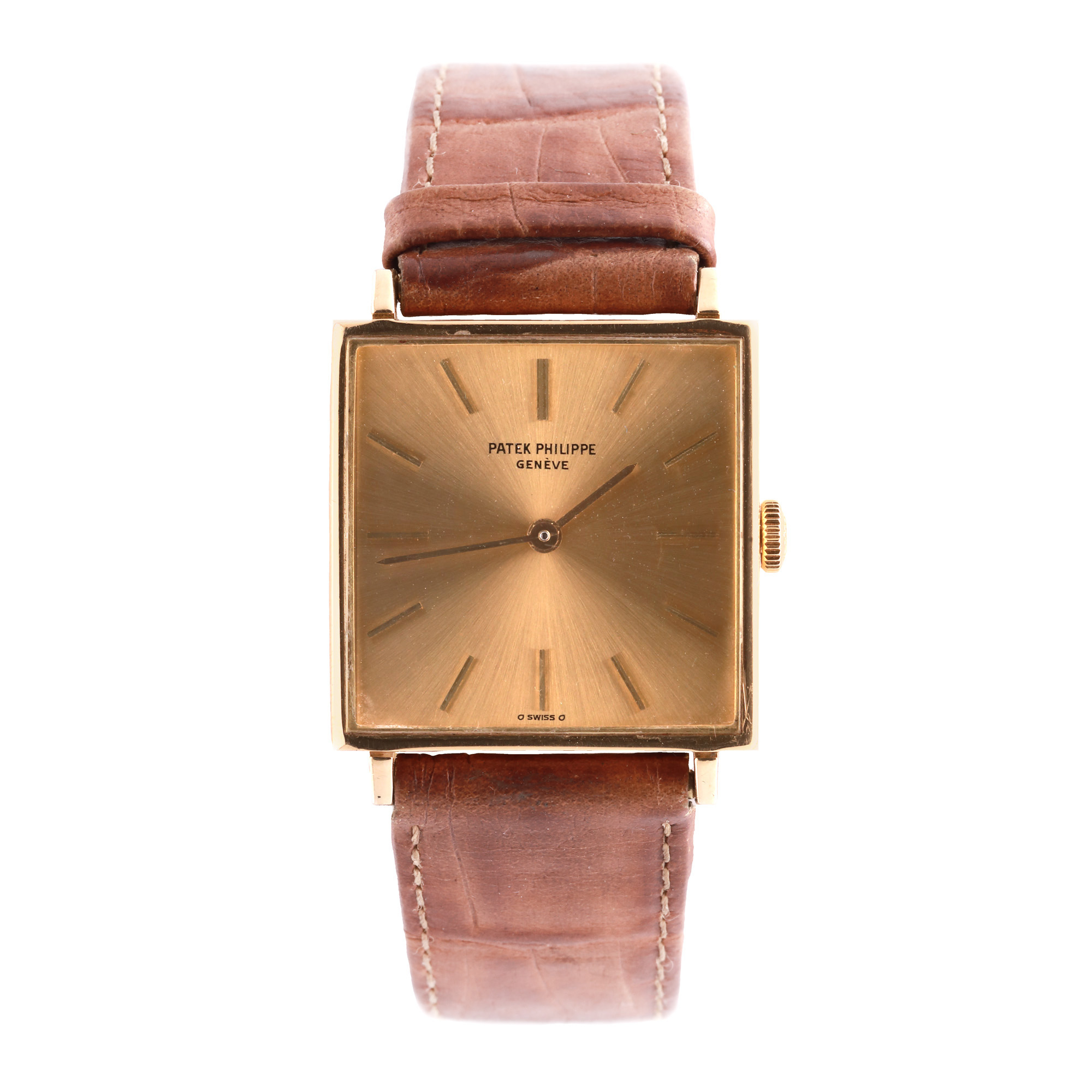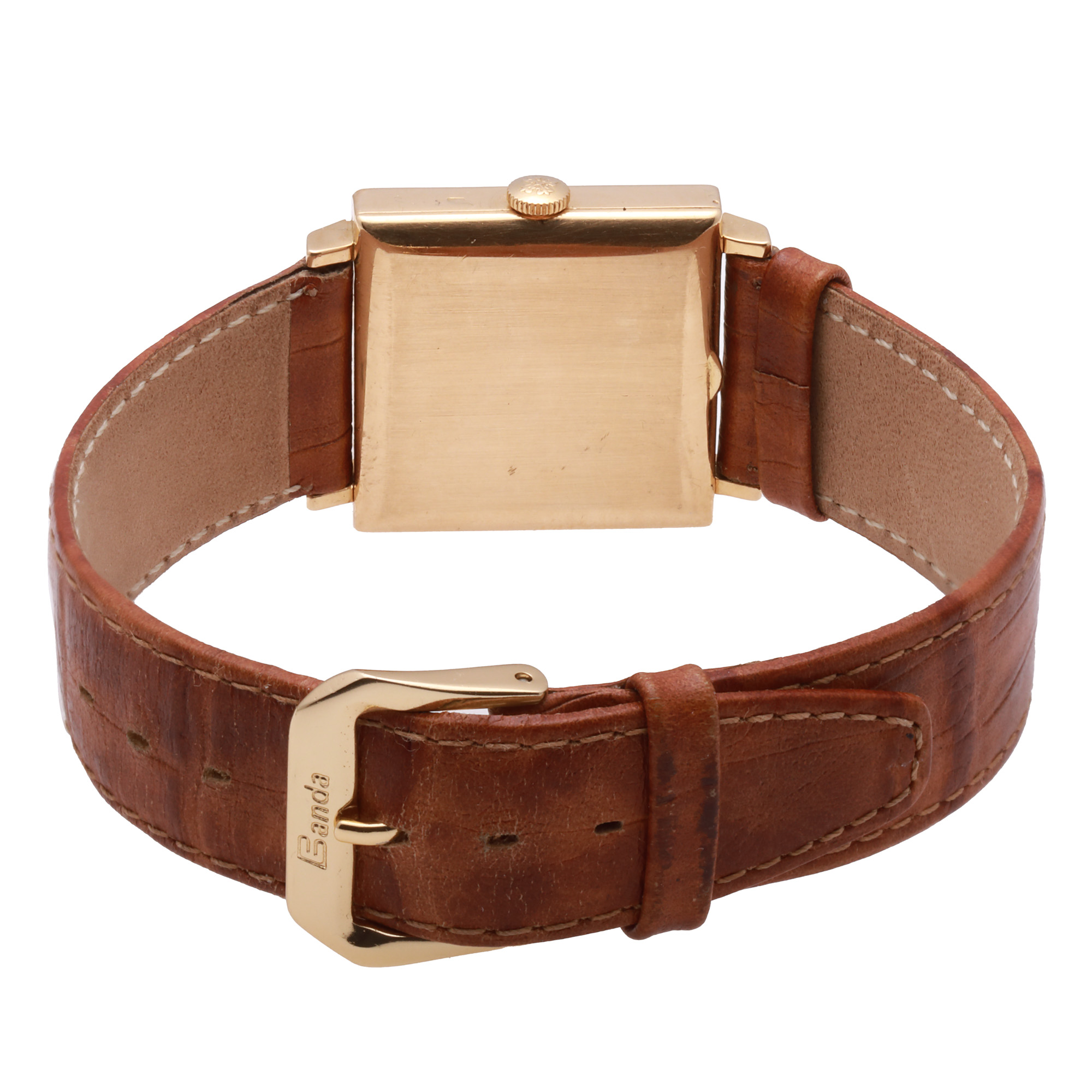 Ceas Patek Philippe Gondolo, din aur, de mână, unisex, referință 3430. Mecanism cu armare manuală, calibrul 175. Cadran de culoare champagne, indici baghetă. Curea adăugată aftermarket, din piele, de culoare maro, cu sistem de închidere de tip clasic