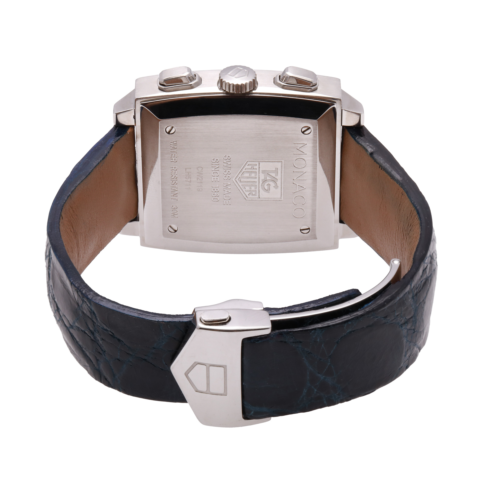 Ceas Tag Heuer Monaco, de mână, bărbătesc, referință CW 2119. Mecanism automatic, calibrul 17, cu funcție de chronograph. Cadran din sidef, indici baghete, registru pentru secundar în dreptul orei 3, registru pentru dată în dreptul orei 6, două registre pentru funcția de chronograph în dreptul orelor 6 și 12. Curea adăugată aftermarket, din piele, de culoare maronie, cu sistem de închidere cu deployantul original. Accesorii: curea originală din piele de șarpe.