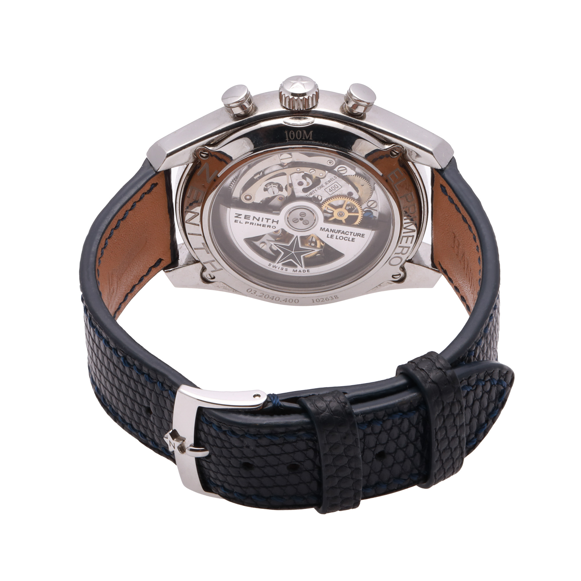 Ceas Zenith El Primero Chronograph, de mână, bărbătesc, referință 03.2040.400. Mecanism automatic, calibrul El Primero 400, cu funcție de chronograph, anterior vitrat. Cadran de culoare silber, indici baghetă, cu două registre pentru funcția de chronograph în dreptul orelor 3 și 6, un registru pentru secundar în dreptul orei 9 și o casetă pentru dată în dreptul orei 6. Curea adăugată aftermarket, din piele, de culoare bleumarin, cu sistem de închidere de tip clasic. Accesorii: card de garanție.