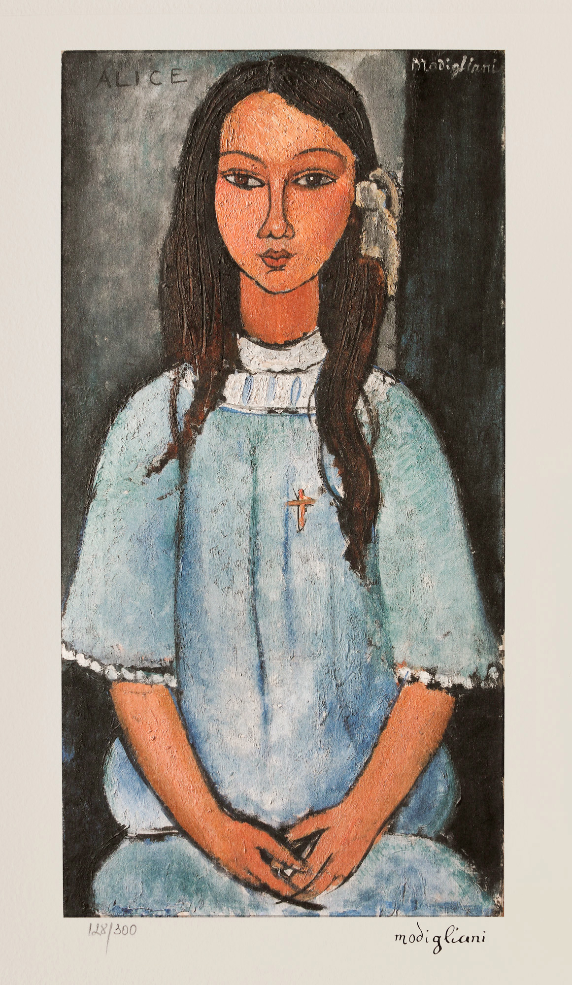 semnat și intitulat sus, în placă, ”ALICE, Modigliani”; semnat dreapta jos, sub cadru, ”Modigliani”; numerotat stânga jos, sub cadru, în creion, ”128/300”