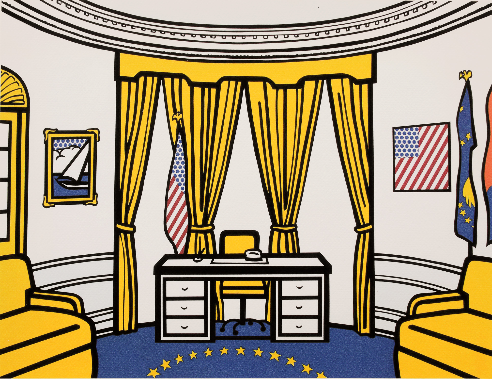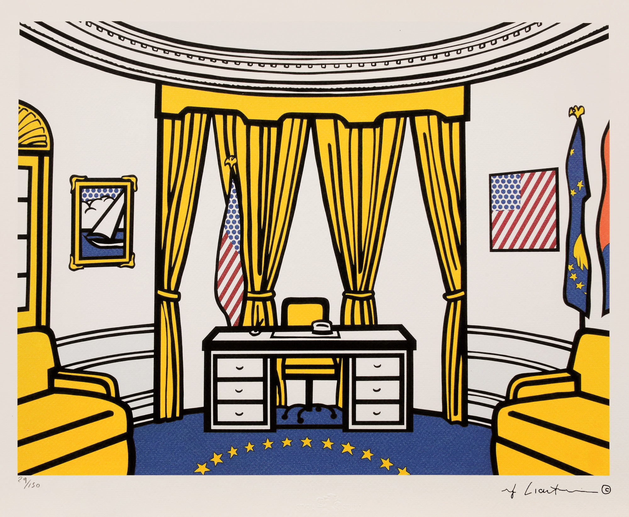 semnat dreapta jos, sub cadru, ”Roy Lichtenstein”; numerotat stânga jos, sub cadru, ”29/150”; pe verso, ștampila editurii, ”Castelli Graphics”