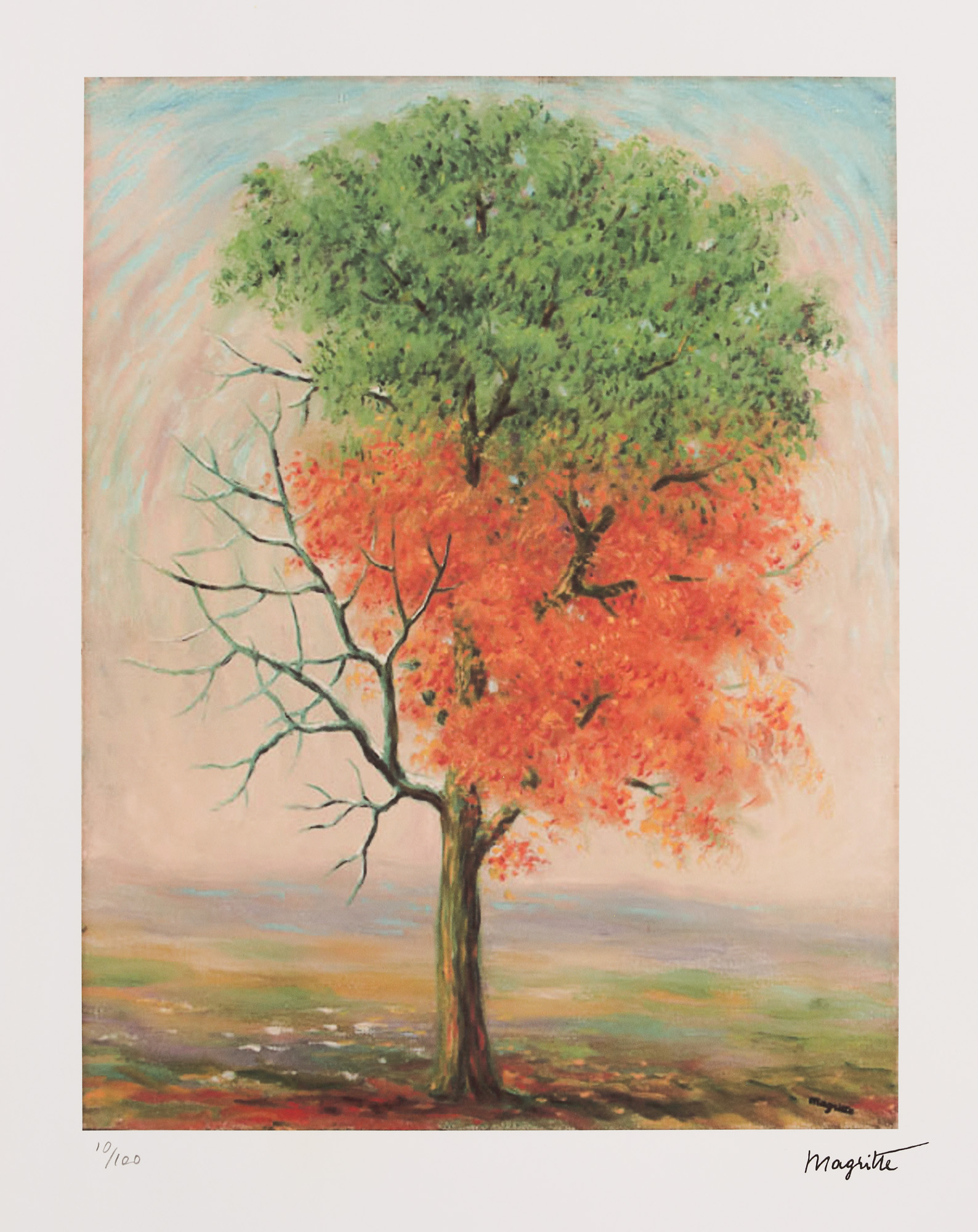 semnat dreapta jos, sub cadru, ”Magritte”; numerotat stânga jos, în creion, ”10/100”; ștampila editurii, dreapta jos, ”Edizioni RO D'Arte”