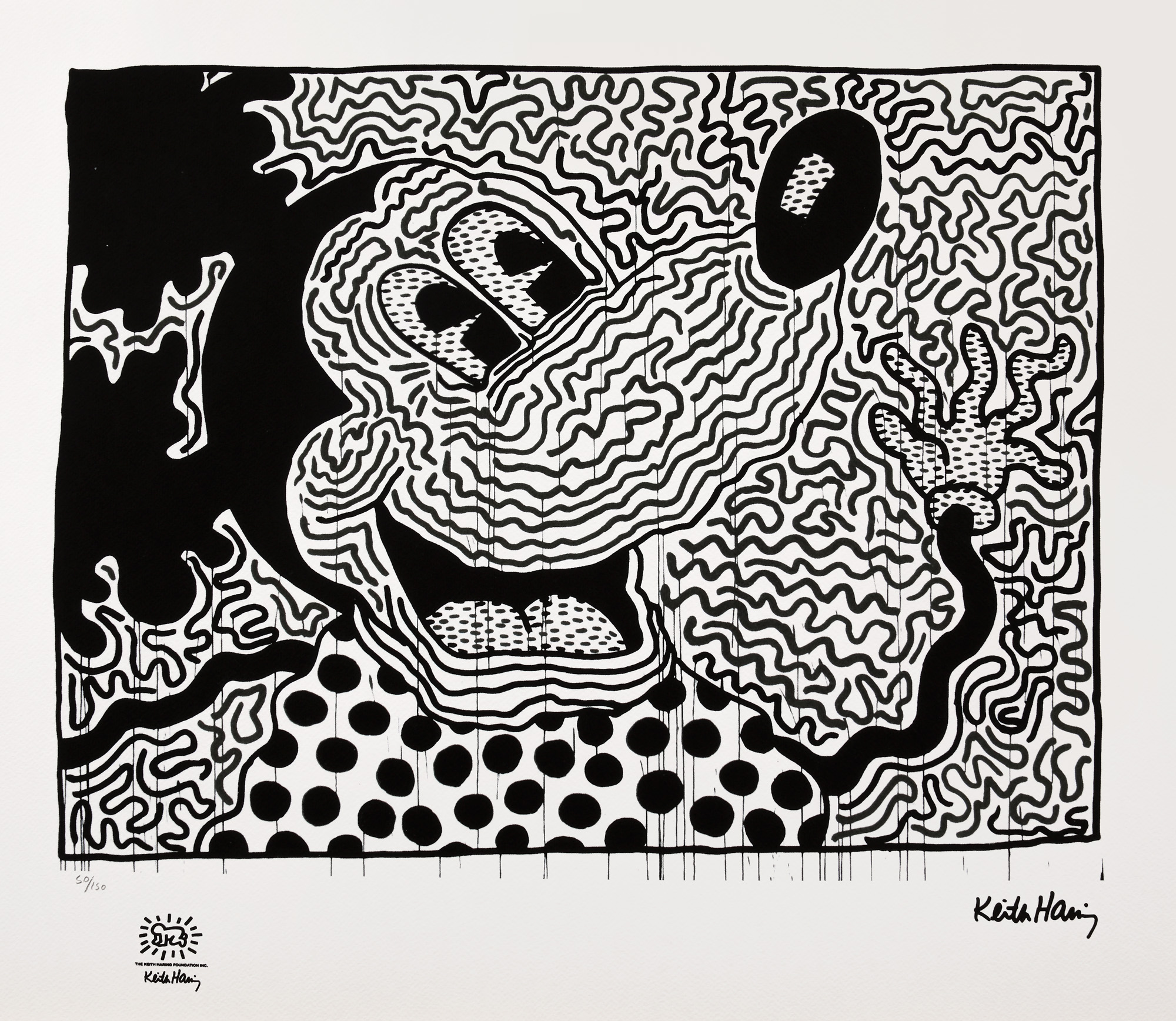 semnat dreapta jos, sub cadru, ”Keith Haring”; numerotat stânga jos, sub cadru, în creion, ”50/150”; stânga jos, ștampila editurii, ”Keith Haring”
