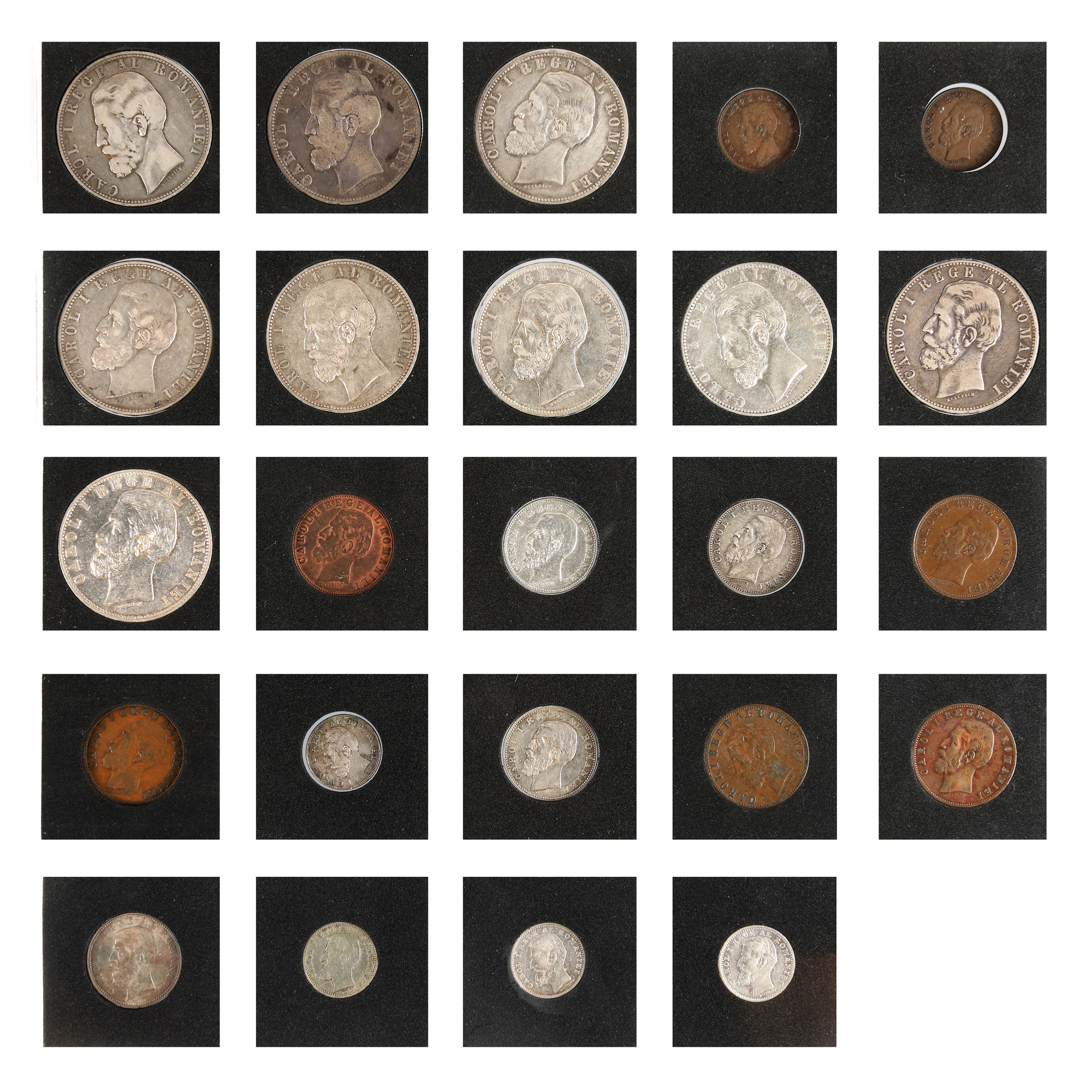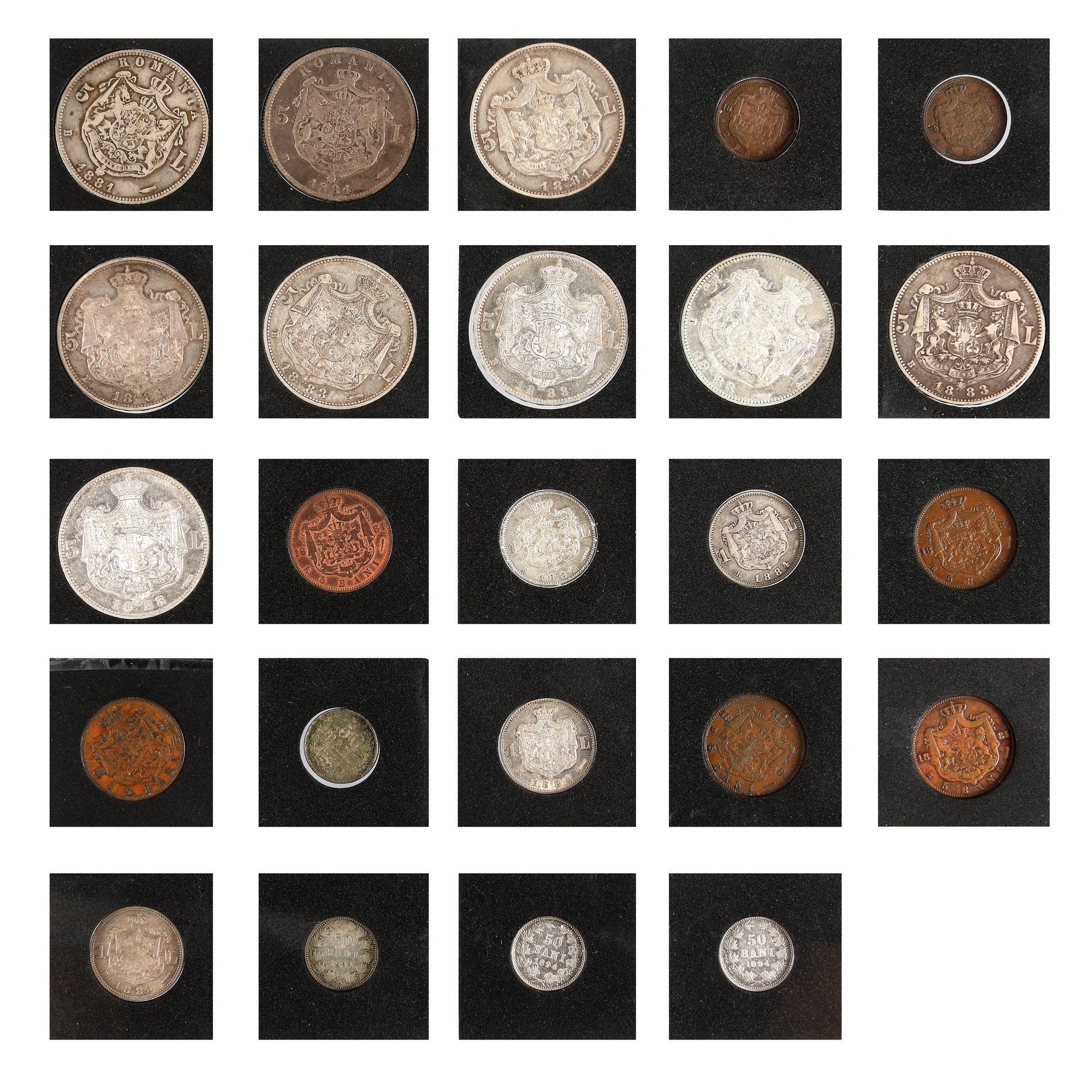 3 x 5 Lei 1881, 6 x 5 Lei 1883, 3 x 1 Leu 1884, 1 Leu 1885, 2 x 2 Bani 1892, 4 x 5 Bani 1884, 5 Bani 1885, 3 x 50 Bani 1894, 50 Bani 1884