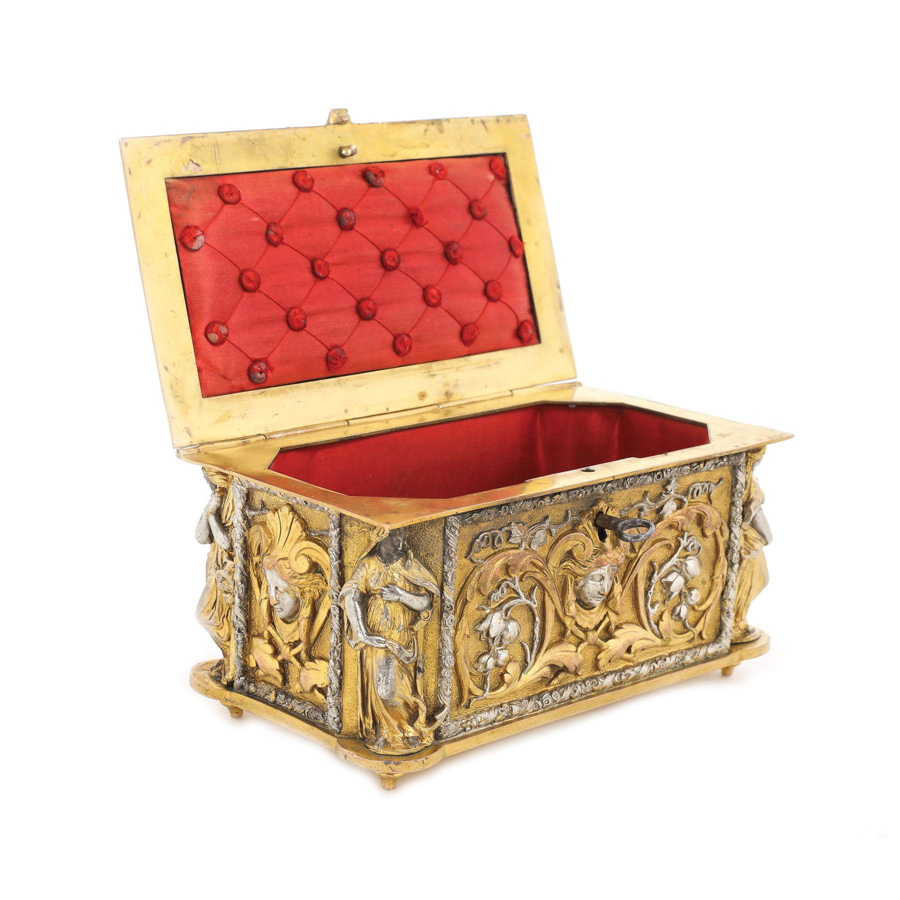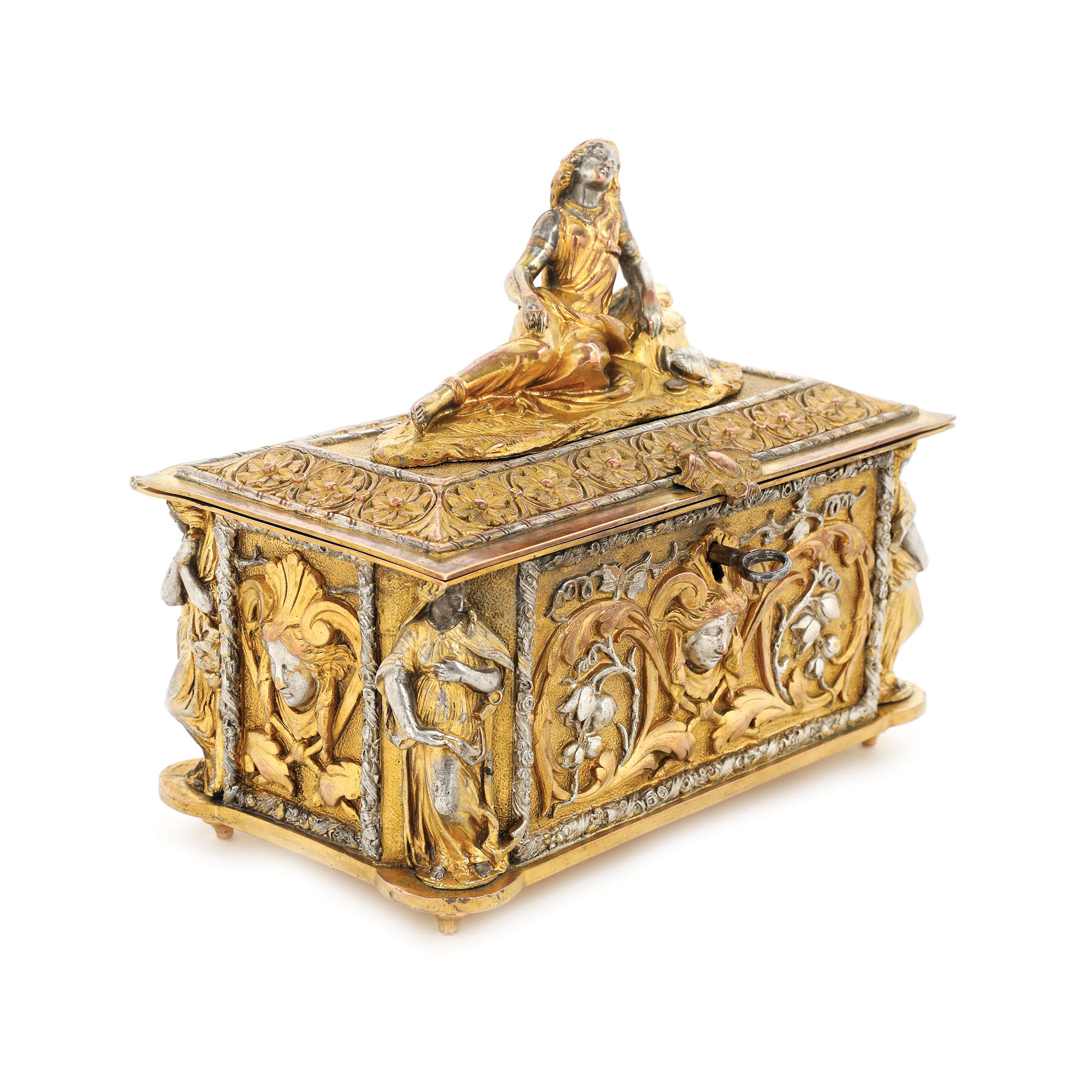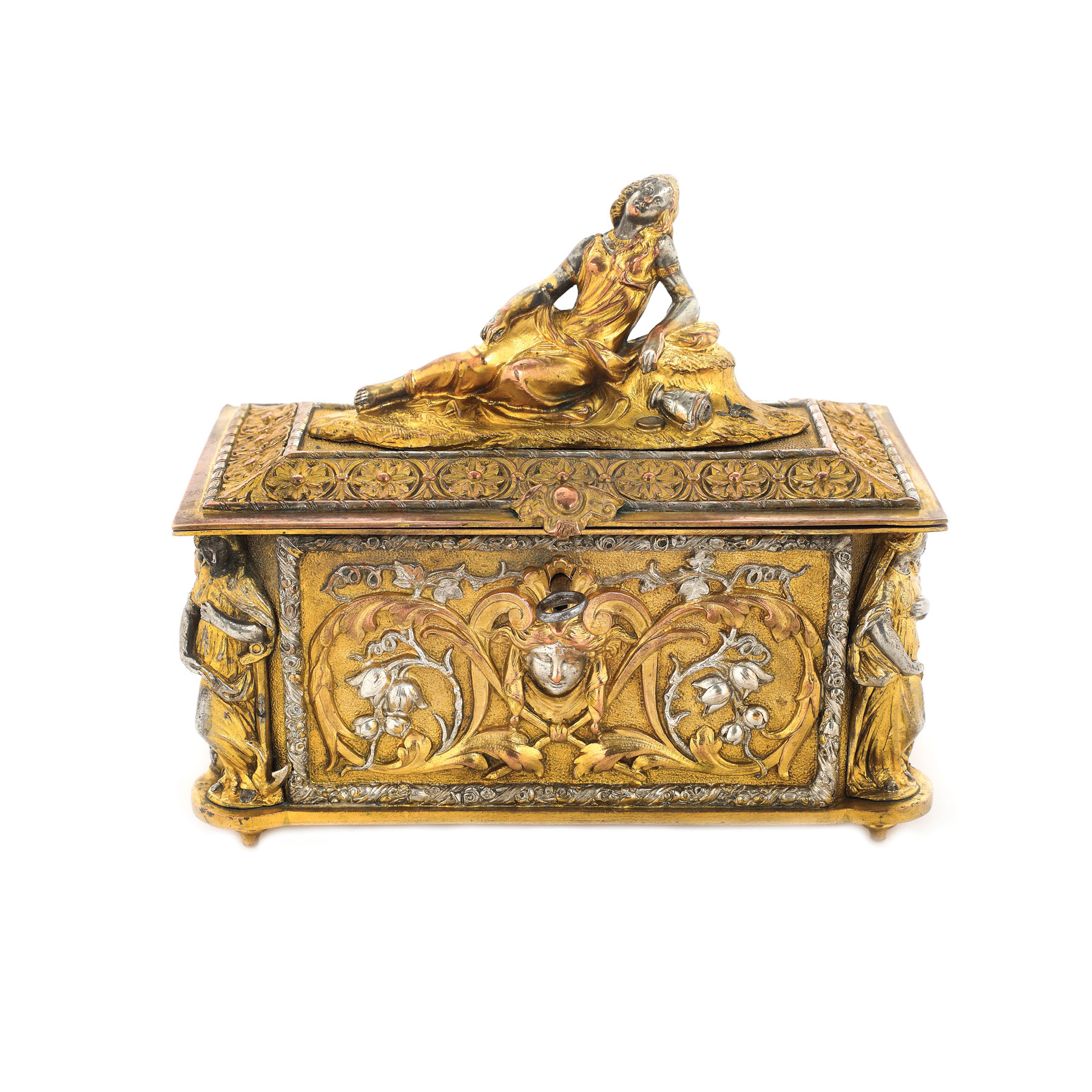 43. Cutie pentru bijuterii, din bronz aurit, decorată cu cariatide, sfârșitul sec. XIX