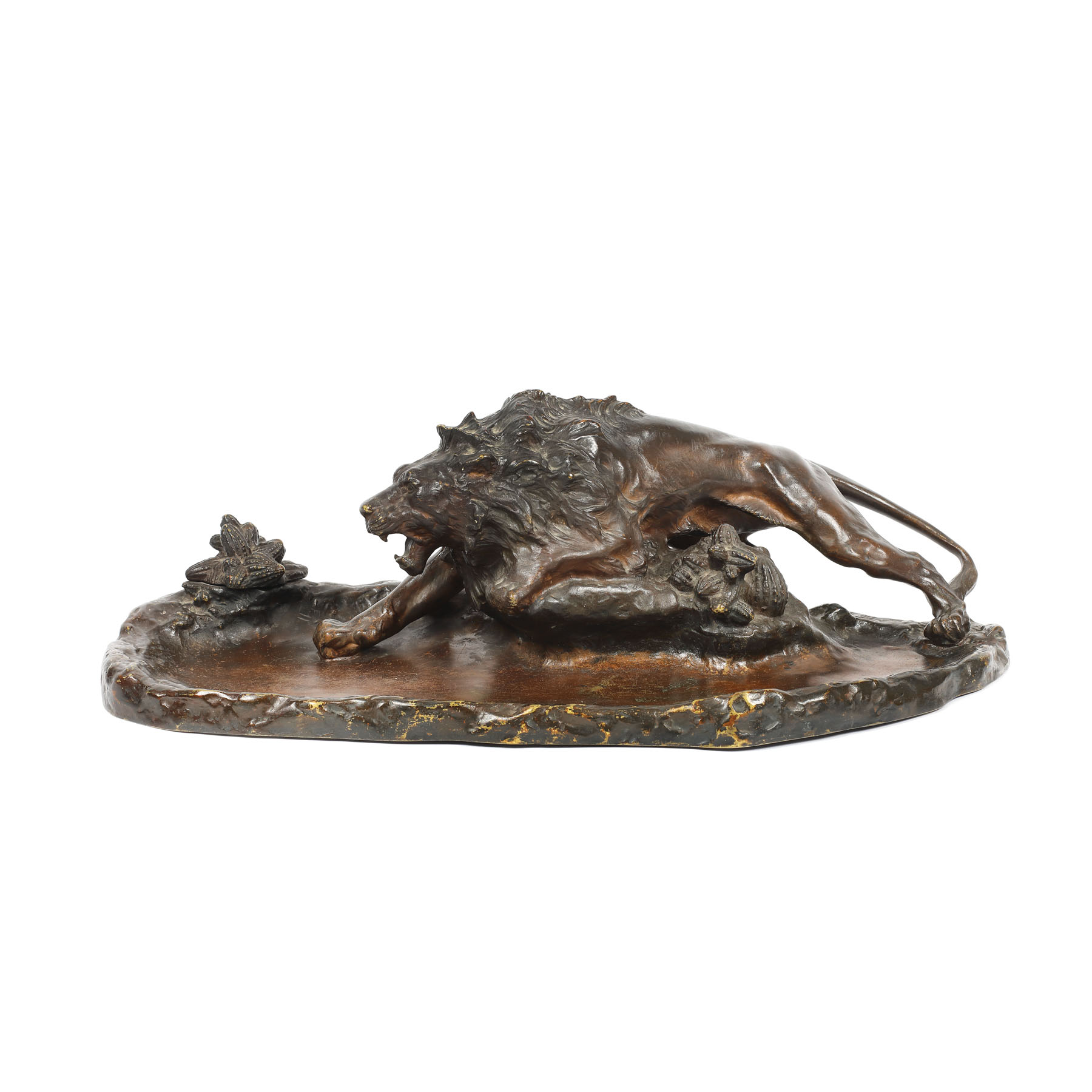 14. Suport pentru instrumente de scris și călimară, din bronz, decorat cu o statuetă ilustrând un leu vânând (după o sculptură de Pierre-Jules Mene)