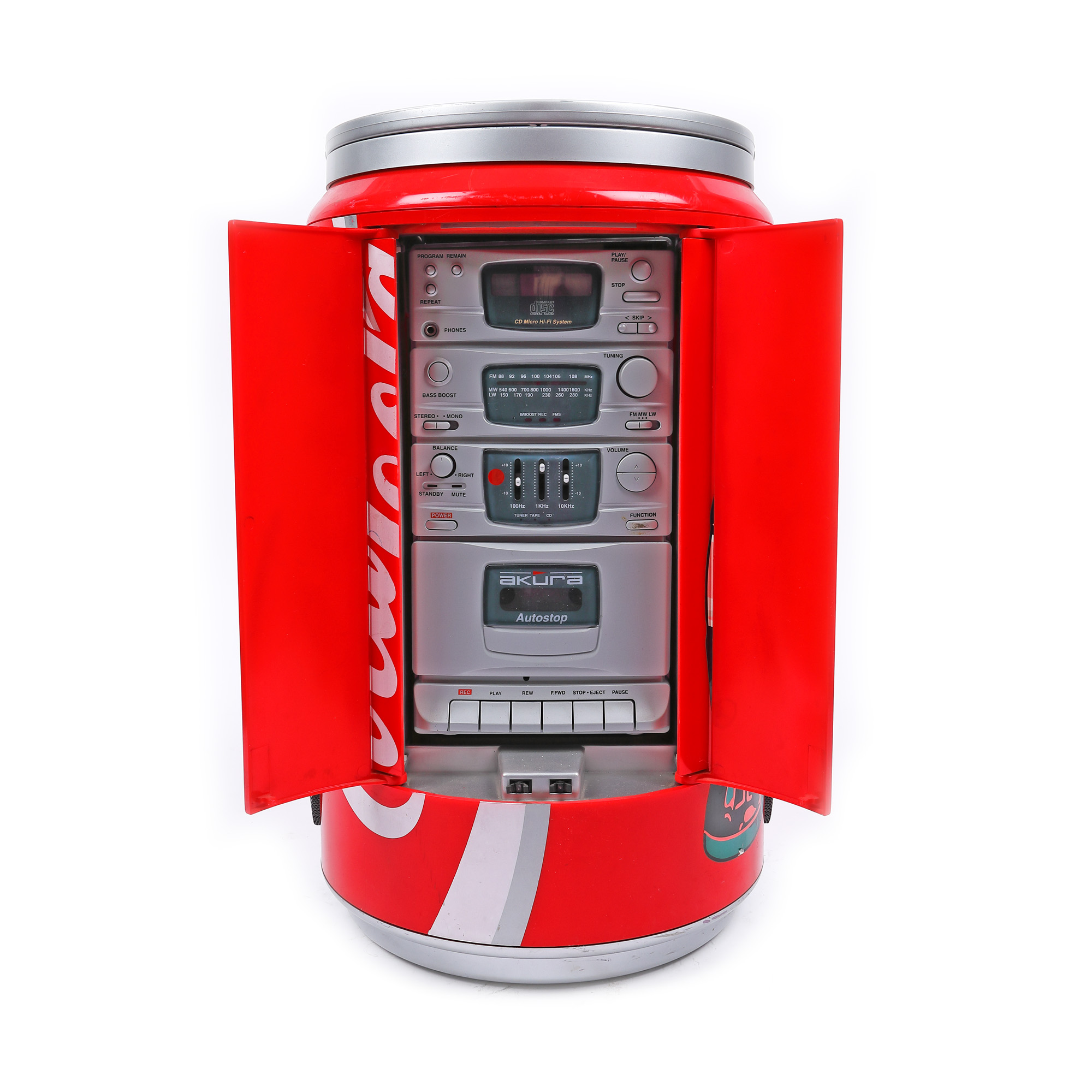 7. Combină stereo Akura Tuning în formă de doză de Coca-Cola, cu radio, CD player și casetofon [Cca. 1980-1990]