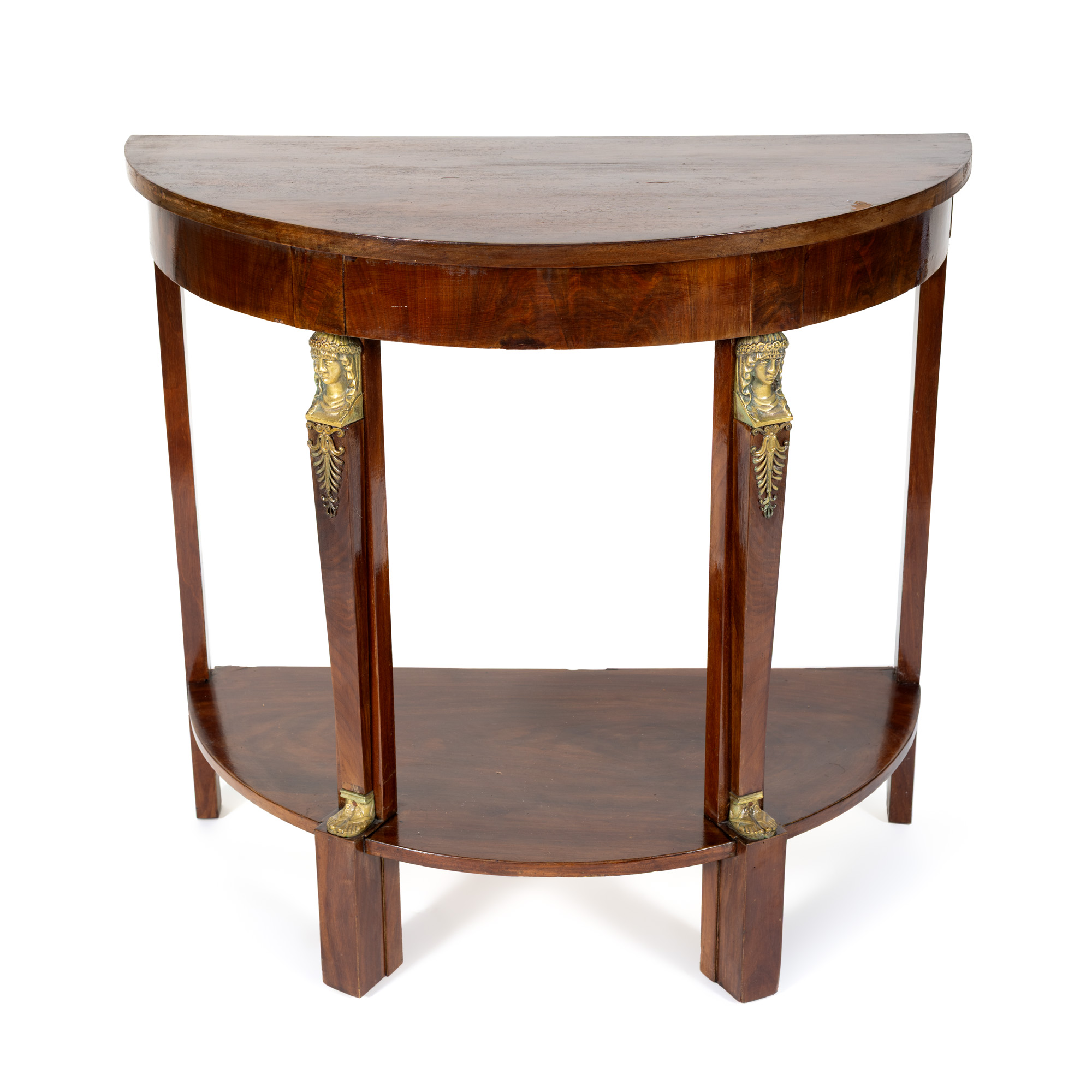 19. Consolă Neo-Empire tip ”semilună”, furniruită cu lemn de acaju, ornată cu cariatide egiptene, sfârșitul sec. XIX