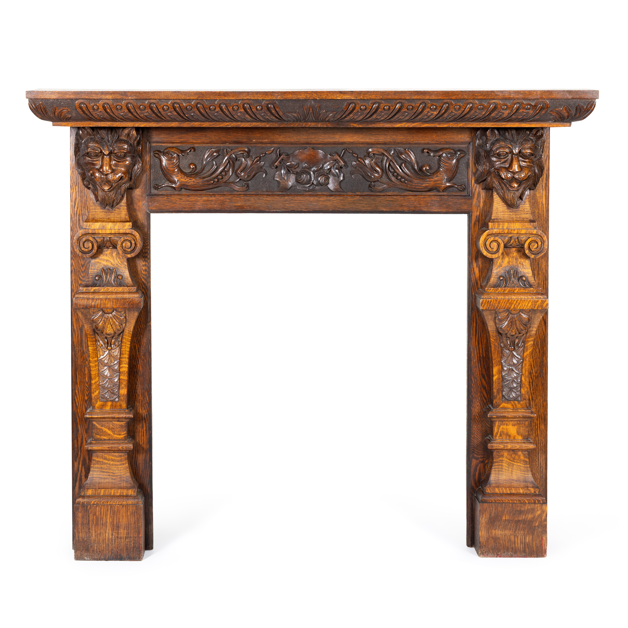 26. Față de șemineu, stil Neo-Renascentist, din lemn de stejar, decorată cu animale fantastice, prevăzută cu consolă, cca. 1900