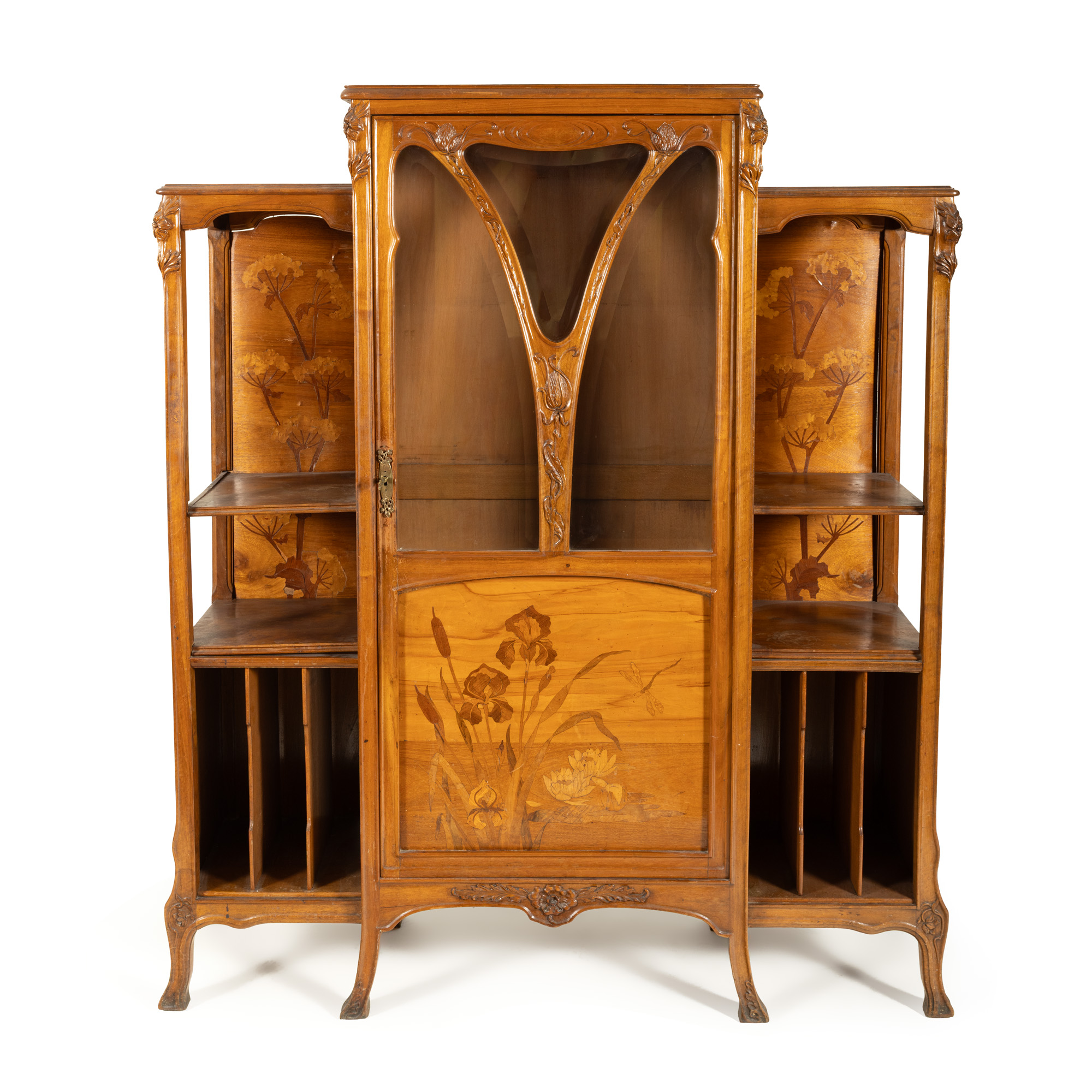 29. Vitrină Gallé, în stil Art Nouveau, din lemn de nuc, marchetată cu flori de iris, nuferi și libelulă, cca. 1905