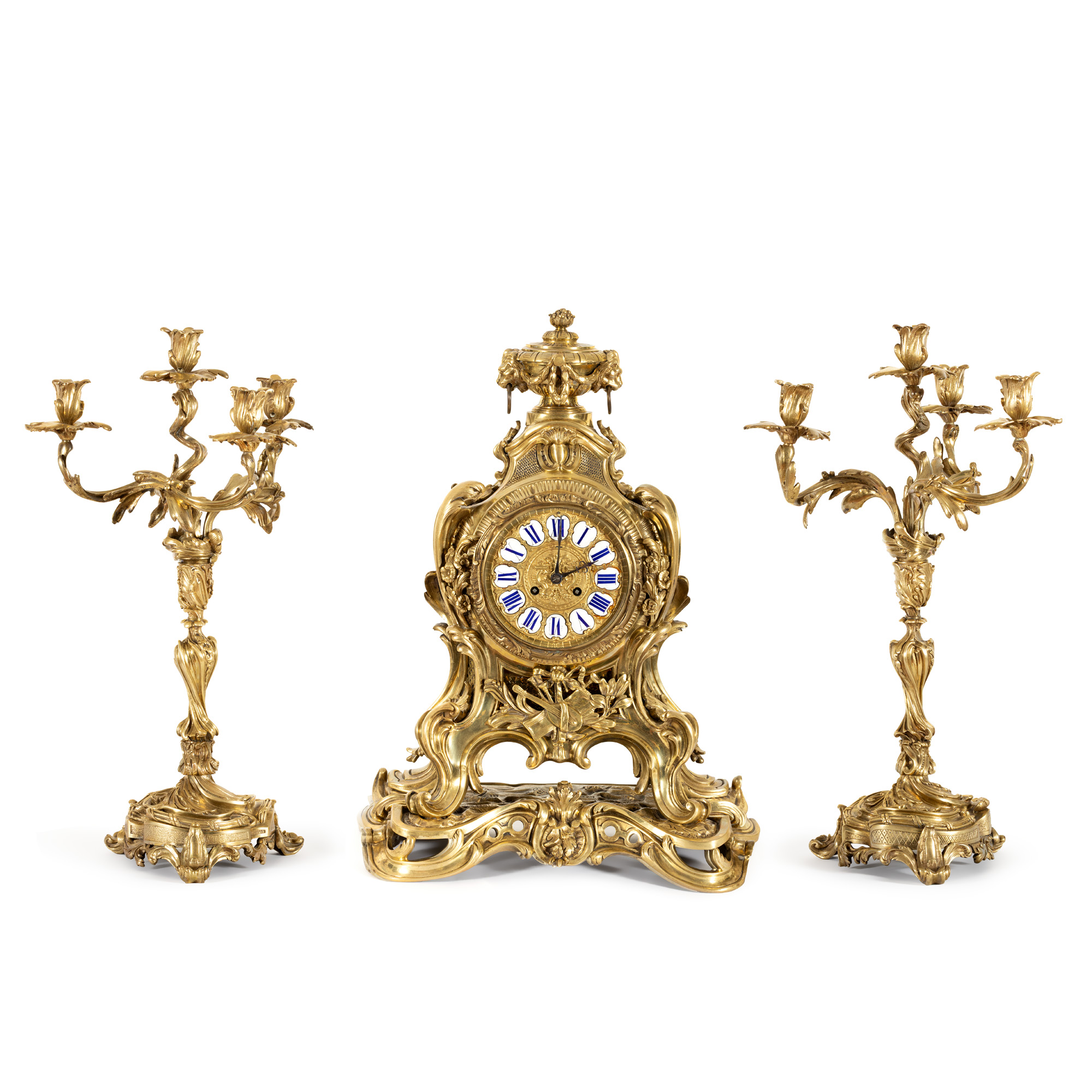 35. Garnitură de șemineu Henri Houdebine, stil Louis XV, din bronz doré, mijlocul sec. XIX
