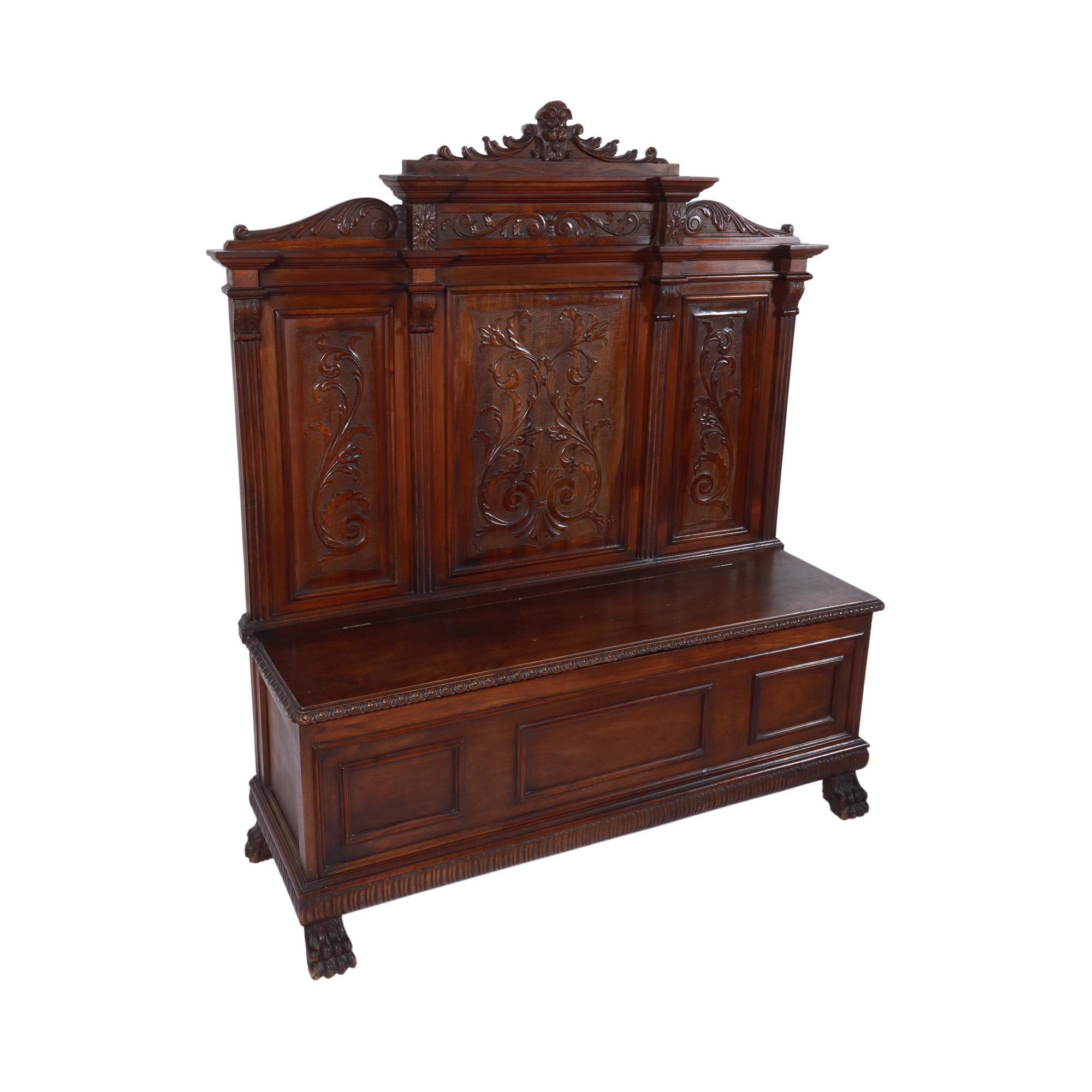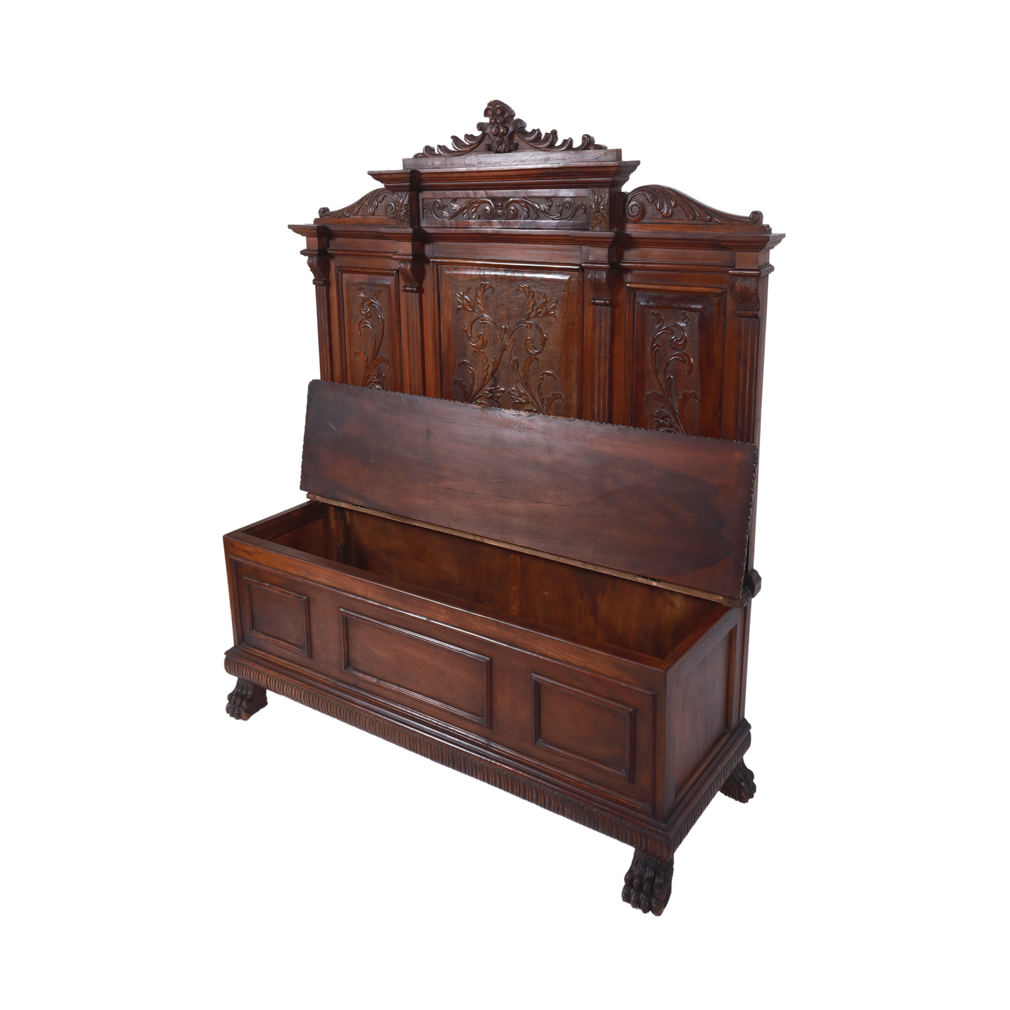 13. Banchetă Neo-Renaștere florentină, din lemn de nuc, pentru hol, cu ladă pentru păstrare pantofi și accesorii, sfârșitul sec. XIX
