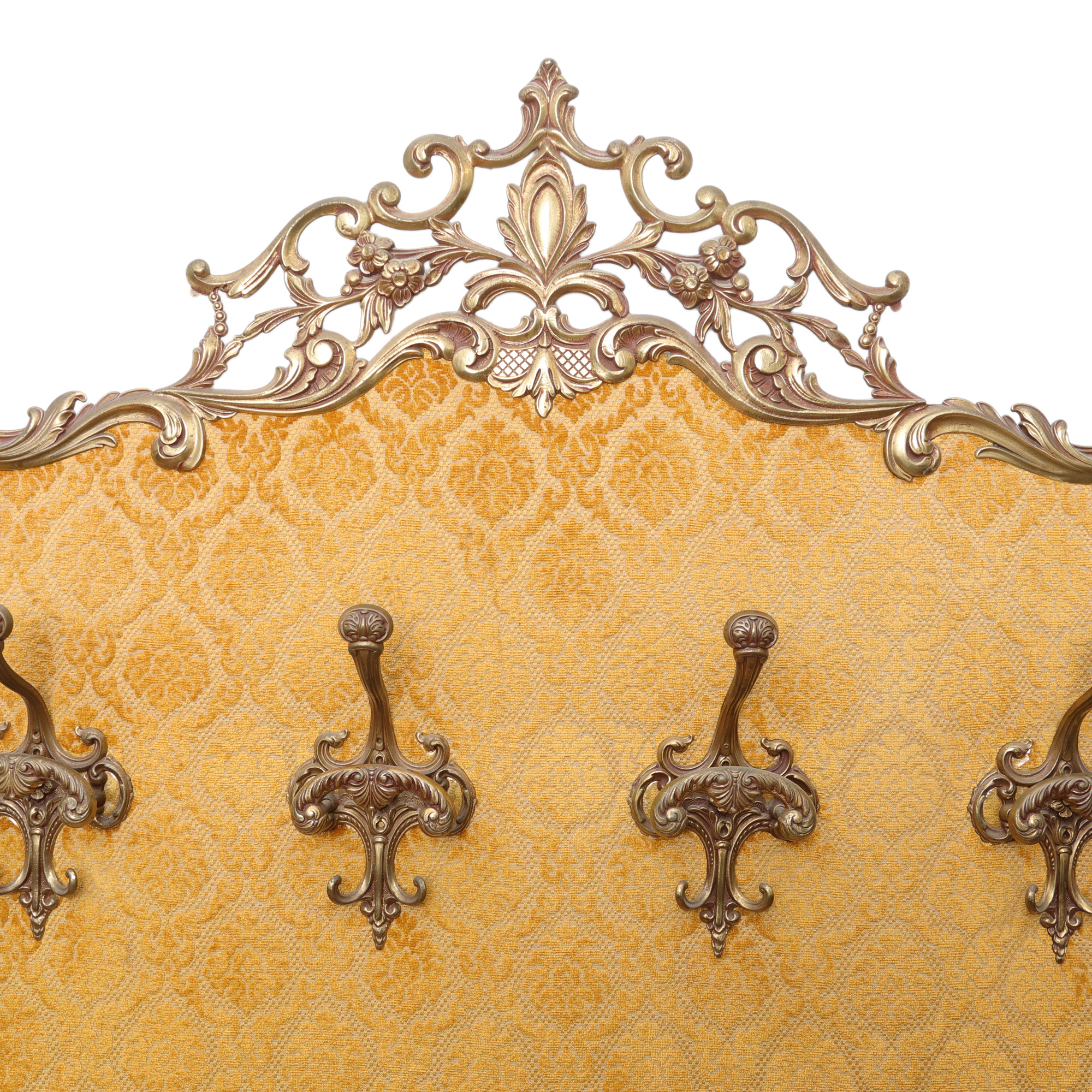 Cuier din bronz, tip panou, cu ramă bogată în stil Neo-Rococo, tapițat cu material textil brocart.