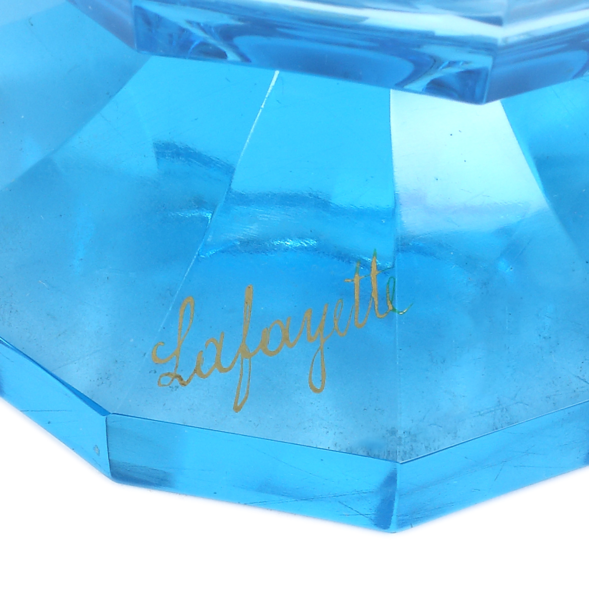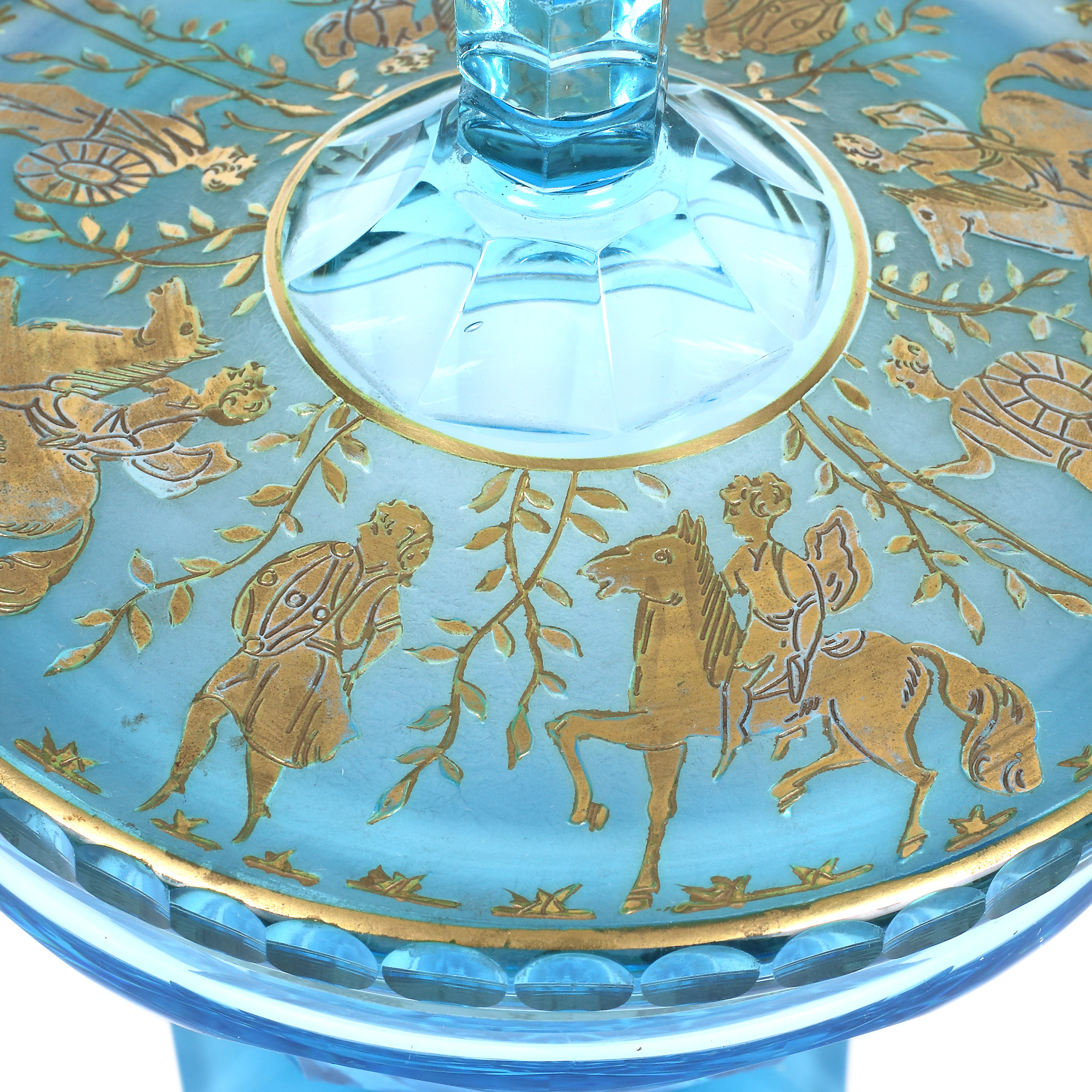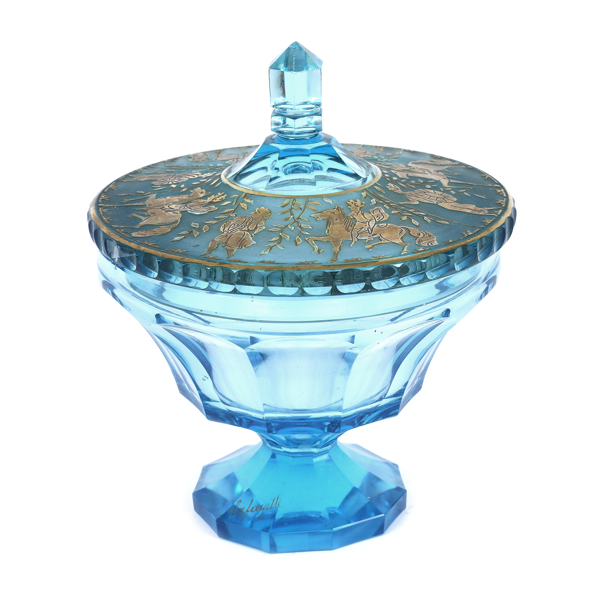 54. Bombonieră Val Saint Lambert cu capac, din cristal fațetat, gravat cu suită de amazoane, cu marca magazinului Lafayette, cca. 1920
