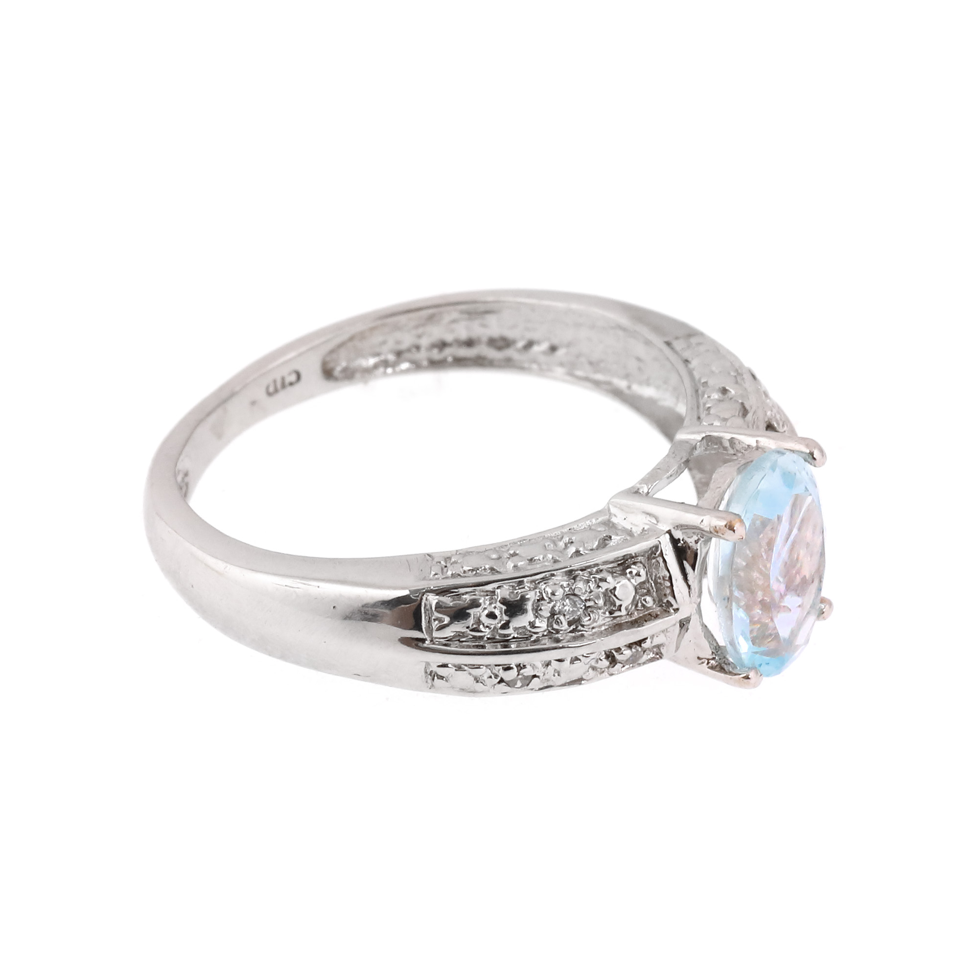 1 acvamarin oval fațetat, culoare bleu, claritate eye-clean, cca. 1,06 ct. și 5 diamante (1 rotund briliant, 4 single cut), culoare H-K, claritate VS2-I1, cca. 0,03 ct.