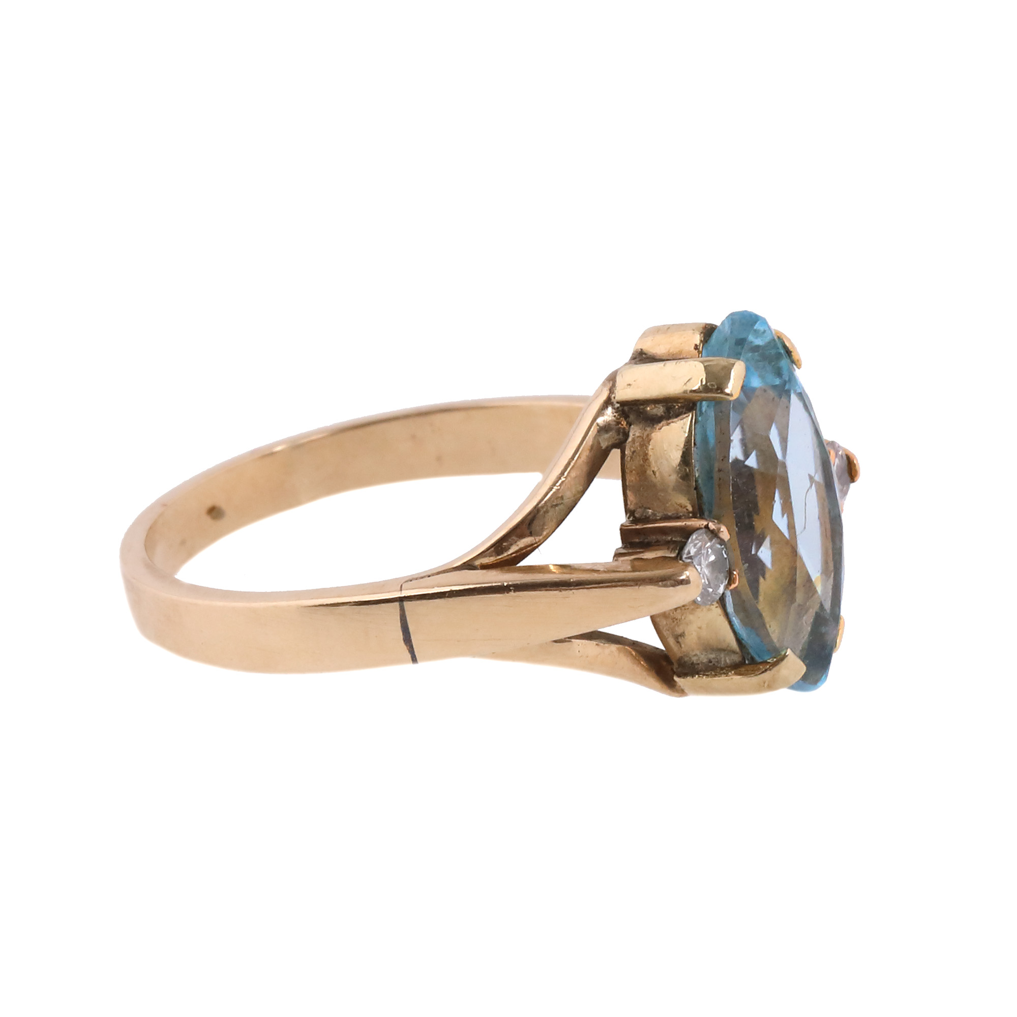 1 topaz marchiz, culoare bleu, claritate eye-clean, cca. 2,40 ct. și 2 diamante rotunde briliant, culoare G,K, claritate SI1-SI2, cca. 0,08 ct.