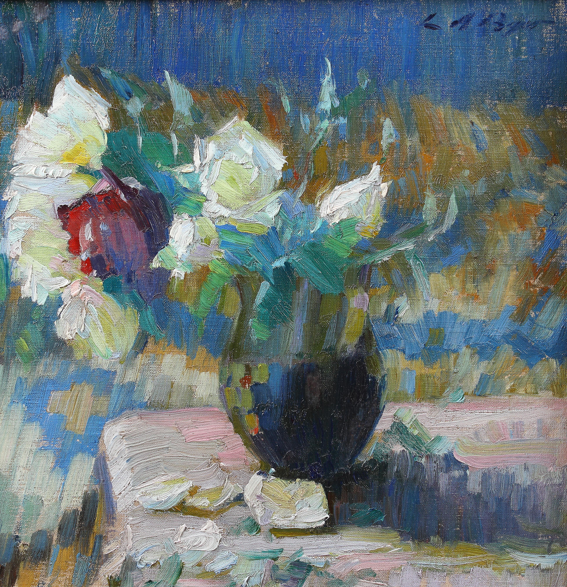 semnat dreapta sus, cu albastru, ”L.A. Biju”