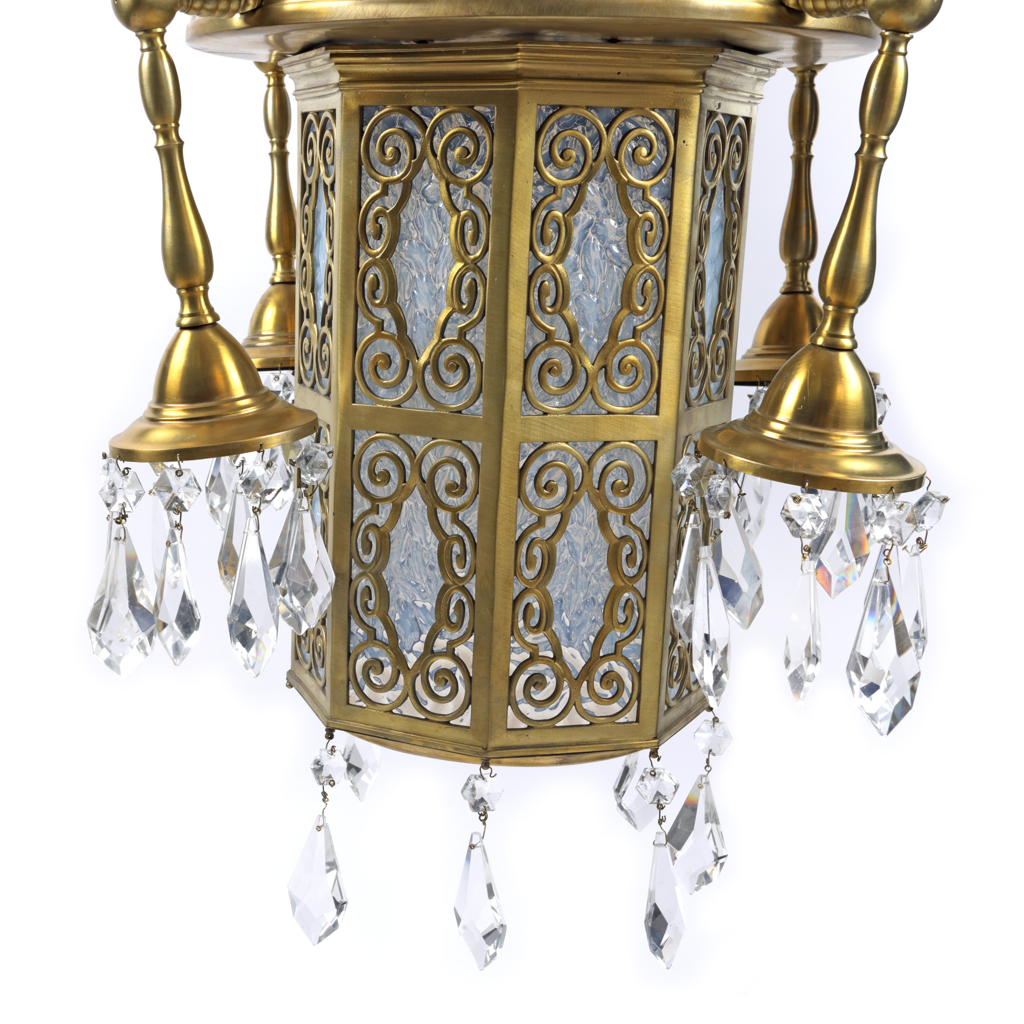 19. Lampadar de inspirație orientală, din bronz și sticlă opalină, ornat cu decorațiuni din cristal, prima jumătate a sec. XX