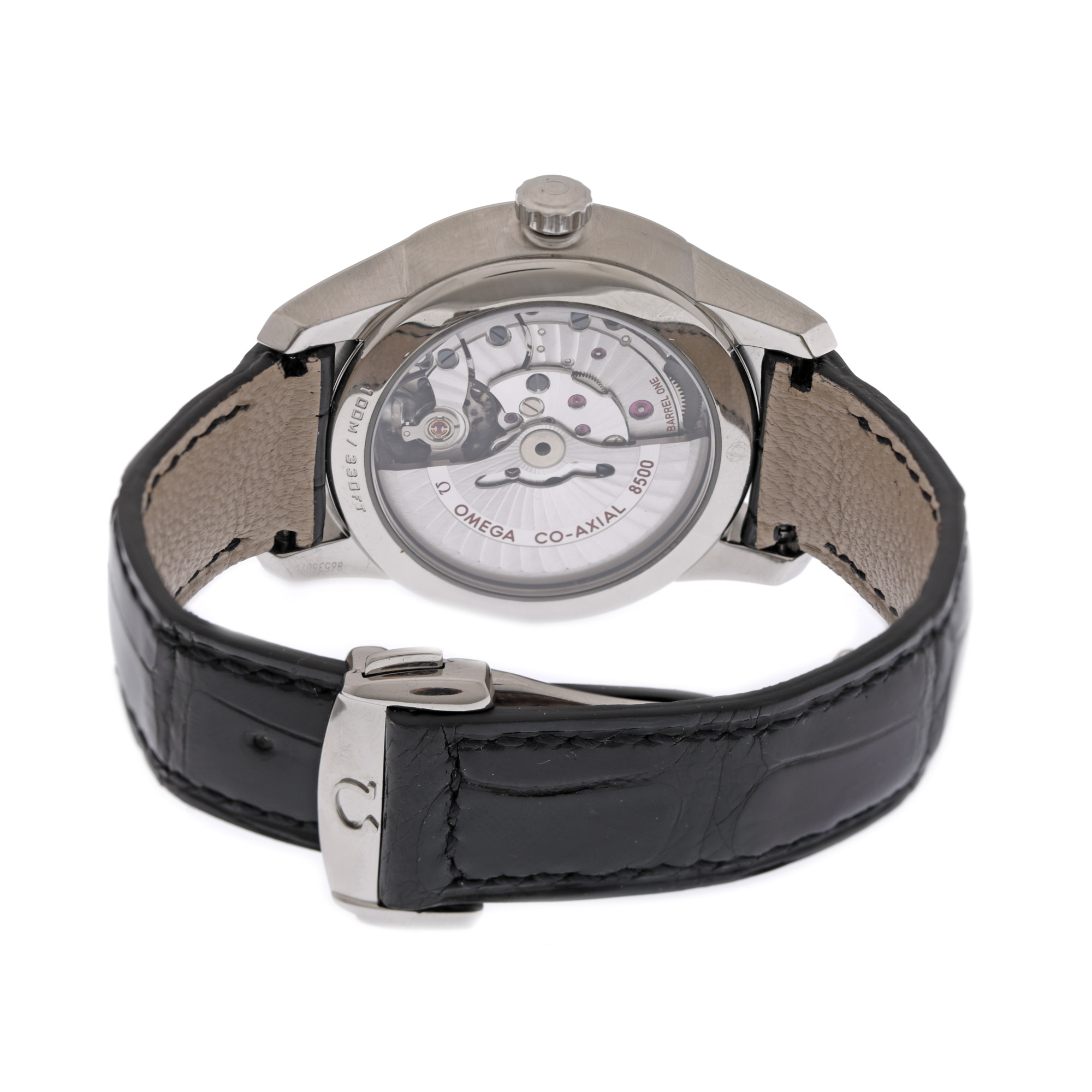 Ceas Omega DeVille Co-Axial, de mână, bărbătesc, referință 431.13.41.22.01.001. Mecanism automatic calibrul 8500, anterior vitrat. Cadran de culoare negru, indici numerale romane, registru pentru dată în dreptul orei 3. Curea adăugată aftermarket, din piele, de culoare neagră, cu sistem de închidere de tip deployant.