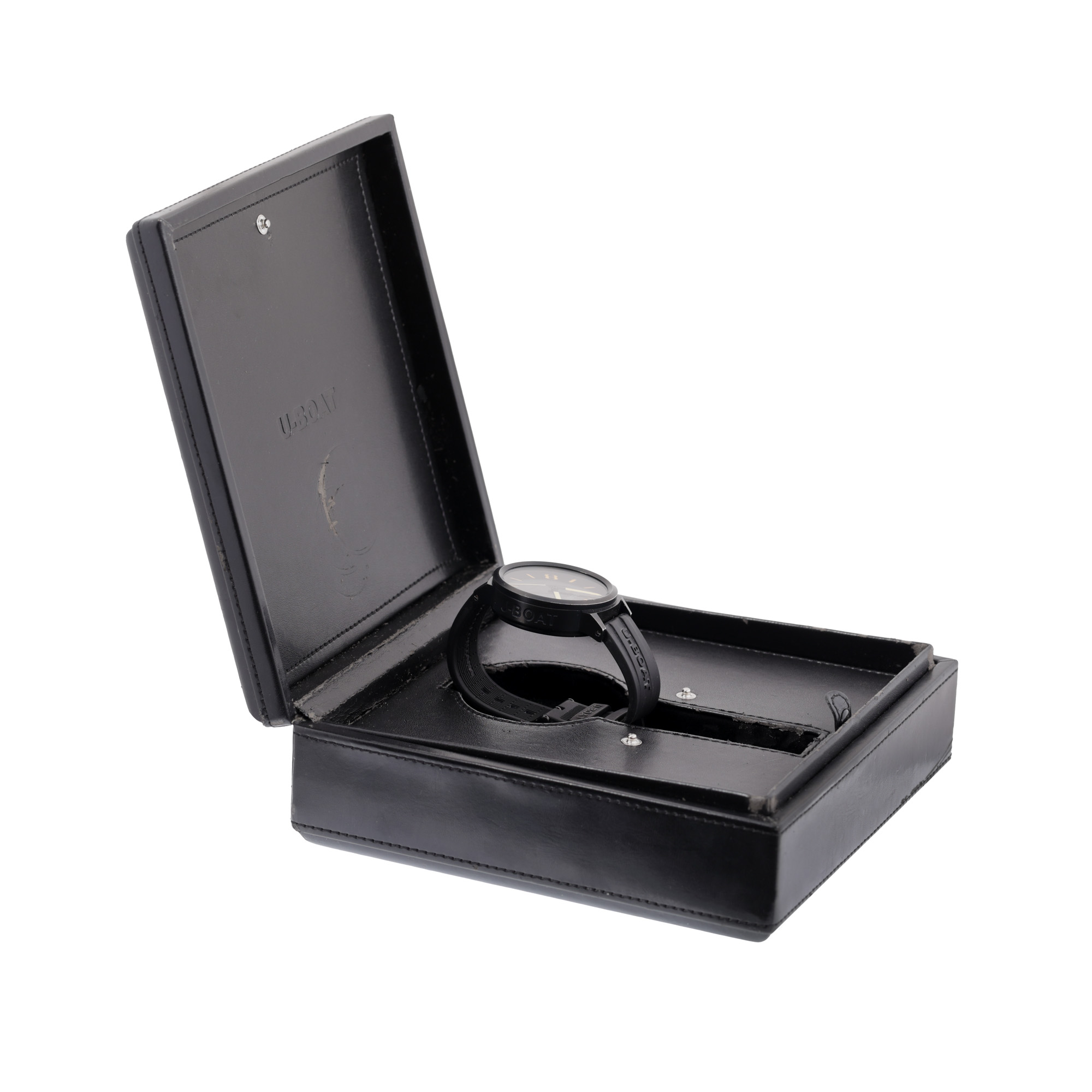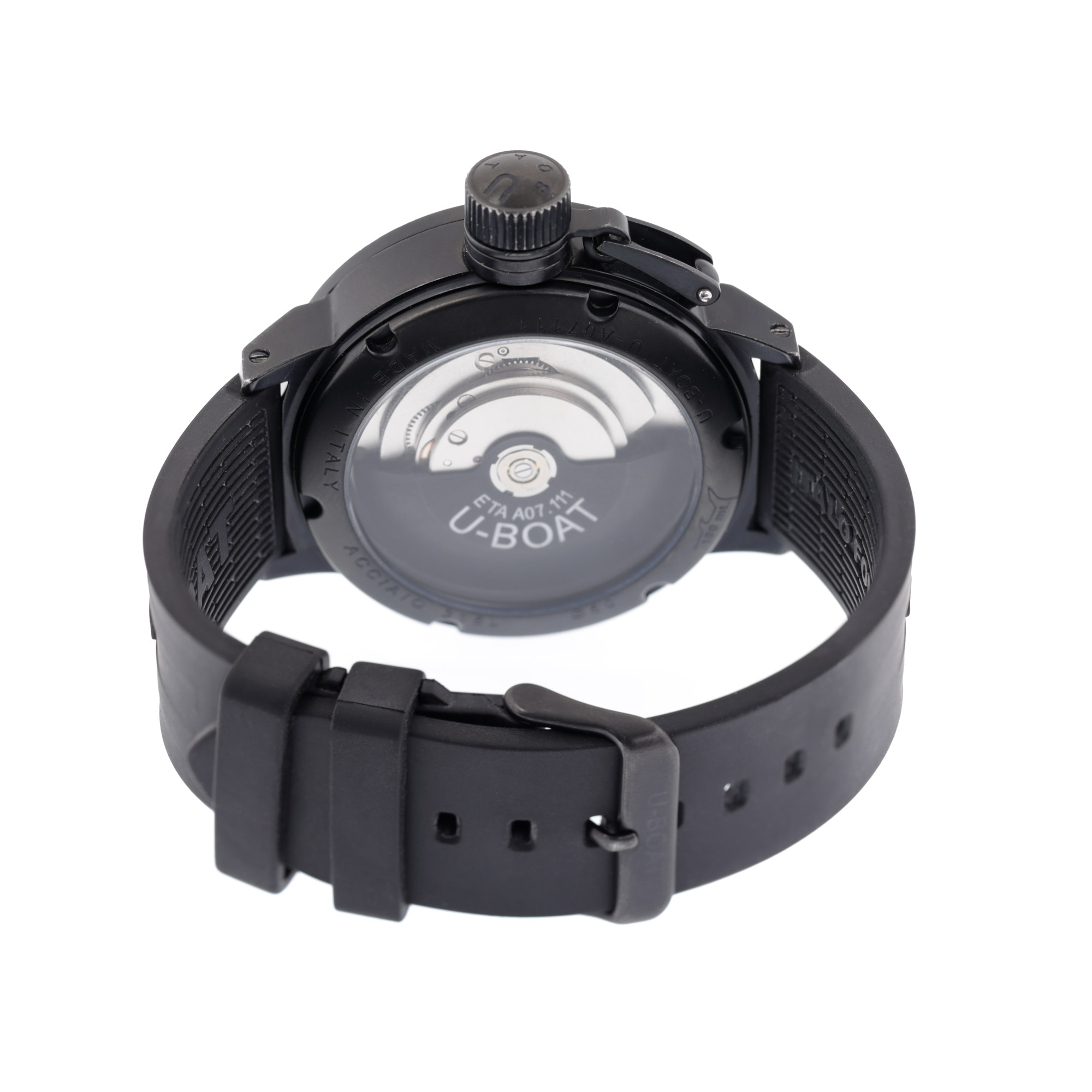 Ceas U-Boat Italo Fontana, de mâna, bărbătesc. Mecanism automatic, calibrul ETA A07.111, anterior vitrat. Cadran de culoare negru, indici numerale arabe pentru orele 4, 8, 12 și baghete pentru restul, registru pentru dată în dreptul orei 3. Curea originală, din cauciuc, de culoare neagră, cu sistem de închidere clasic. Accesorii: cutia originală, curea de schimb originală, din piele.