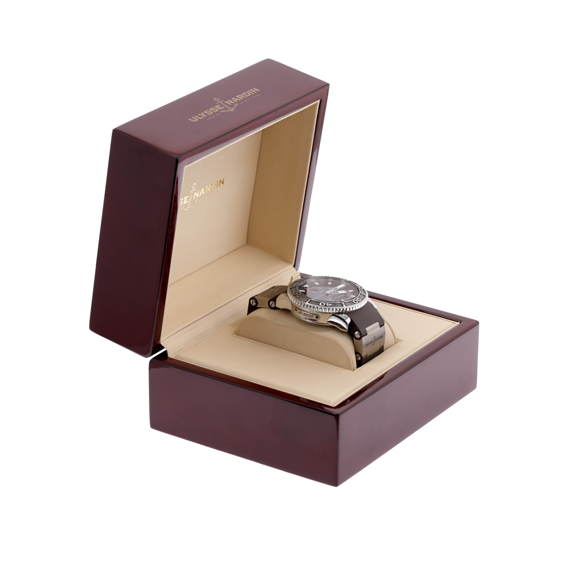 Ceas Ulysse Nardin Maxi Marine Diver, de mână, bărbătesc, referință 263-33. Mecanism automatic, calibrul UN-26. Cadran de culoare burgundy, indici baghetă, cu un registru pentru afișajul autonomiei în dreptul orei 12 și două registre în dreptul orei 6, pentru secundar respectiv pentru dată. Curea originală din cauciuc, de culoare maro, cu sistem de închidere de tip deployant. Accesorii: cutia originală și card de garanție.