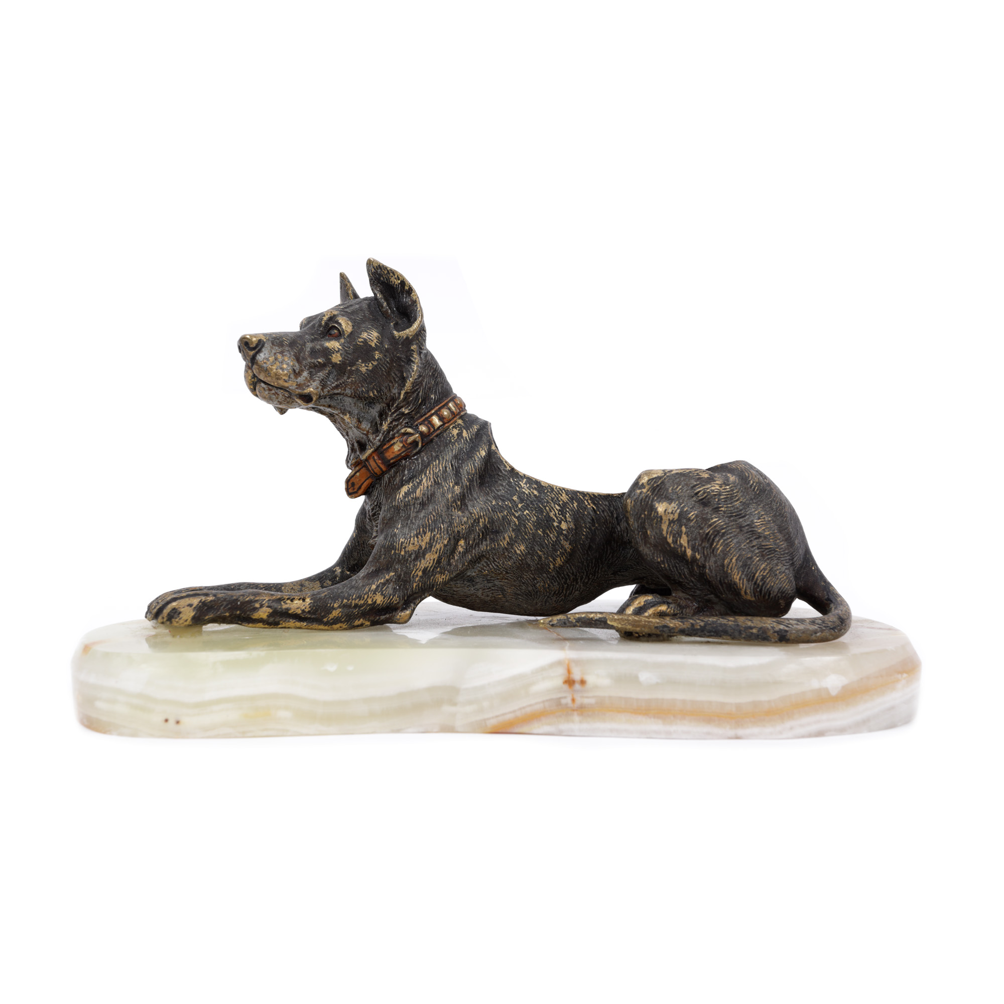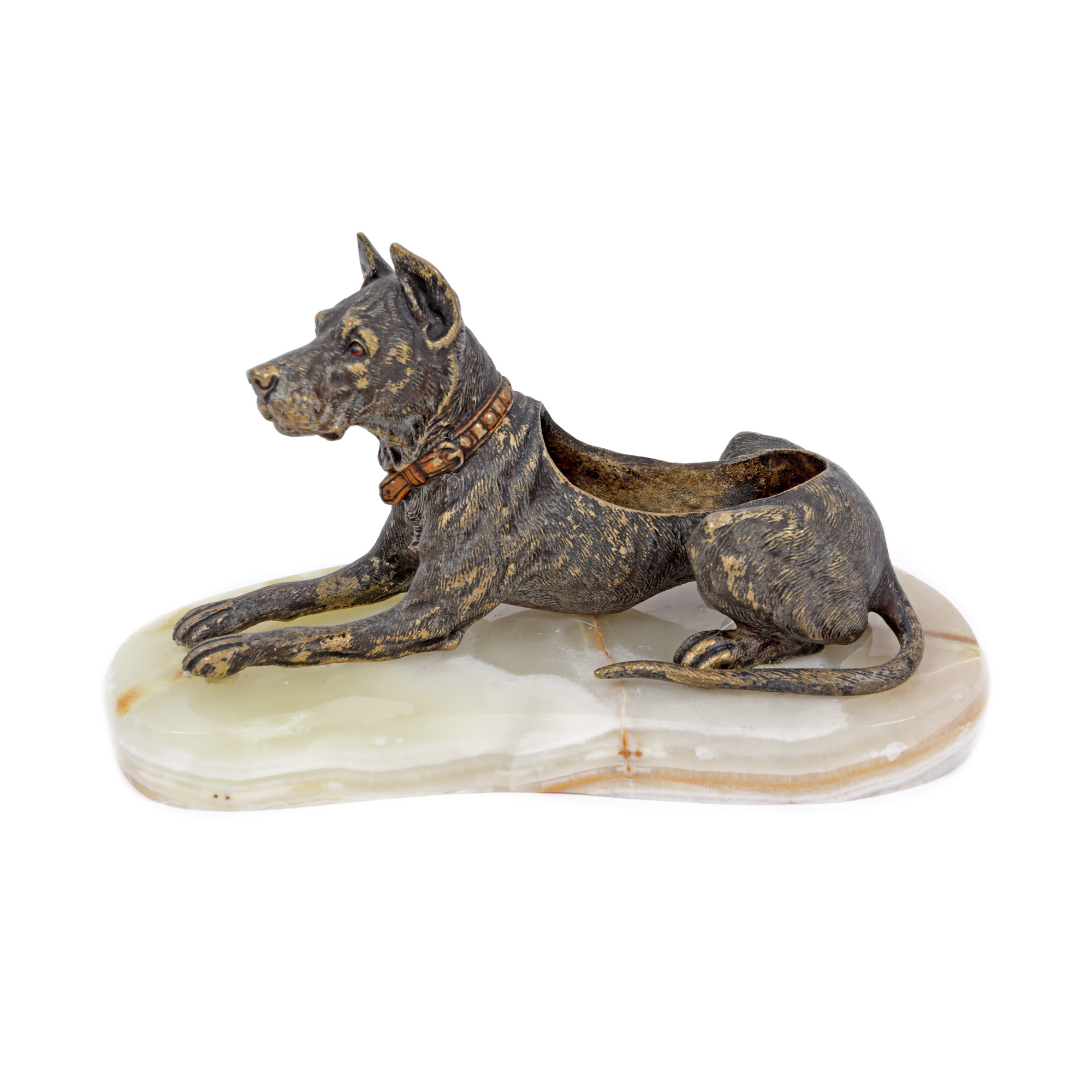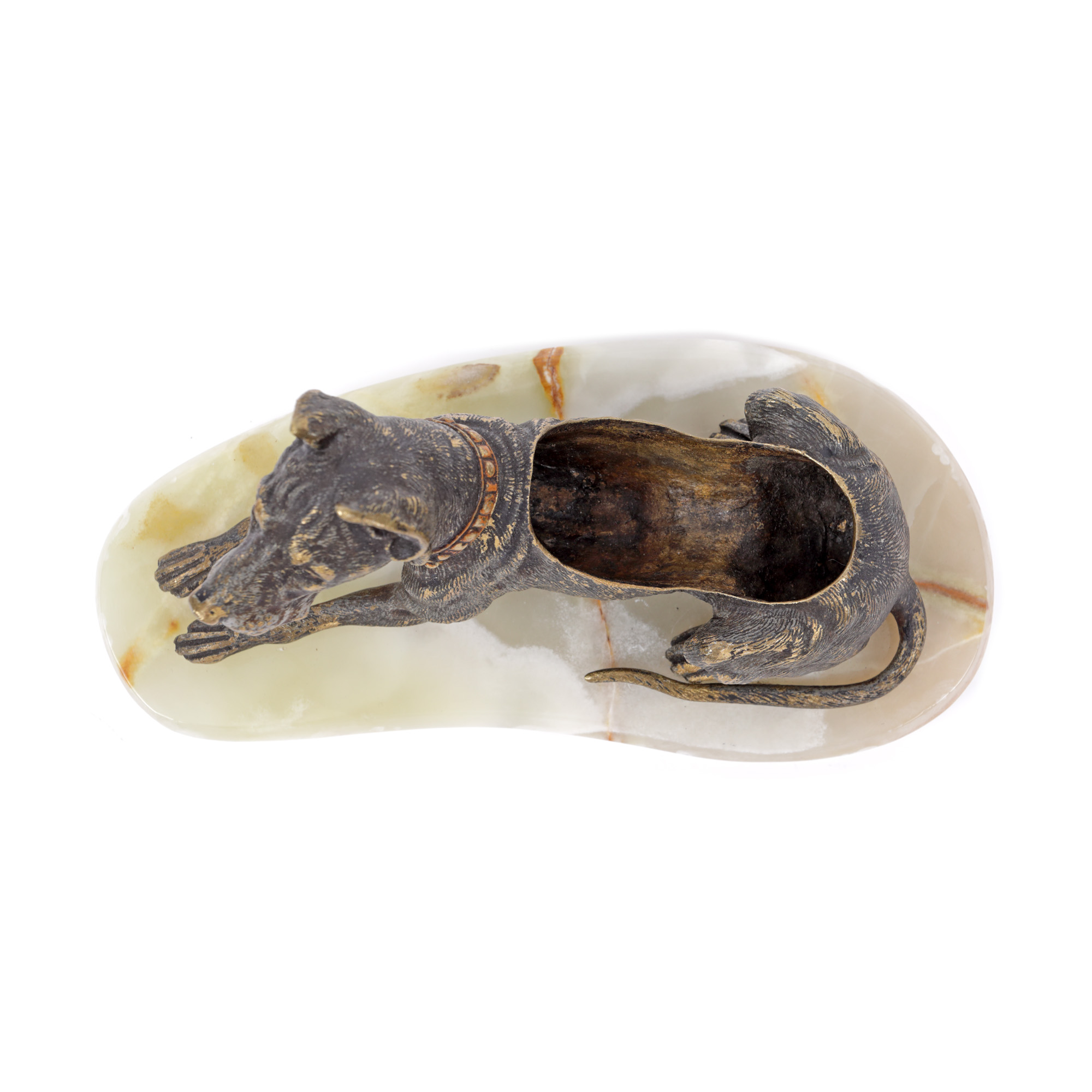 24. Scrumieră pentru trabuc, din bronz și onix, reprezentând un câine de vânătoare, prima jumătate a sec. XX