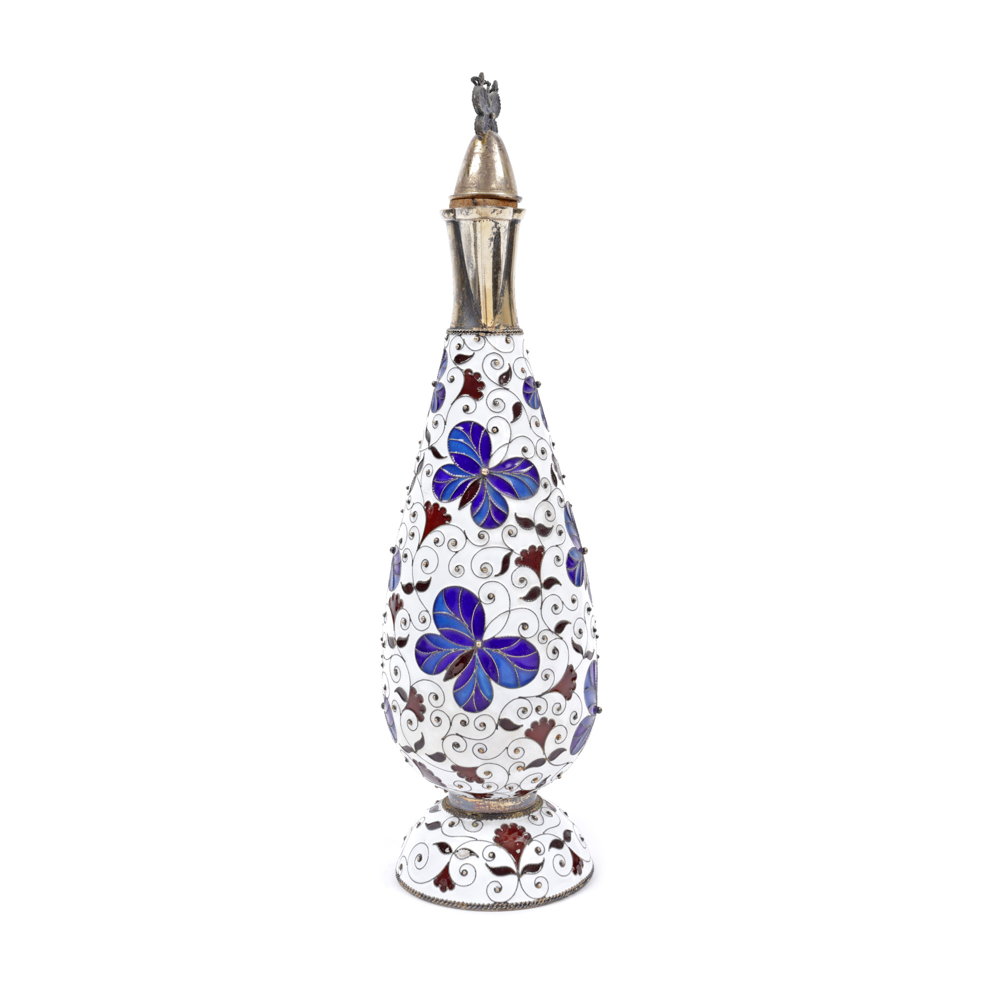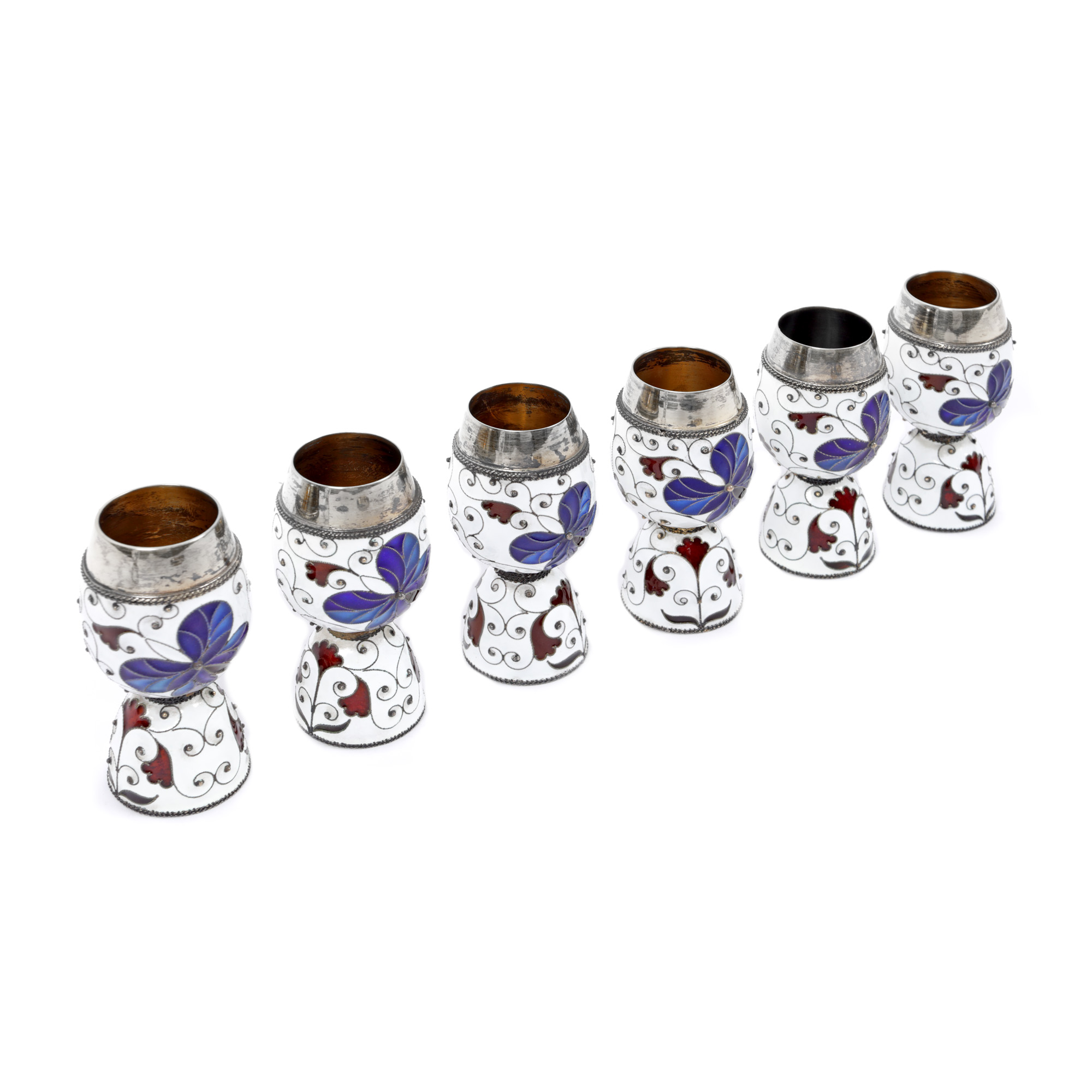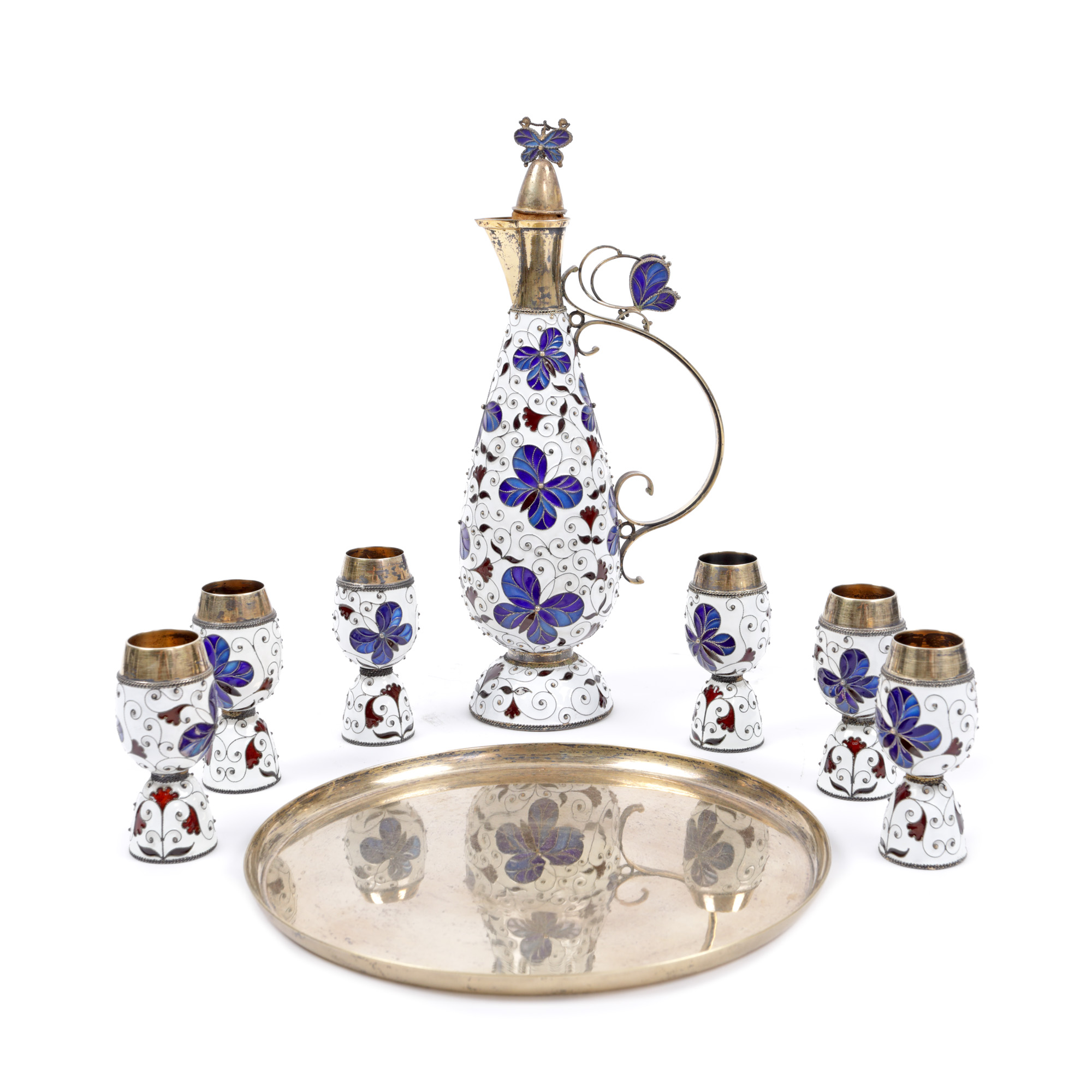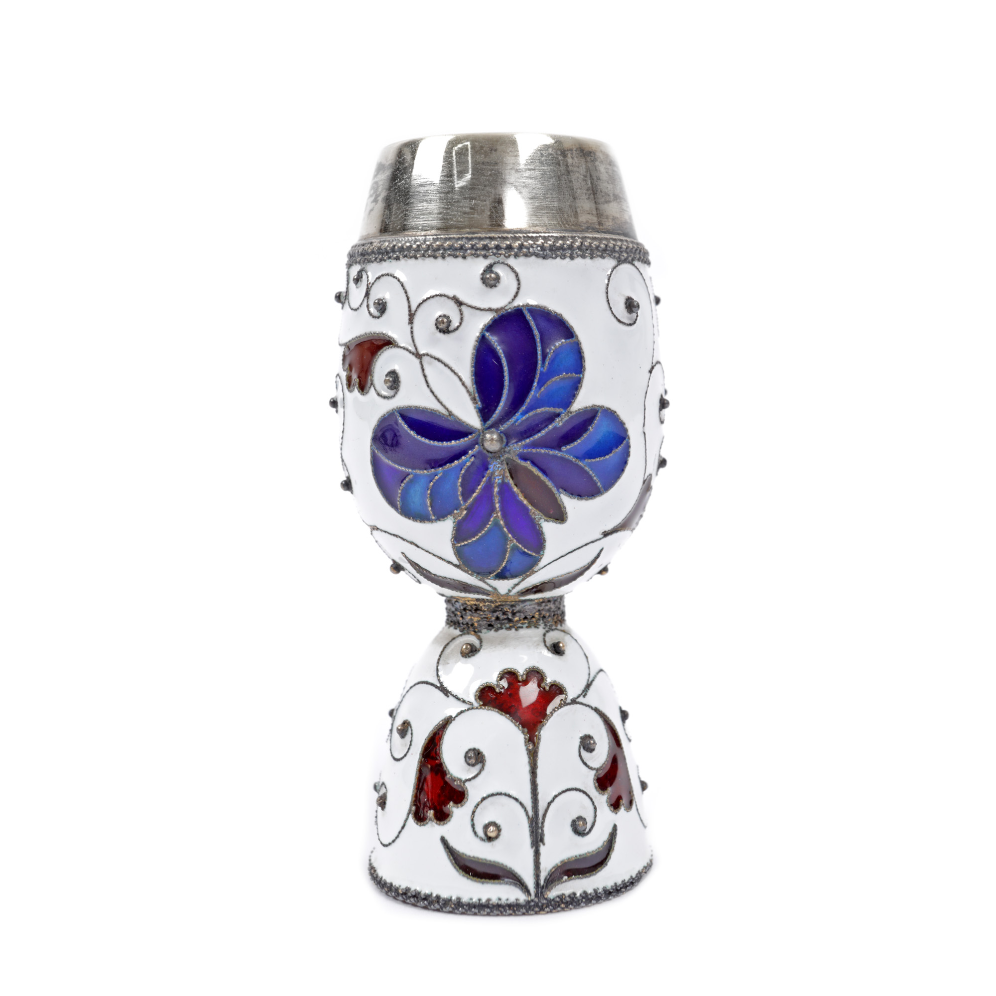7. Set rusesc de ceai, din argint traforat, minuțios decorat cu email în tehnică cloisonné, pentru șase persoane, cadou de protocol primit de Nicolae Ceaușescu de la Mihail Gorbaciov în timpul vizitei oficiale a acestuia în România, 1987, însoțit de certificat R.A.A.P.P.S.